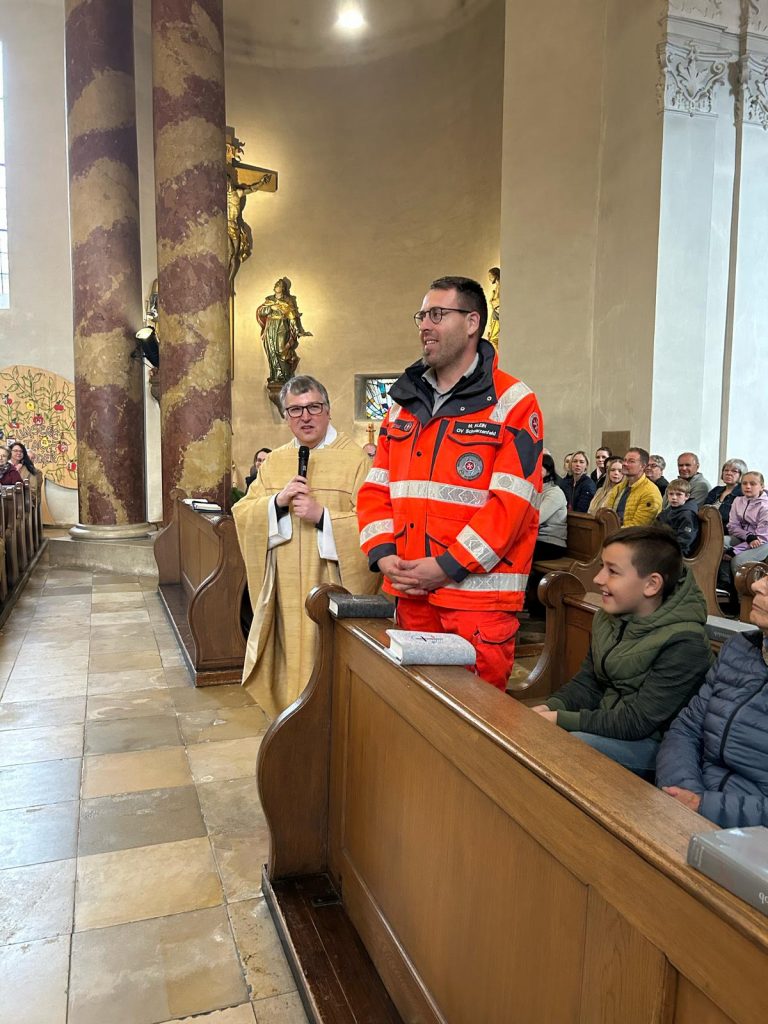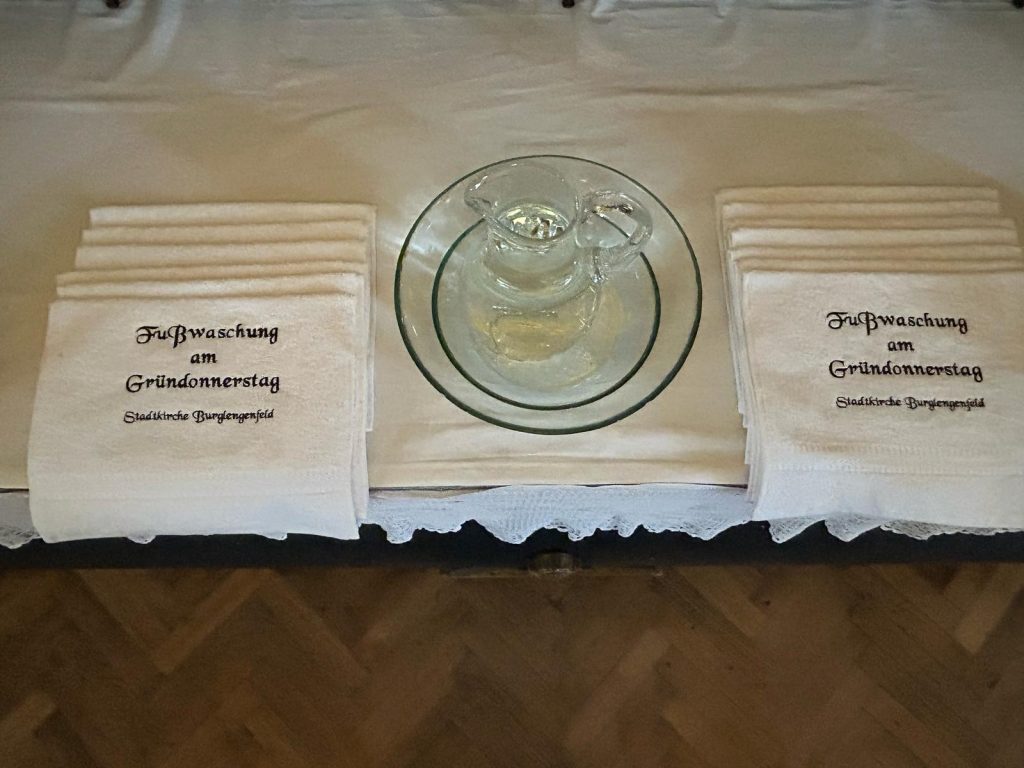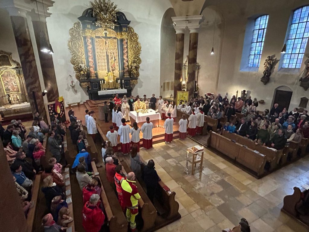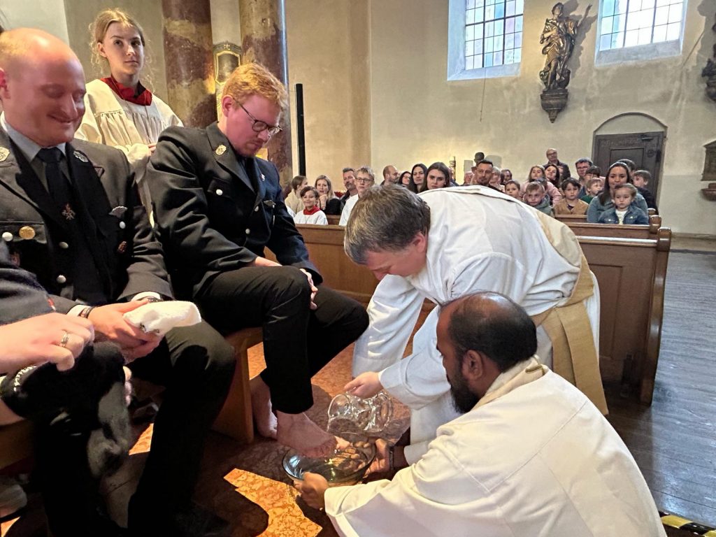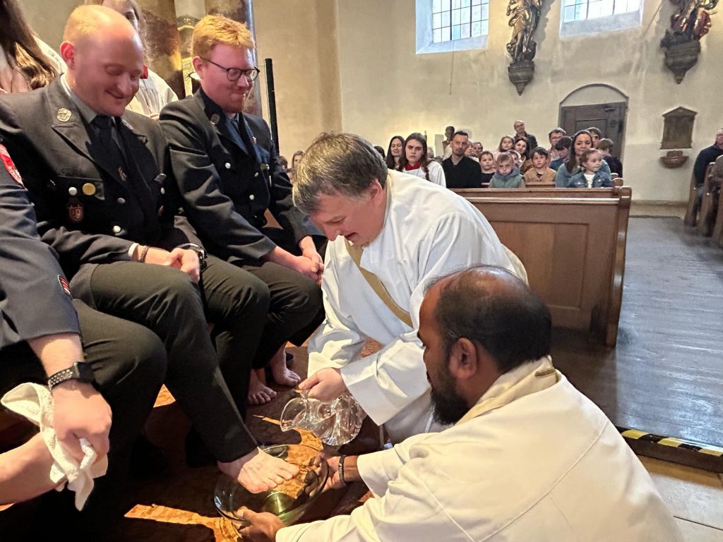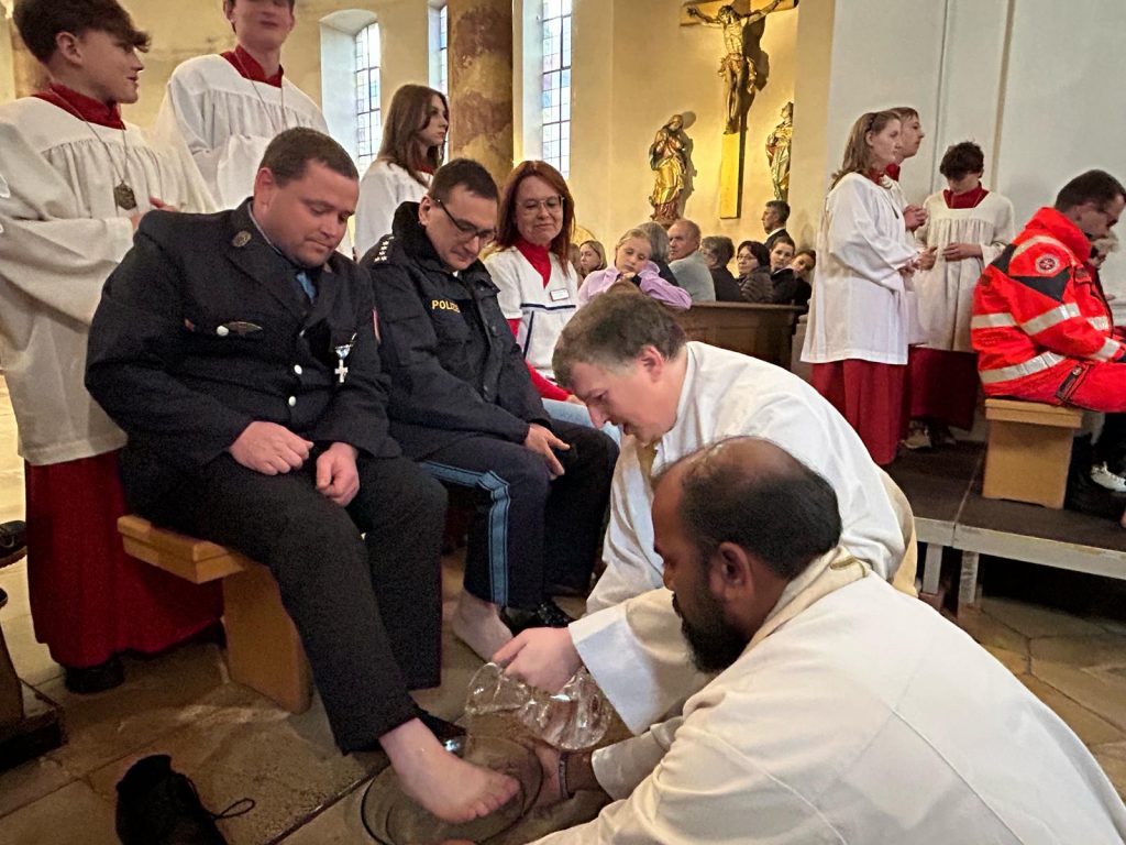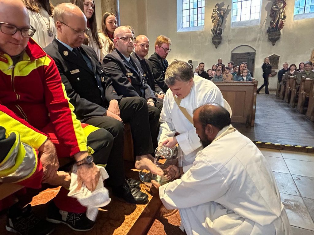 Aber Jesus hat im Abendmahlssaal einen zweiten Gottes-Dienst gestiftet. Es ist der Liebesdienst an den Mitmenschen. Jesus wäscht beim Letzten Abendmahl seinen Jüngern die Füße, was damals ein Sklavendienst war. Und er trägt ihnen auf, dass sie in Liebe einander dienen sollen. Der Liebesdienst am Nächsten ist deshalb auch eine Form von Gottes-Dienst, wie Dekan Michael Hirmer in seiner Predigt recht plastisch darstellte, in dem er aktiv Feuerwehrleute, Polizisten, Pflege- und Rettungsdienste mit einband. „Durch helfende und dienende Hände wird Christus lebendig in unserer Zeit.“