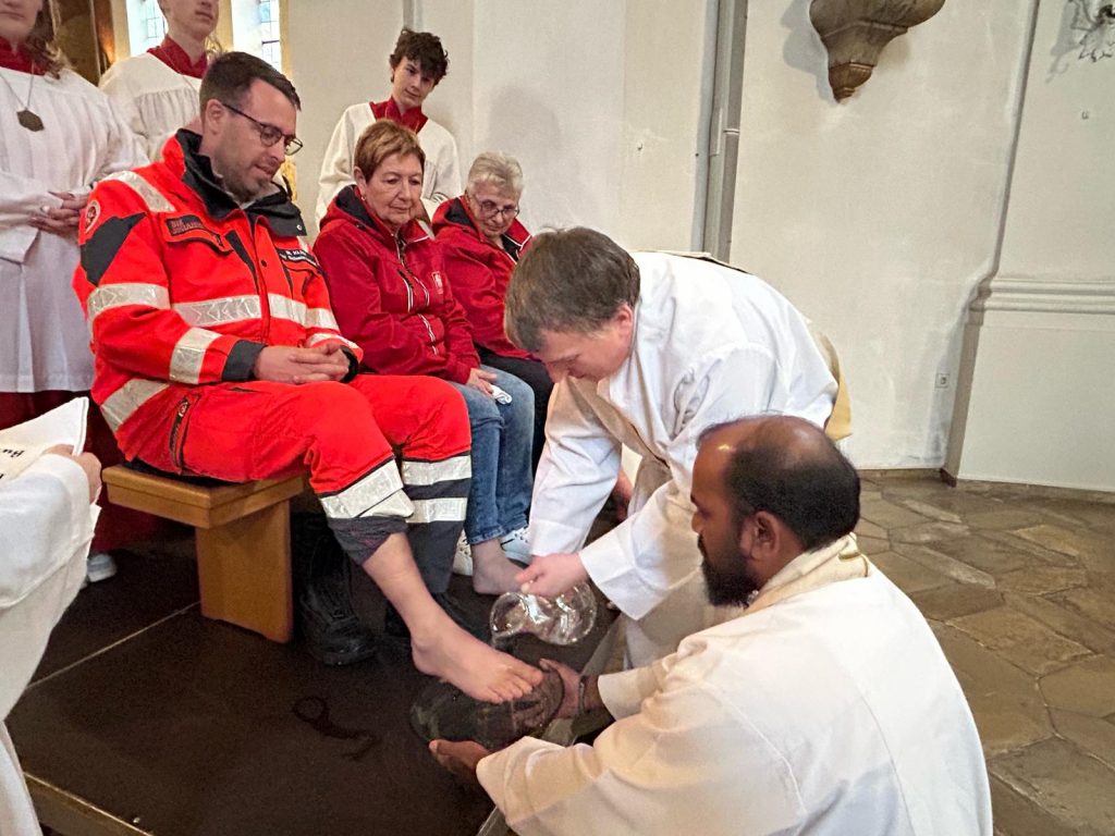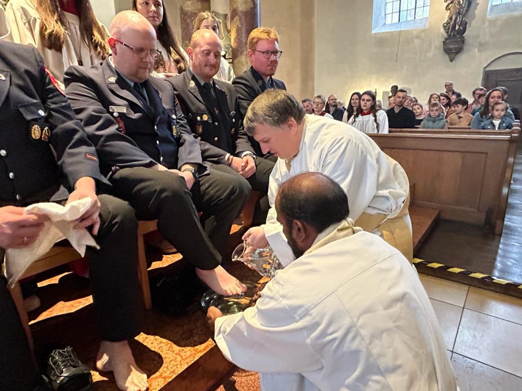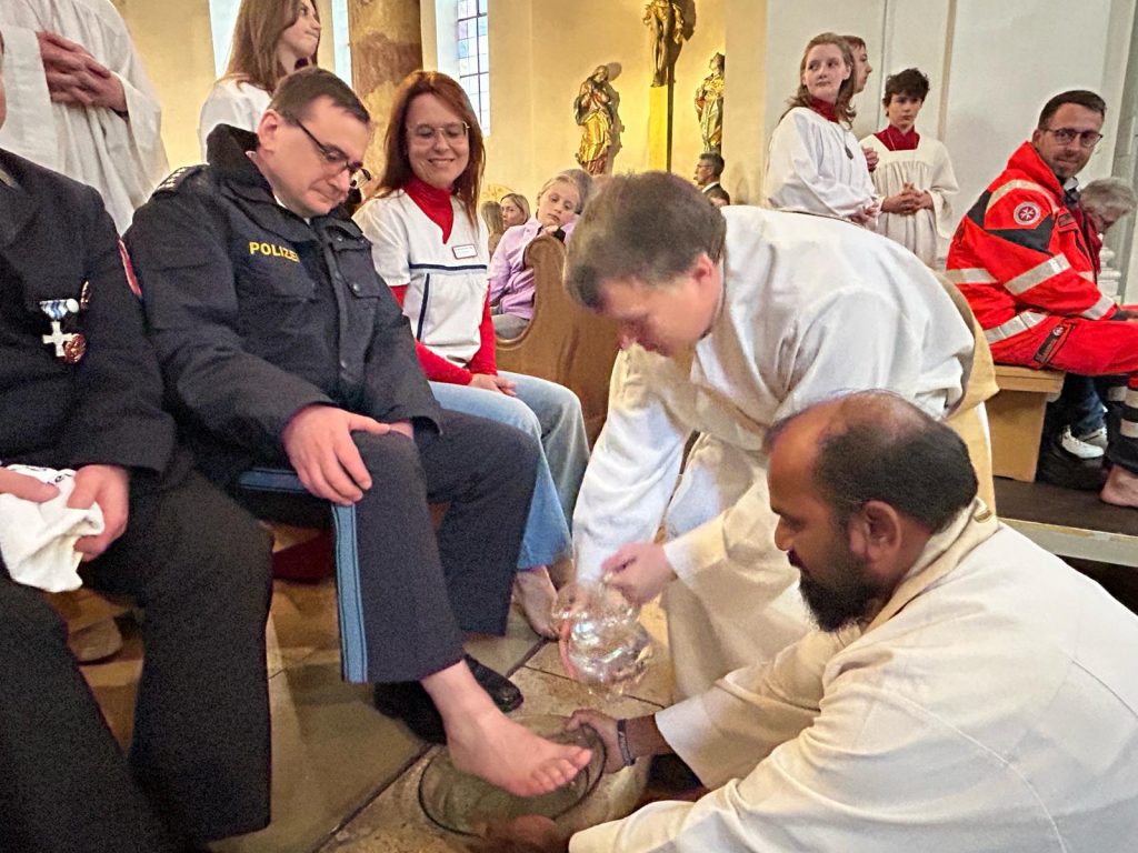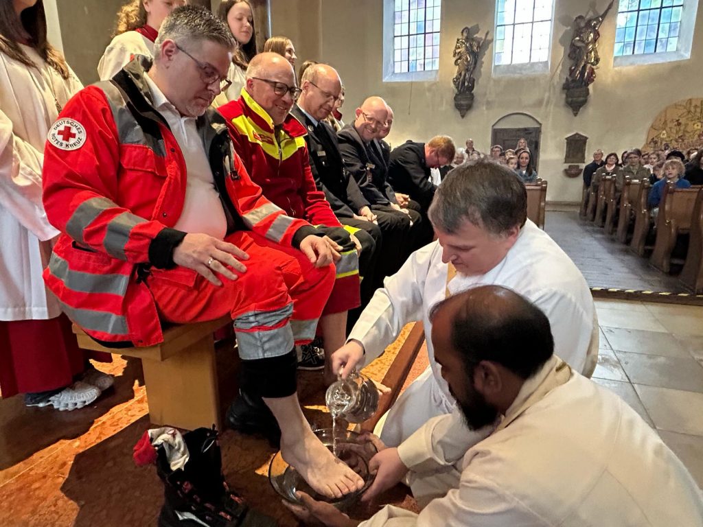 Seine Predigt unterstrich der Dekan mit dem alten Ritus der Fußwaschung. In diesem Jahr waren die 12 Apostel Feuerwehrmänner, Notärzte, Polizisten, Rettungskräfte, Mitarbeiter des Kriseninterventionsteam, eine Pflegedienstleiterin und Schwestern der Caritas Pflegestation.