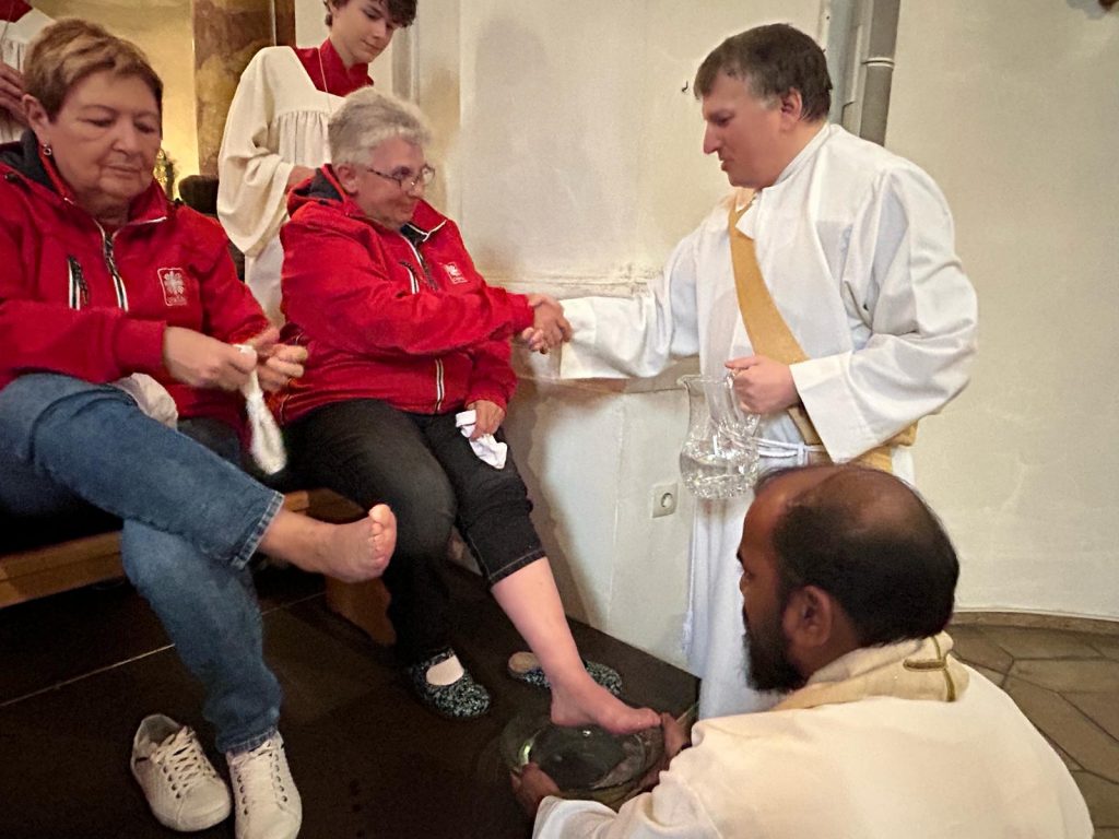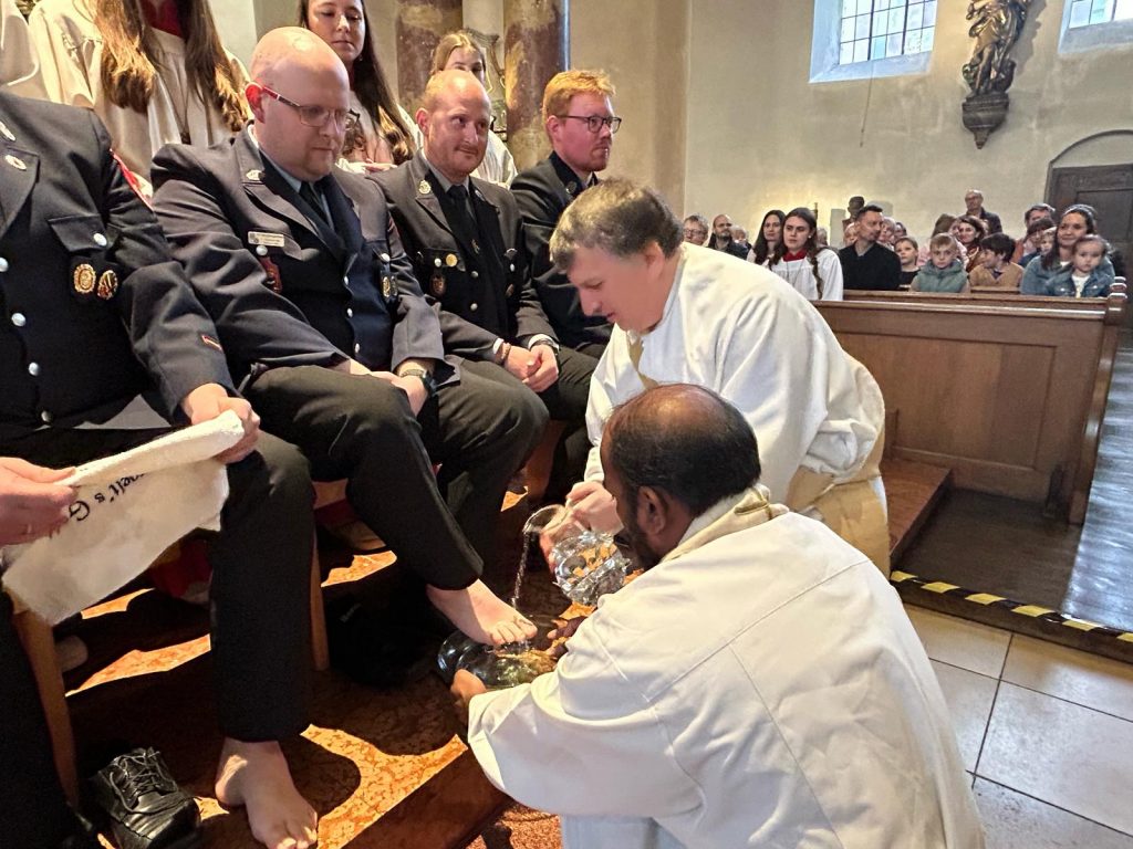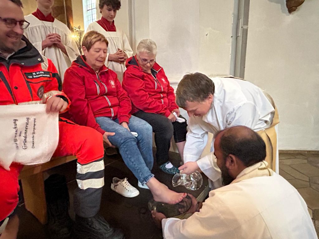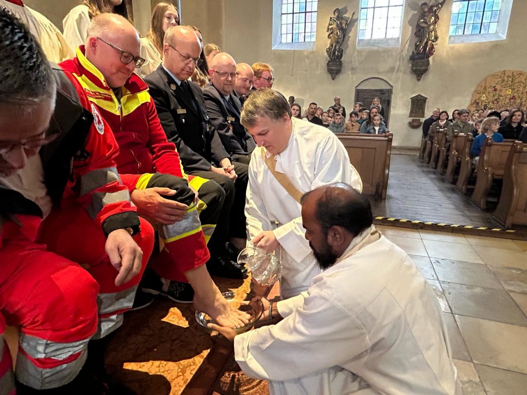 Seine Predigt unterstrich der Dekan mit dem alten Ritus der Fußwaschung. In diesem Jahr waren die 12 Apostel Feuerwehrmänner, Notärzte, Polizisten, Rettungskräfte, Mitarbeiter des Kriseninterventionsteam, eine Pflegedienstleiterin und Schwestern der Caritas Pflegestation.
