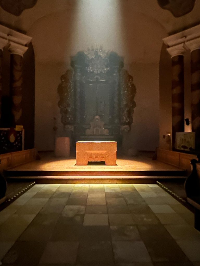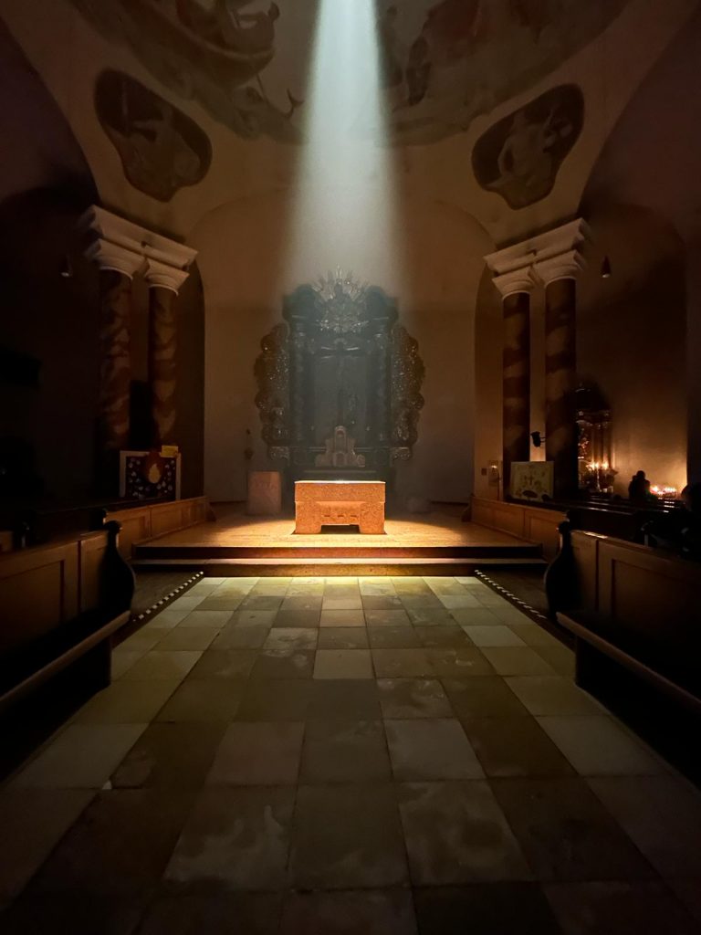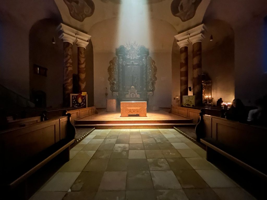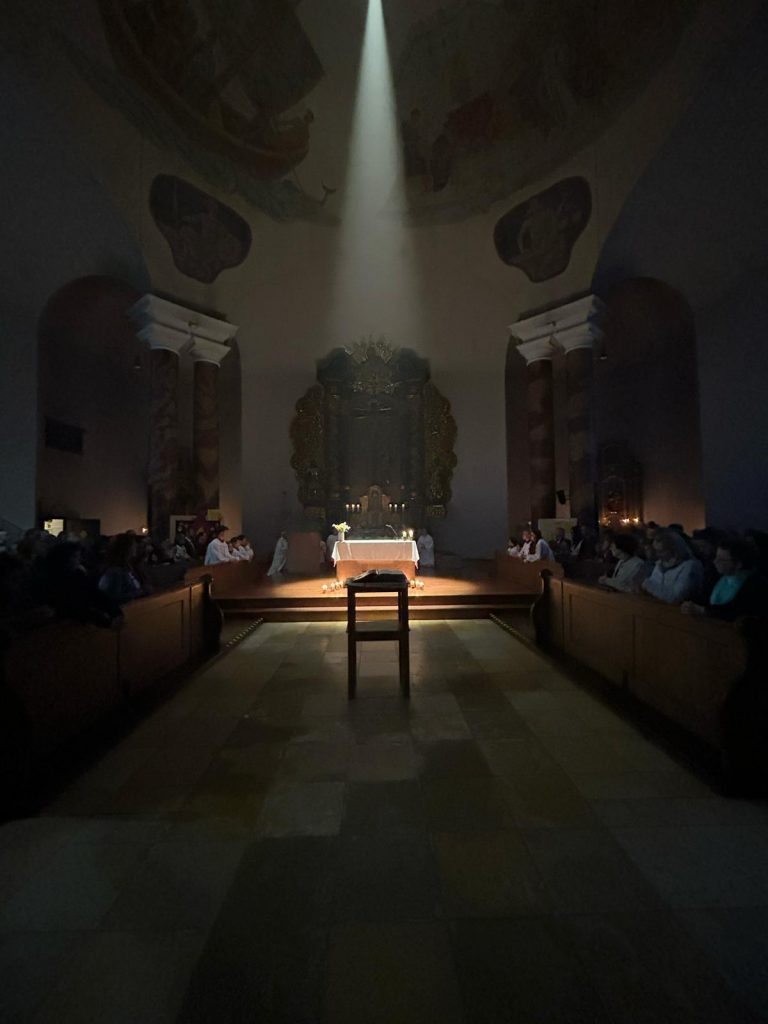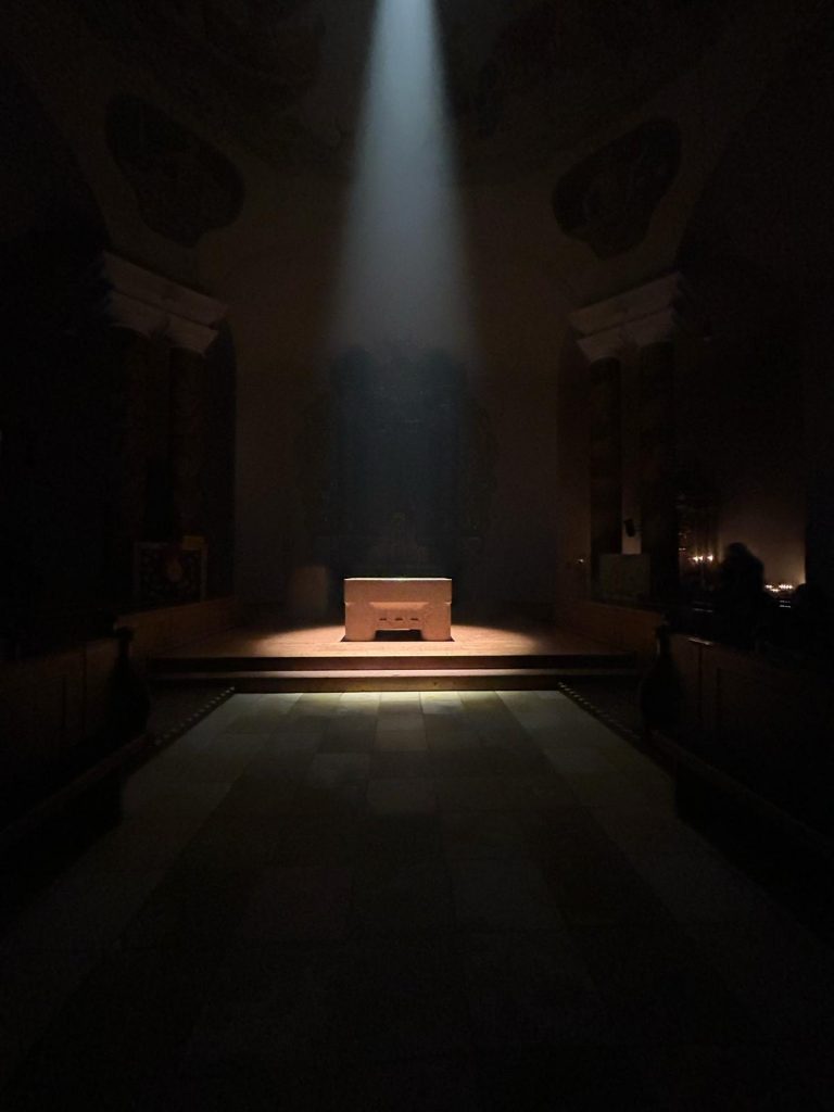 Jesus betet voller Angst am Ölberg und wird von einem seiner Jünger verraten. Der leere Altar der Vituskirche, beleuchtet nur durch einen Spot von oben, wirkte mystisch, als die Gebetsstunden begannen.