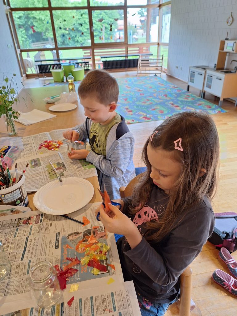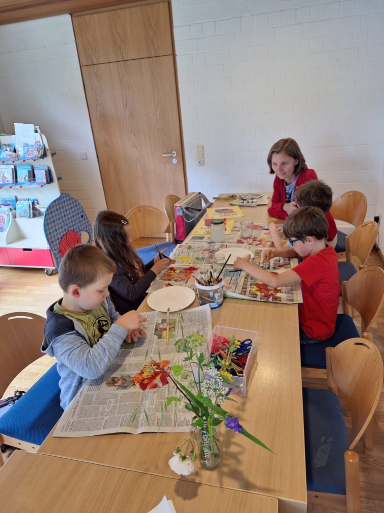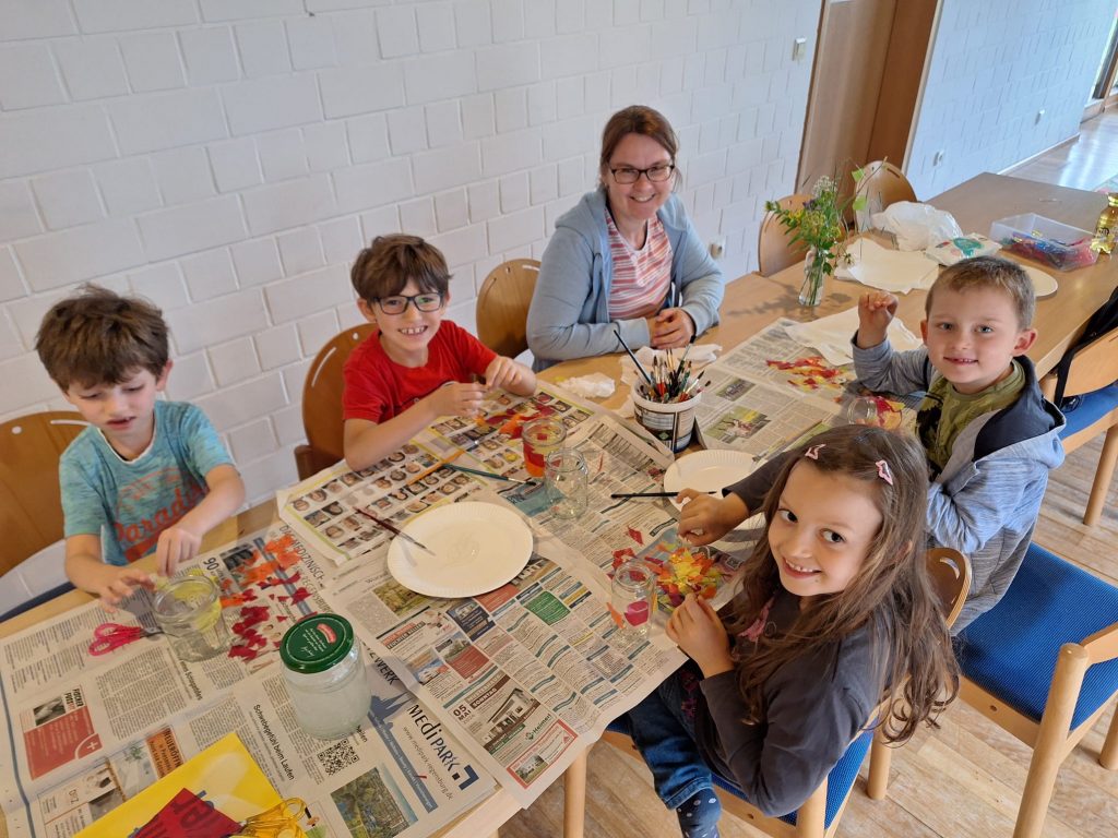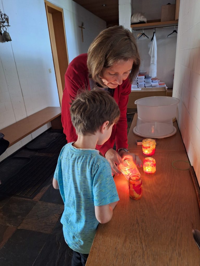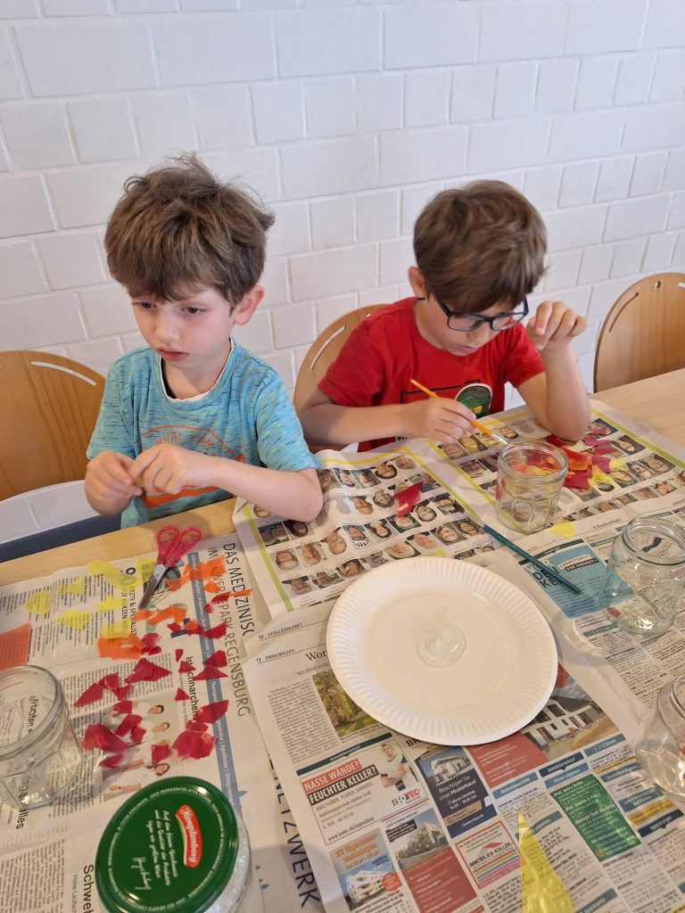 Das Leben von Johannes dem Täufer war Thema von B&B im Juni. Die Kinder hörten die biblischen Erzählungen anhand des Kamishibai-Theaters. Danach bastelte jeder ein kleines Johannesfeuer. Alle waren mit Freude und Eifer dabei.
