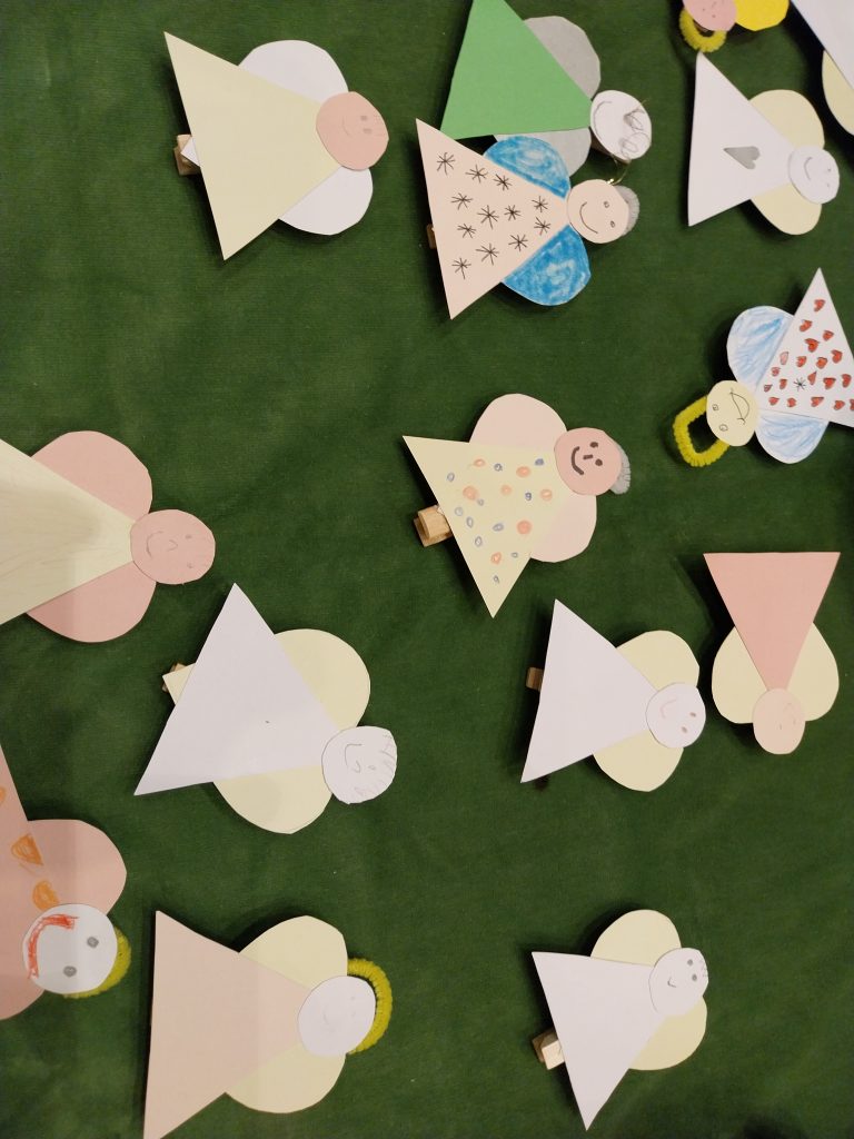 Betlehem ist nicht erst durch die Geburt Christi bekannt. Schon im Alten Testament war es ein besonderer Ort: der kleine Hirtenjunge David, der jüngste Sohn des Isai, ist in Bethlehem zu Hause und wird dort von Samuel zum künftigen König von Israel gesalbt: Gott hat ihn erwählt. Gott schaut nicht auf das Äußere, sondern auf das Herz des Menschen. – Dieser biblischen Erzählung lauschten die Kinder gespannt. Danach wurden Engel gebastelt für die Bewohner des BRK-Altenheims.