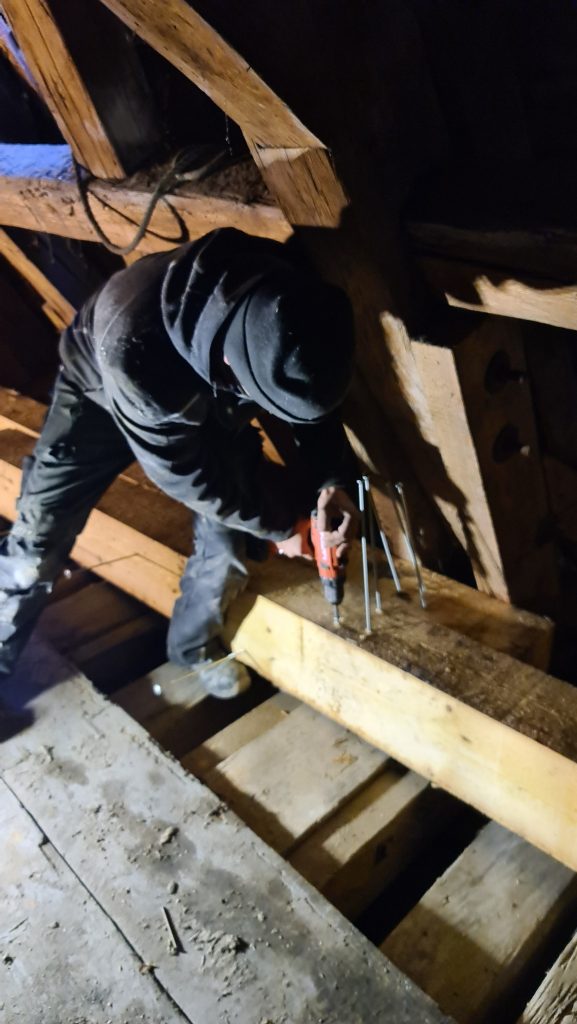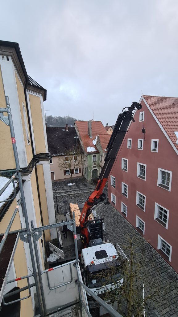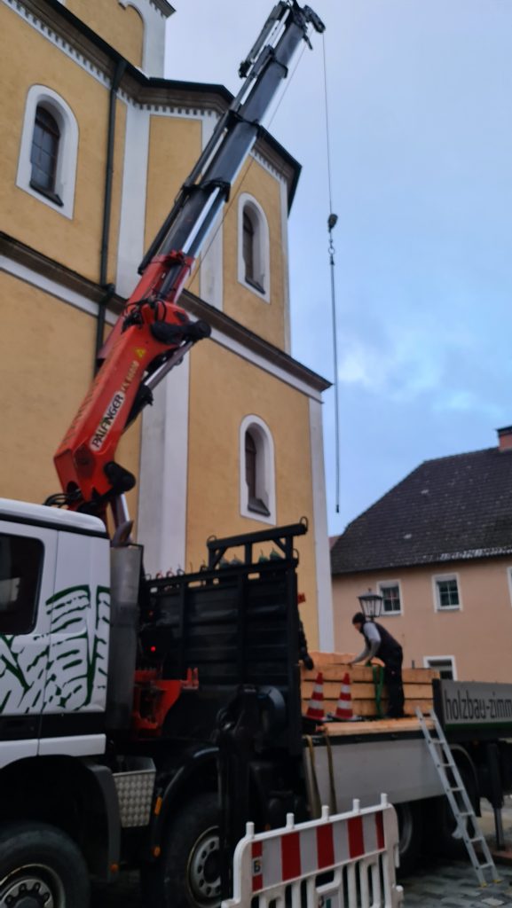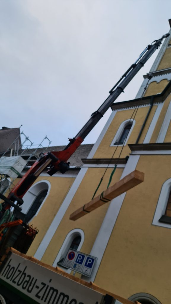 Mitarbeiter der Firma Dannerbeck aus Nittenau öffneten einen Teil des Langhausdaches, um schwere Balken ins Innere des Dachstuhles einbringen zu können. Diese werden benötigt, um die mit viel Stuckornamentik ausgestattete Kirchendecke wieder sicher im Dachstuhl zu verankern. Denn dieser trägt nicht nur das Dach, sondern auch die tonnenschwere Kirchendecke. Dafür muss der Dachstuhl mit Hilfe von Stahlseilen abgesichert werden, so dass die nötige Statik wieder gegeben und das Gewicht der Dach- und Deckenkonstruktion sicher über das Mauerwerk ins Fundament des Gotteshauses abgeleitet werden kann.
