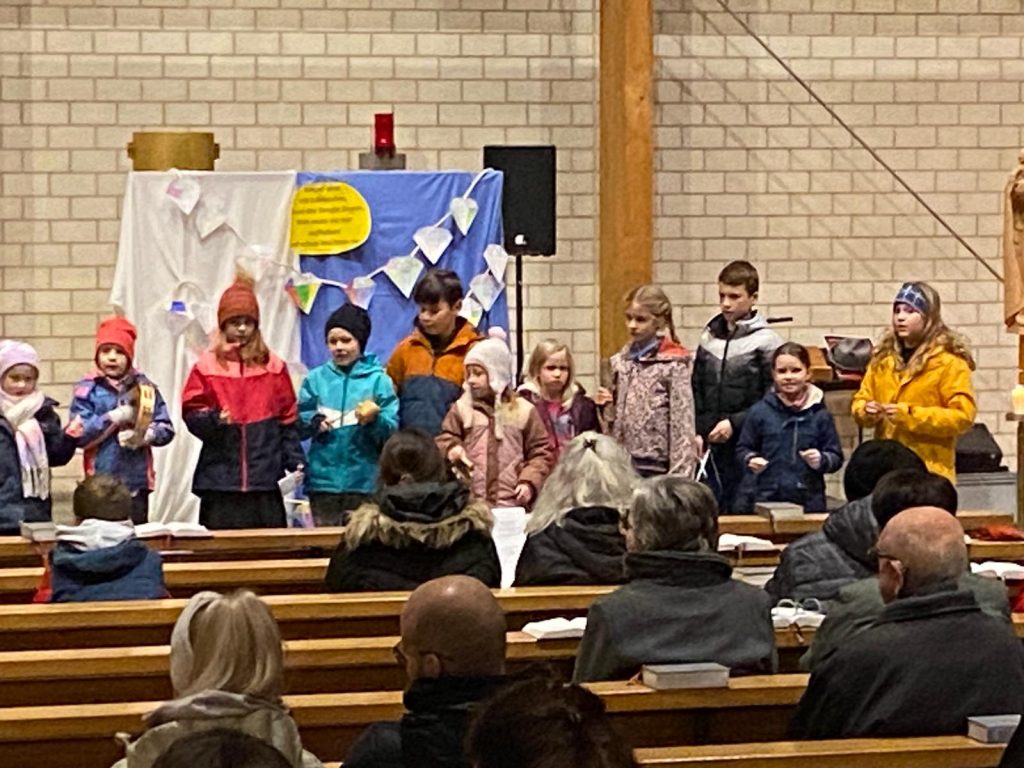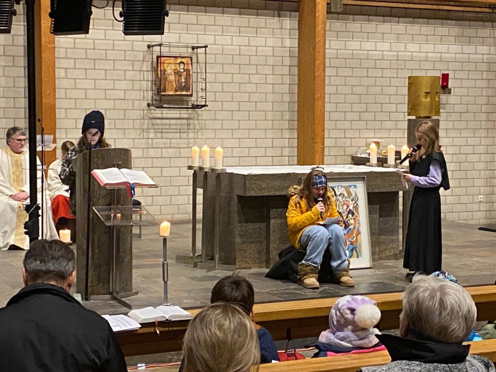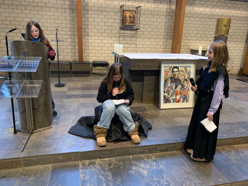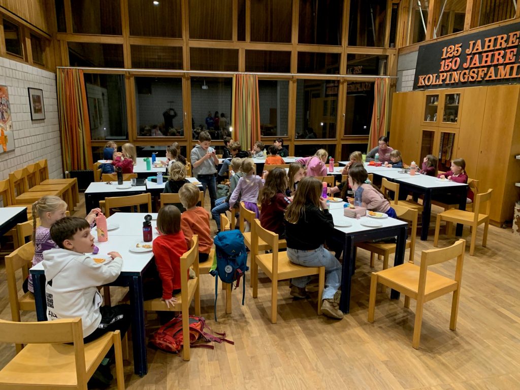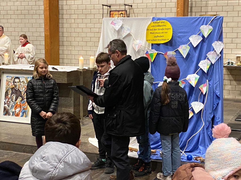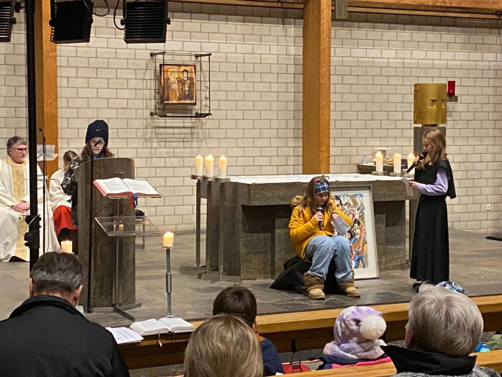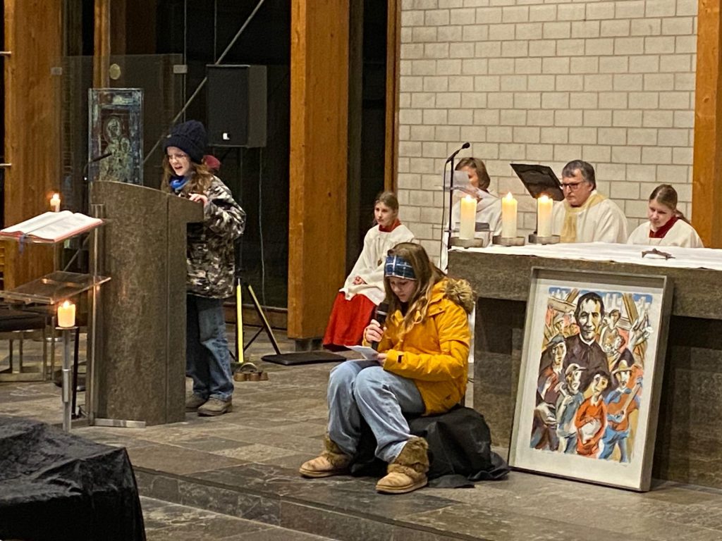 Nach dem kurzweiligen Nachmittag gab es für alle Pizzabrötchen als Stärkung, bevor es miteinander in die Kirche ging. Im Gottesdienst spielten Firmlinge vor, wie die Begegnung mit einem heimatlosen Jugendlichen Don Bosco dazu anregte, Obdachlosen Heimat zu geben.