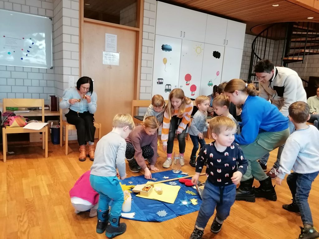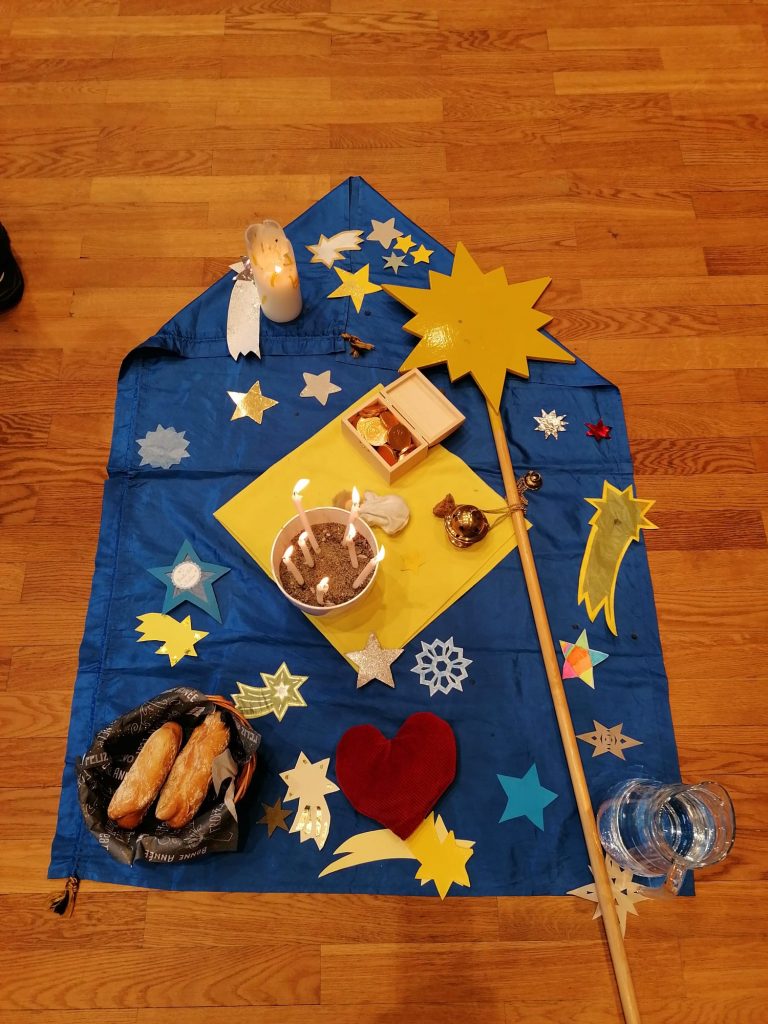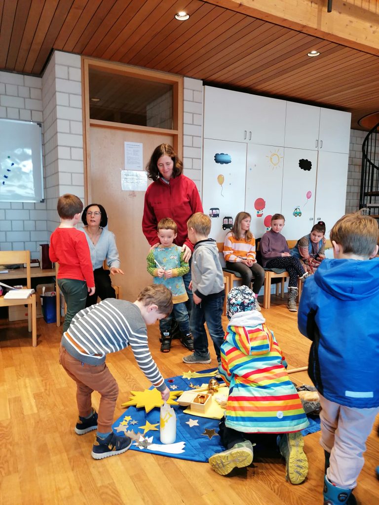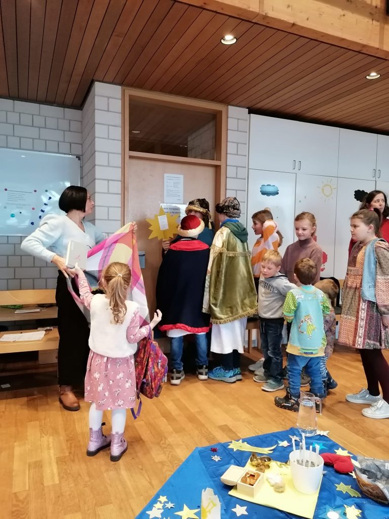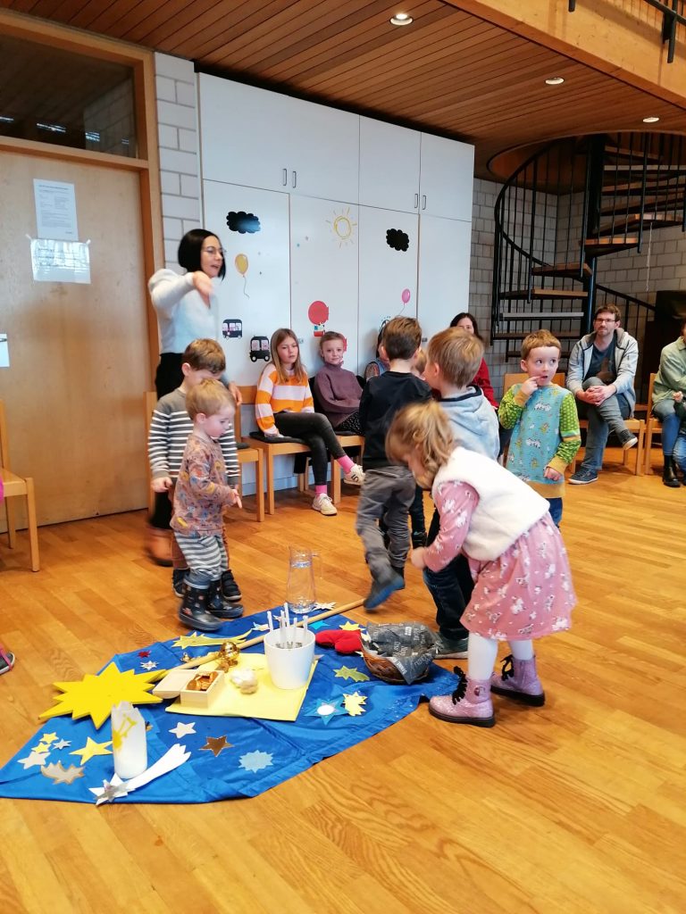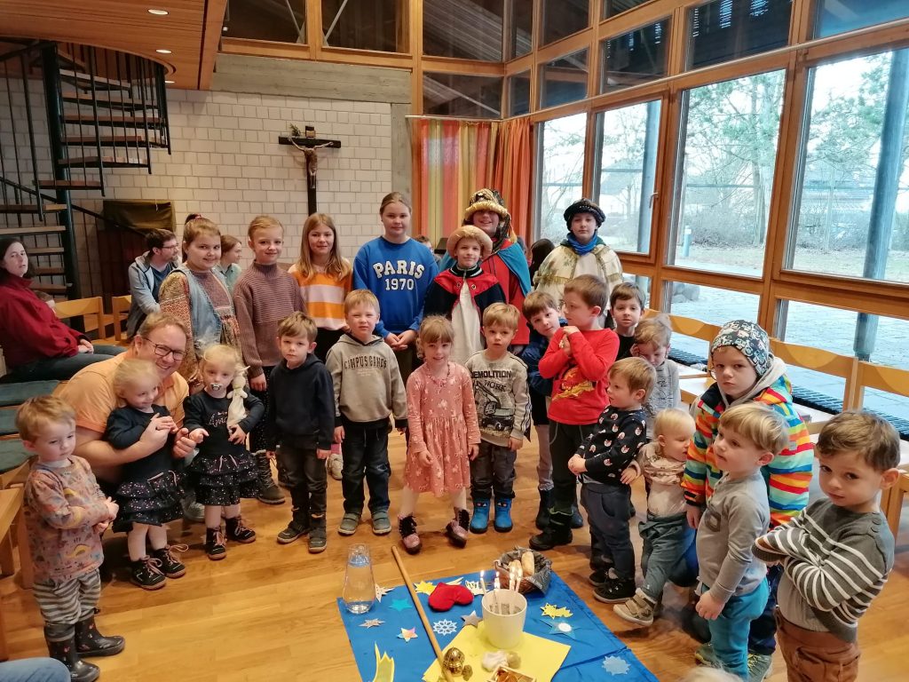 Am Festtag „Dreikönig“ feierten im Pfarrzentrum St. Josef ca. 40 Eltern und Kinder wieder Kinderkirche. Mit dem königlichen Besuch einer Sternsingergruppe und dem Bodenbild wurde das Evangelium von den Sterndeutern aus dem Morgenland lebendig erzählt.