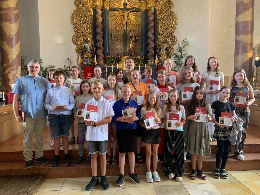 Anlässlich des Festgottesdienstes zum Pfarrpatrozinium kamen die Firmlinge des Jahres zum Gottesdienst zusammen. Gemeinsam dankte man Gott für die Gabe des Heiligen Geistes. Pastoralreferent Konrad Kraus übergab am Ende des Gottesdienstes Bibeln an die Neugefirmten und bedankte sich bei den Tischgruppenleitungen.