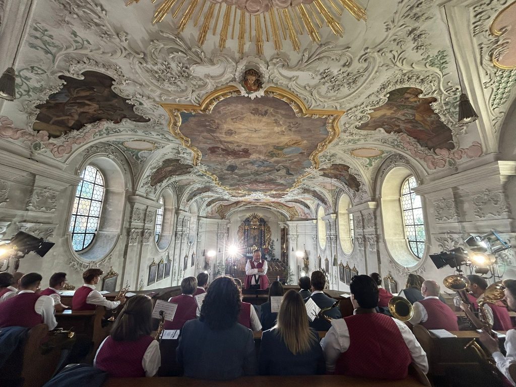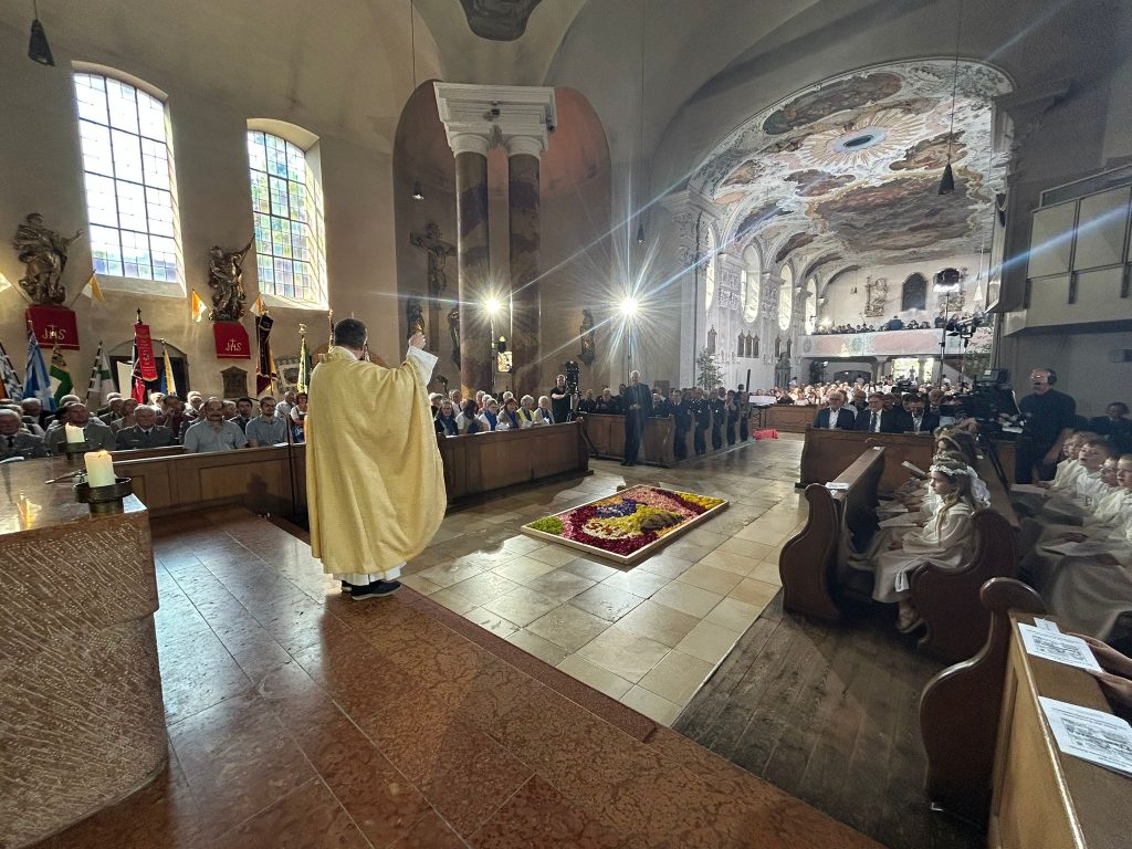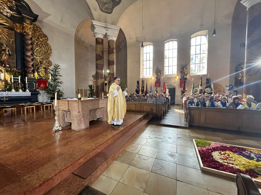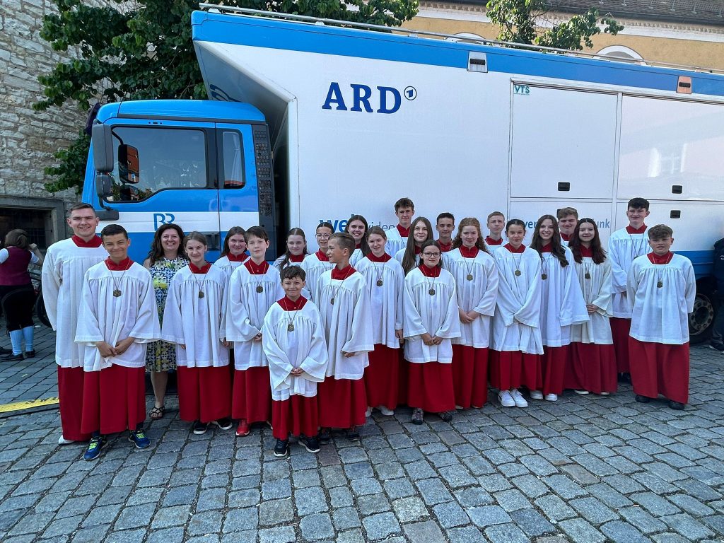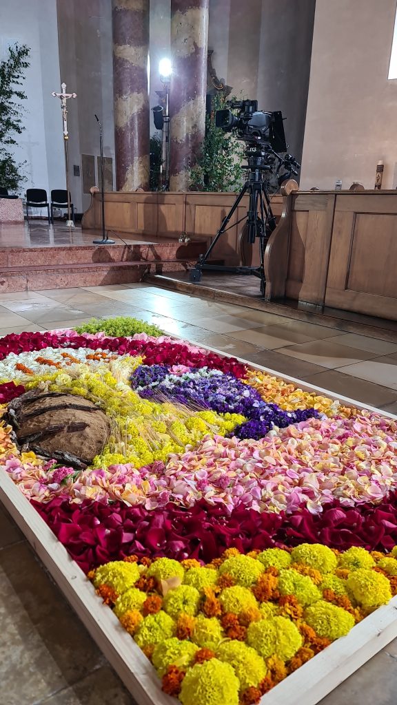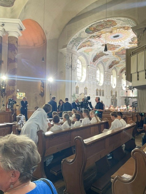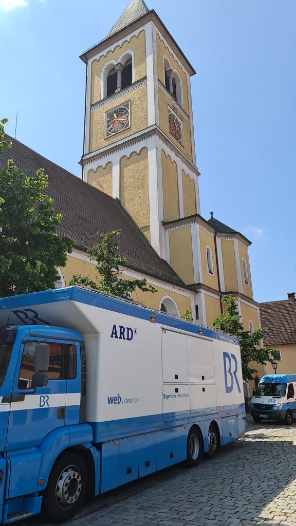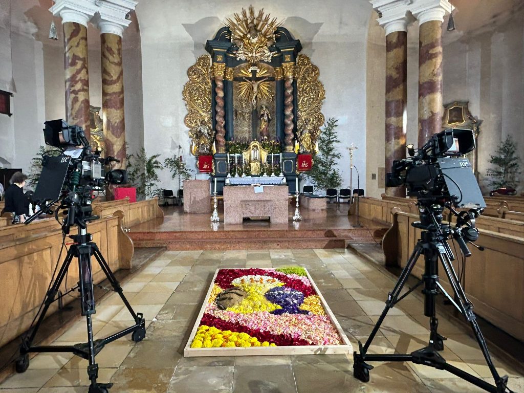 Abgerundet wurde der Gottesdienst durch die liturgischen Dienste der Konzelebranten, pastoralen Mitarbeitenden, Lektoren und Kommunionhelfer, Vorbeter und natürlich der Ministrantinnen und Ministranten. Auch im Hintergrund waren viele Helferinnen und Helfer tätig. Neben dem 20köpfigen Produktionsteam des BR waren nochmals so viele fleißige Helferinnen der Stadtkirche unterwegs, das Catering (Frauenbund) zu organisieren, die Gottesdienstbesucher zu ordnen oder die Logistik in Sakristei und Kirche zu stemmen. Vor allem Mesnerin Astrid Theml hatte in den letzten Tagen wenig Schlaf, managte sie nicht nur die Sakristei, sondern auch das Legen eines wunderschönen Blumenteppichs in der Pfarrkirche St. Vitus. – Somit waren insgesamt an die 200 Helfer/innen beteiligt. Diese zu koordinieren war Aufgabe des Pfarrbüros mit den Sekretärinnen Sabrina Hirschberger und Silke Hüttner.