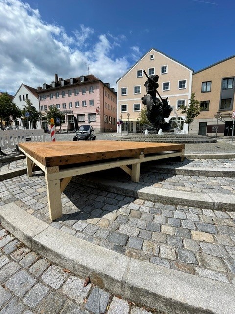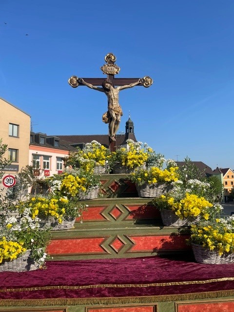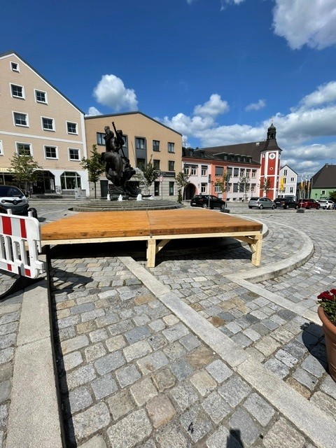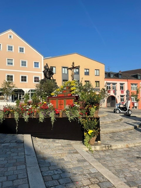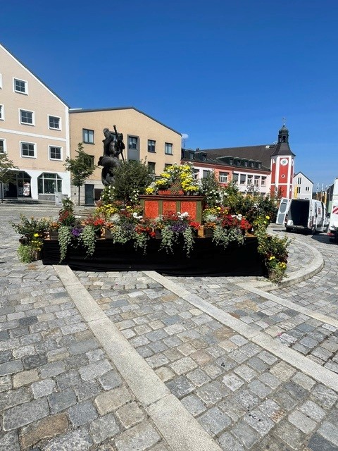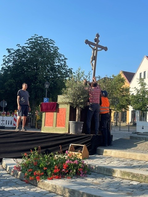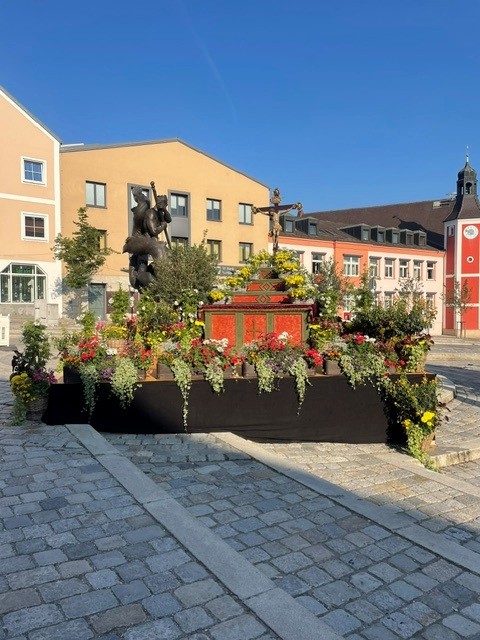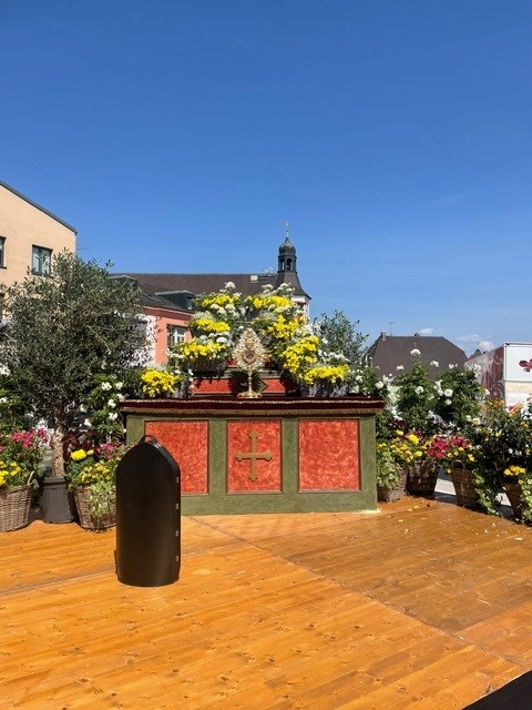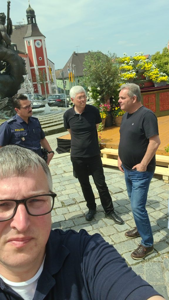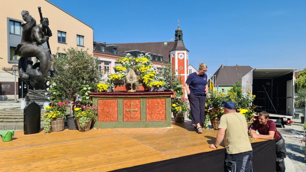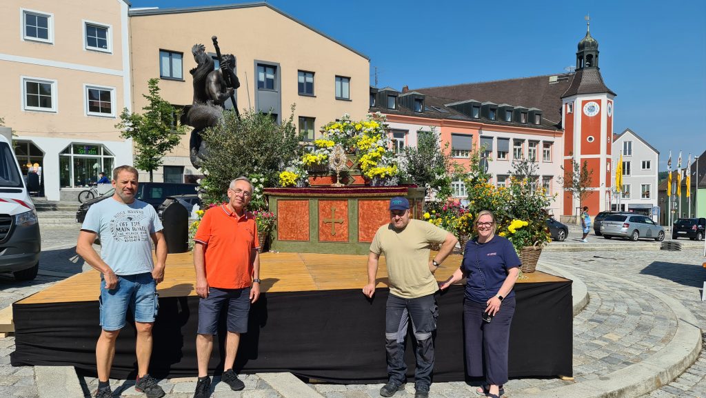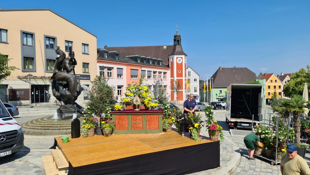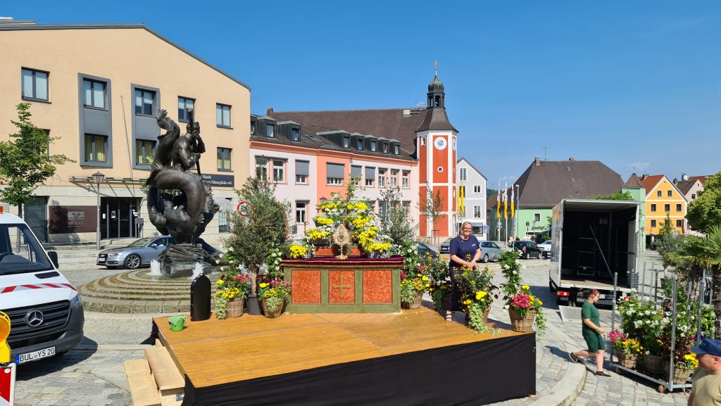 In Burglengenfeld hat das Fronleichnamsfest 2025 bereits seine Kreise gezogen. Schon im Februar begannen die ersten Planungen und Abstimmungen zwischen Erwin Albrecht (Beauftragter der Bischöfe für ARD/BR), Kirchenmusiker Zaindl und Dekan Michael Hirmer. Vor zwei Monaten gab es ein großes Vorbereitungstreffen mit dem Produktionsteam des Bayerischen Fernsehen mit den Akteuren in Burglengenfeld. Dank der großen Unterstützung der Stadtverwaltung Burglengenfeld und vor allem der Mitarbeiter des Bauhofes konnte ein großer Freialtar vor dem Stadtplatzbrunnen des heiligen Georgs errichtet werden. Gärtnerei Fischer mit Chefin Ines hüllte den Freialtar in ein wunderschönes Blumenmeer, dass von vielen Fernsehzuschauern in ersten Rückmeldungen sehr gelobt wurde.