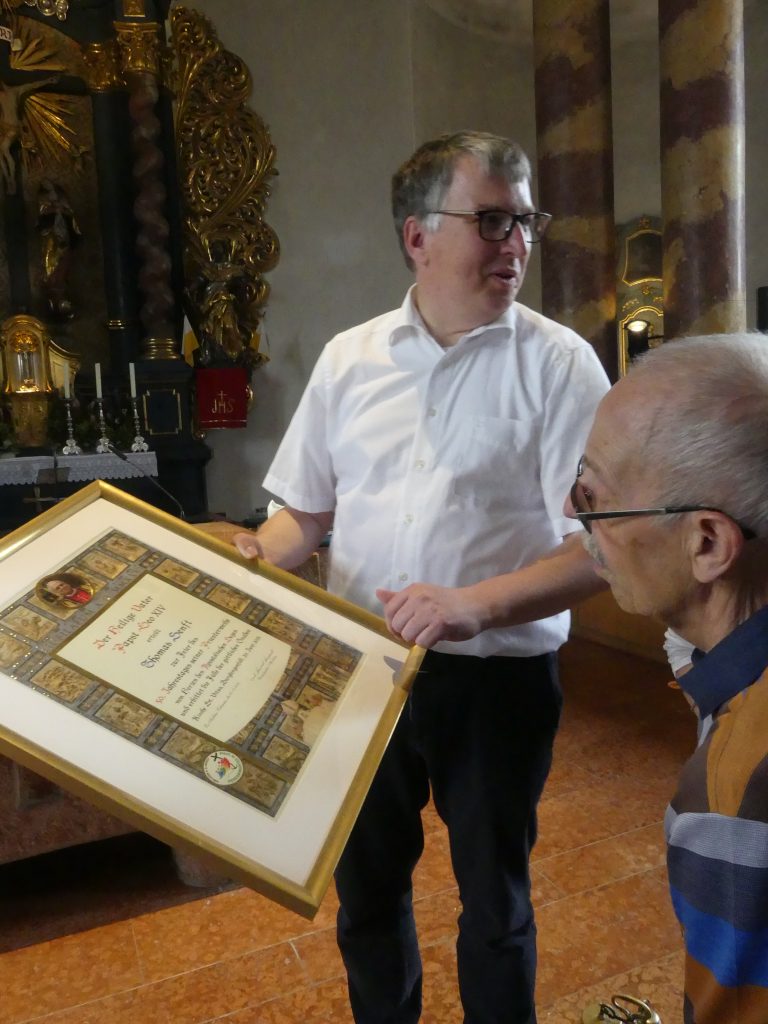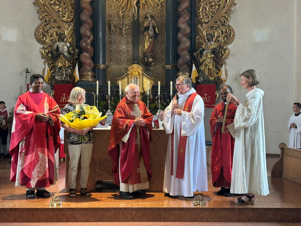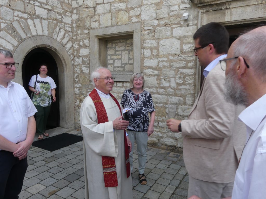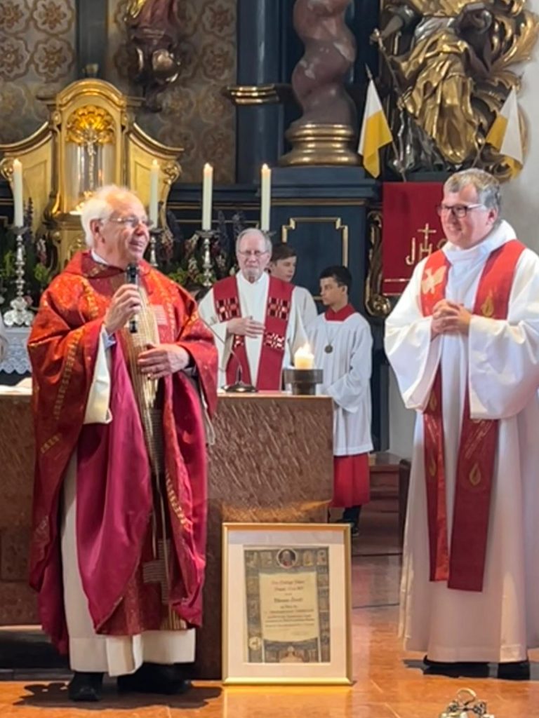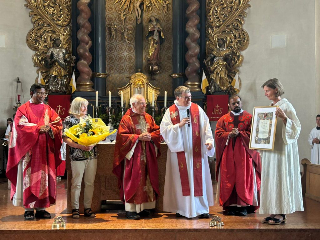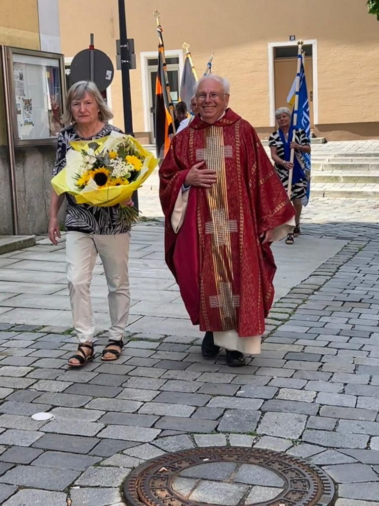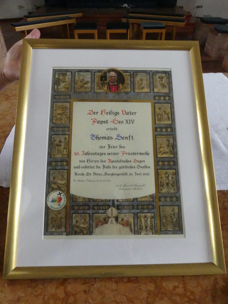 Mit einem feierlichen Dankgottesdienst beging die Stadtkirche Burglengenfeld das goldene Priesterjubiläum von Pfarrer i.R. Thomas Senft. Der Festgottesdienst wurde durch die Nachwuchsgruppe der Vitus-Musikkapelle gestaltet. In seiner Predigt erinnerte Prof. Dr. Hubert Windisch, wie wichtig es ist, dass die Priester auch geistliche Geistliche sein müssen. Die Laudatio am Ende der Eucharistiefeier hielt PGR-Sprecher Markus Heider. Im Namen des Pastoralteams überreichte Dekan Michael Hirmer Blumen an Haushälterin Amalie Rupprecht, als Dankeschön für die jahrelange Unterstützung von Pfarrer Senft. Diesem wurde ein päpstlicher Segen überreicht, den Papst Leo XIV. kurz nach seinem Amtsantritt für den Jubelpriester spendete. In diesen Segen stimmte die ganze Gottesdienstgemeinde ein, als Dekan Hirmer Pfarrer Senft die Hänge auflegte.