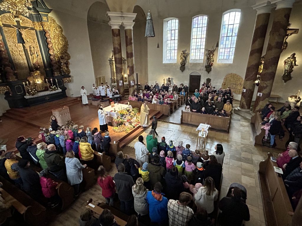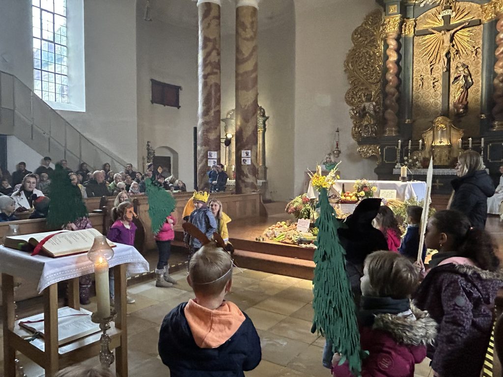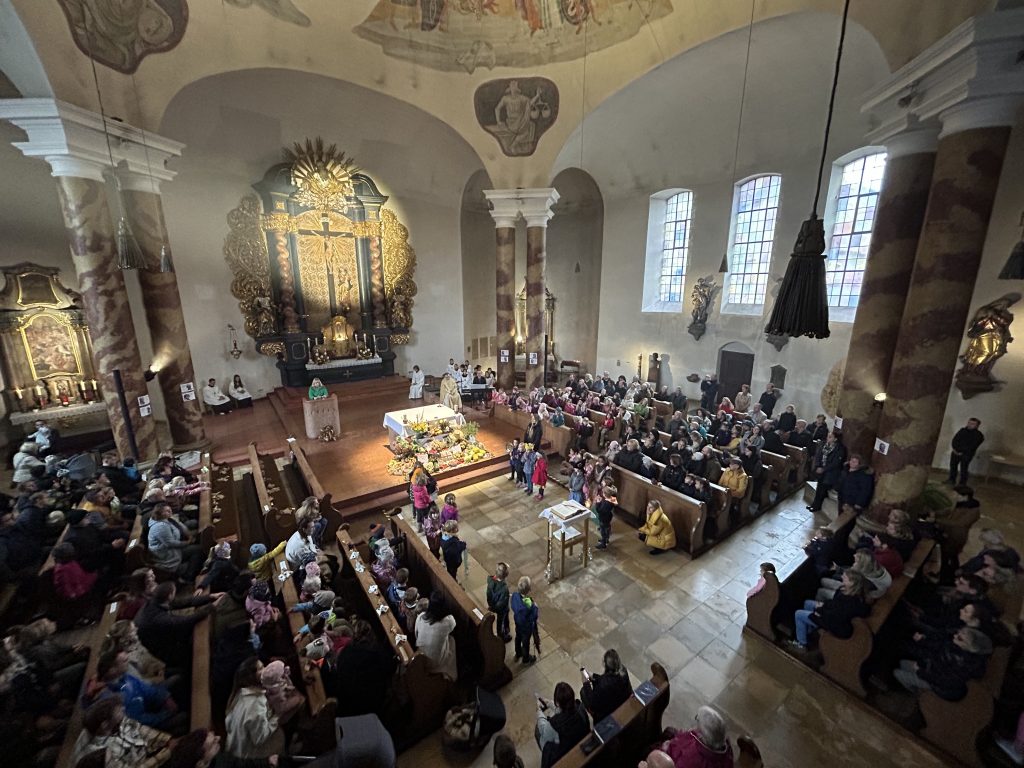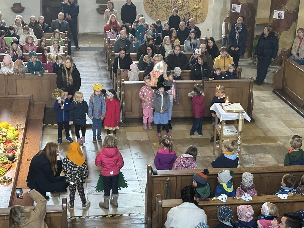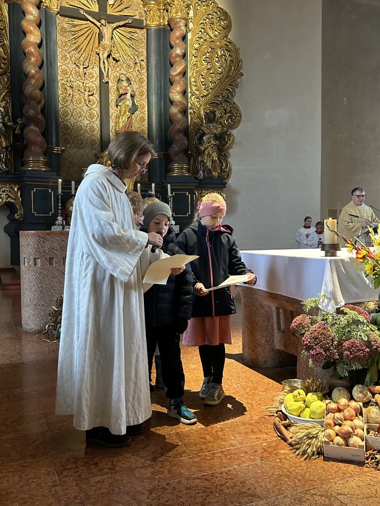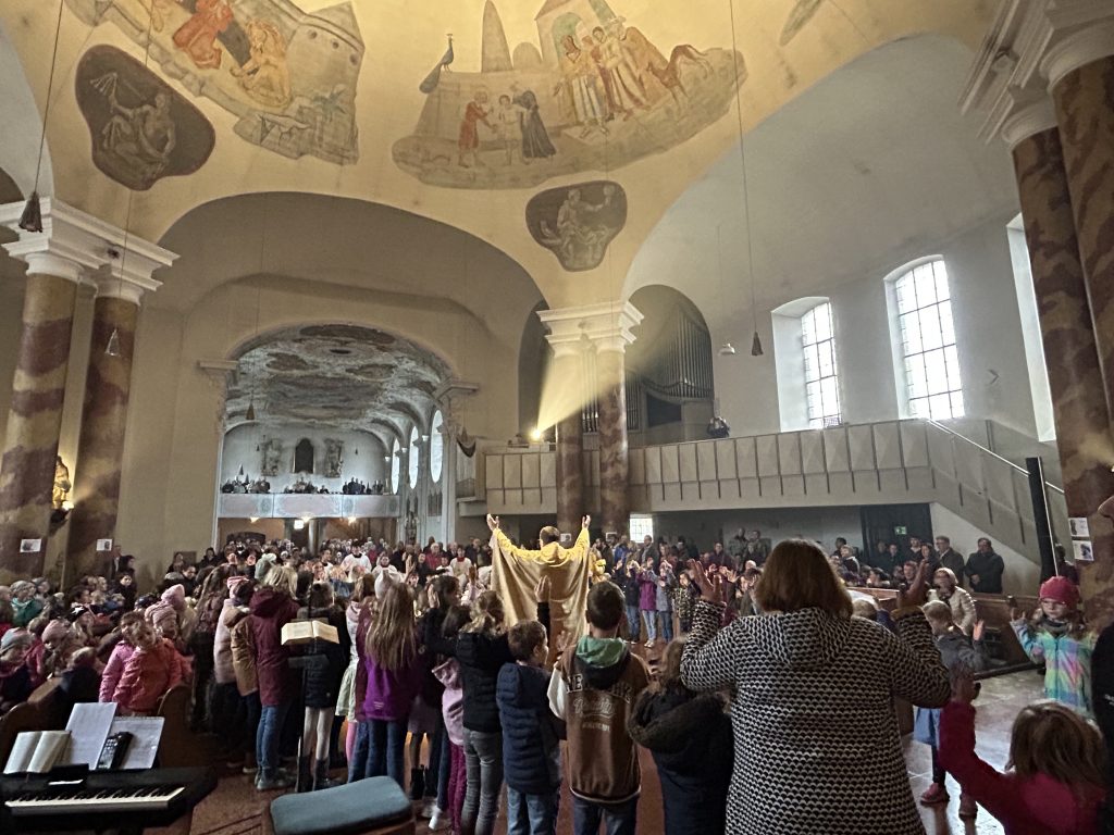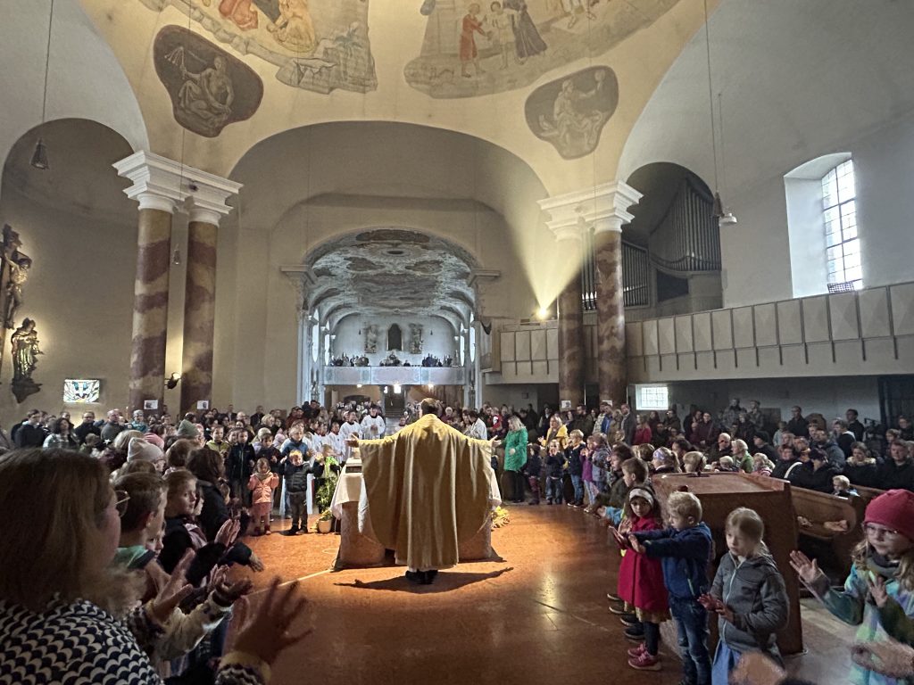 Anstelle der Predigt zeigten die Kindergartenkinder auf, wie wichtig es ist, sich für Menschen in Not hinzugeben. Die Fürbitten trugen Kommunionkinder vor. Um den Altar versammelt sagen und beteten alle Mitfeiernden in der voll besetzten Vituskirche das Vaterunser.