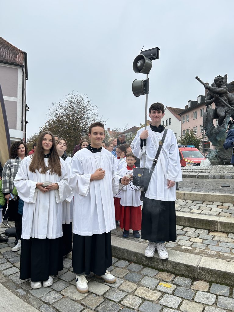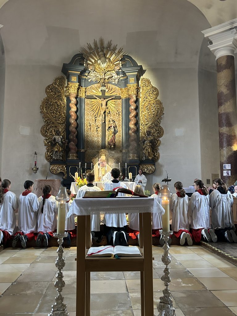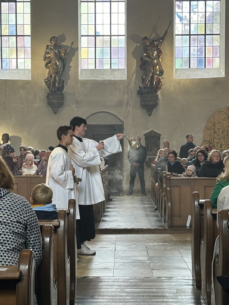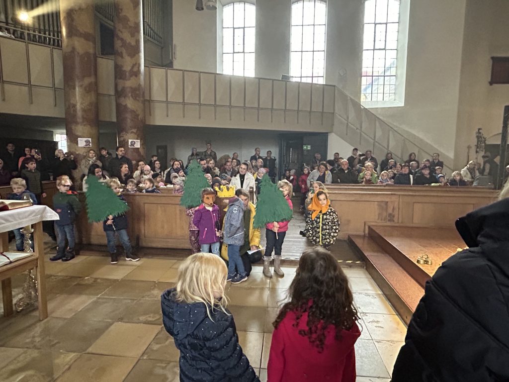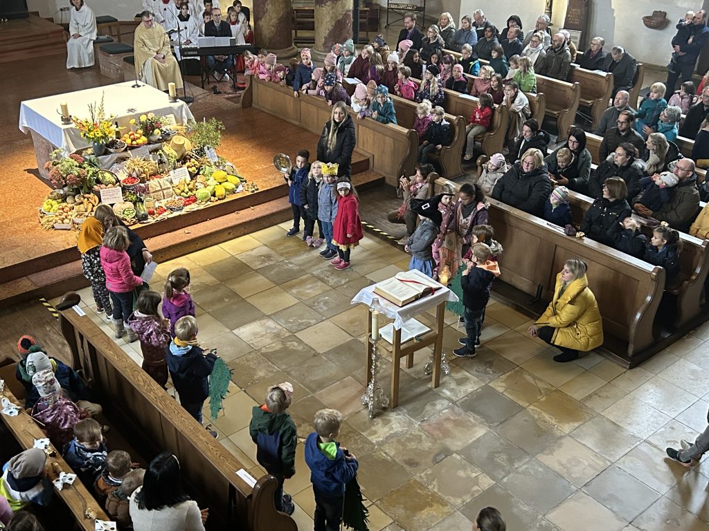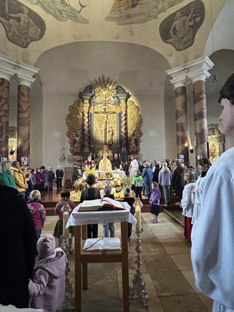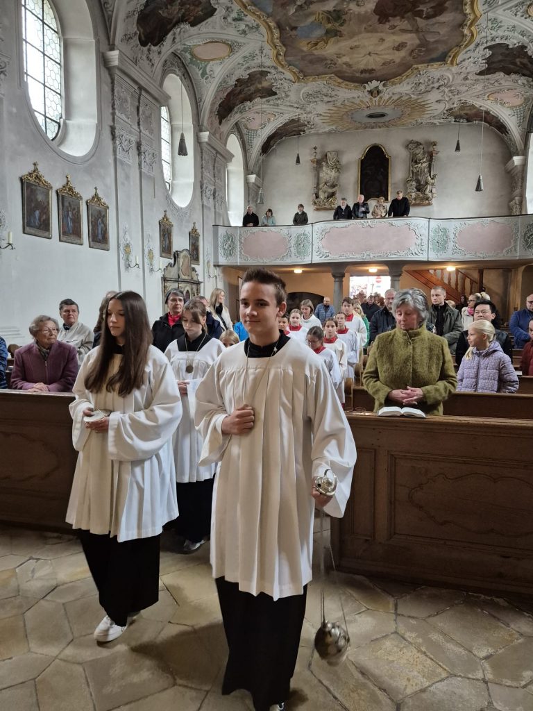 Anstelle der Predigt zeigten die Kindergartenkinder auf, wie wichtig es ist, sich für Menschen in Not hinzugeben. Die Fürbitten trugen Kommunionkinder vor. Um den Altar versammelt sagen und beteten alle Mitfeiernden in der voll besetzten Vituskirche das Vaterunser.