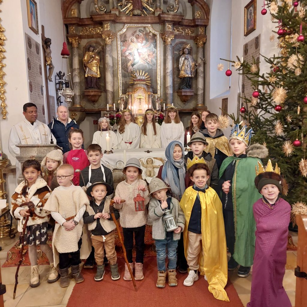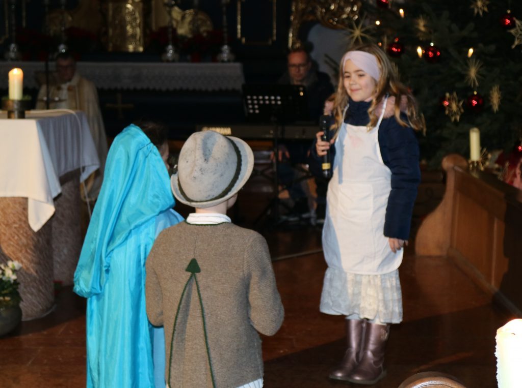 Zu Beginn der Christmette, der Prof. Dr. Hubert Windisch in Konzelebration mit Dekan Michael Hirmer vorstand, fand auch in Pottenstetten ein Krippenspiel statt. Wieder einmal hat dieses ein Team um Christine Ippisch vorbereitet.
