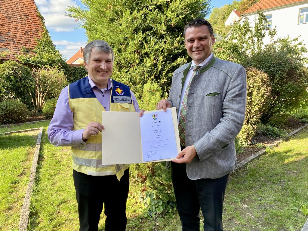 Bildunterschrift: Landrat Thomas Ebeling (r.) überreicht Dekan Michael Hirmer die Bestellungsurkunde zum Leiter PSNV-B