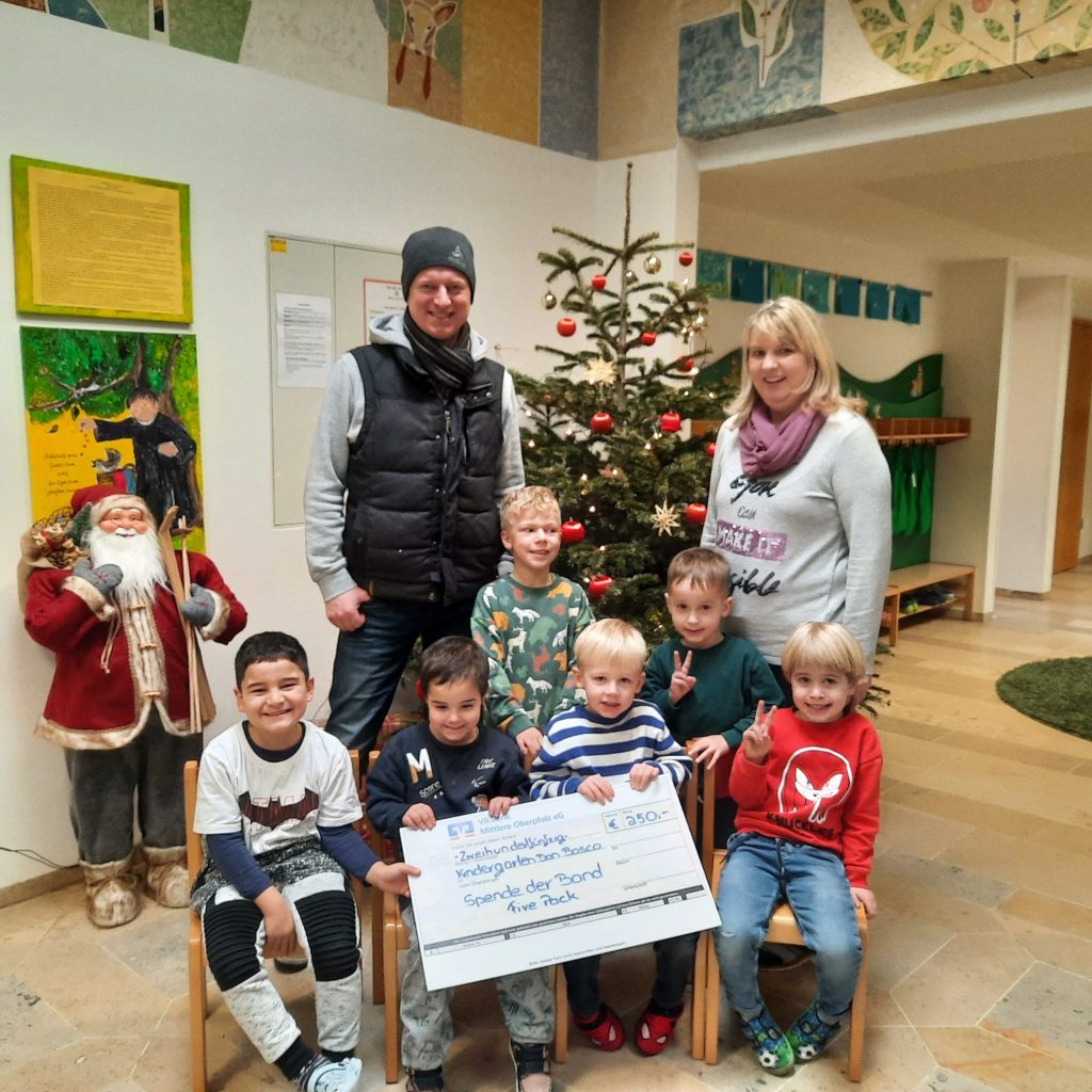 Vergelt´s Gott sagen die Kinder des Kindergartens Don Bosco Burglengenfeld an die Band Five Pack GbR aus Maxhütte, die hat 250,00 € gespendet hat
