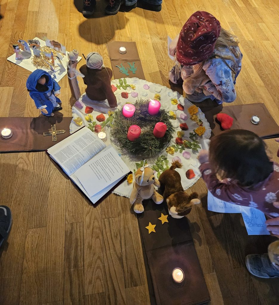 Auch am 3. Adventsonntag versammelten sich die Kinder mit ihren Eltern im Pastoralzentrum, parallel zum Gottesdienst in der Kirche St. Josef, zur Kinderkirche. Wenn Gott kommt – wird die Wüste blühen… und es wird Friede sein, so verheißt es der Prophet Jesaja. Die Kinder verwandelten mit Blütenblättern die Mitte um den Adventkranz und mit Freude wurde gesungen „…Gott hält sein Versprechen, er vergisst uns nicht.“