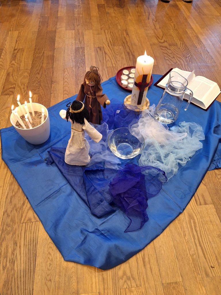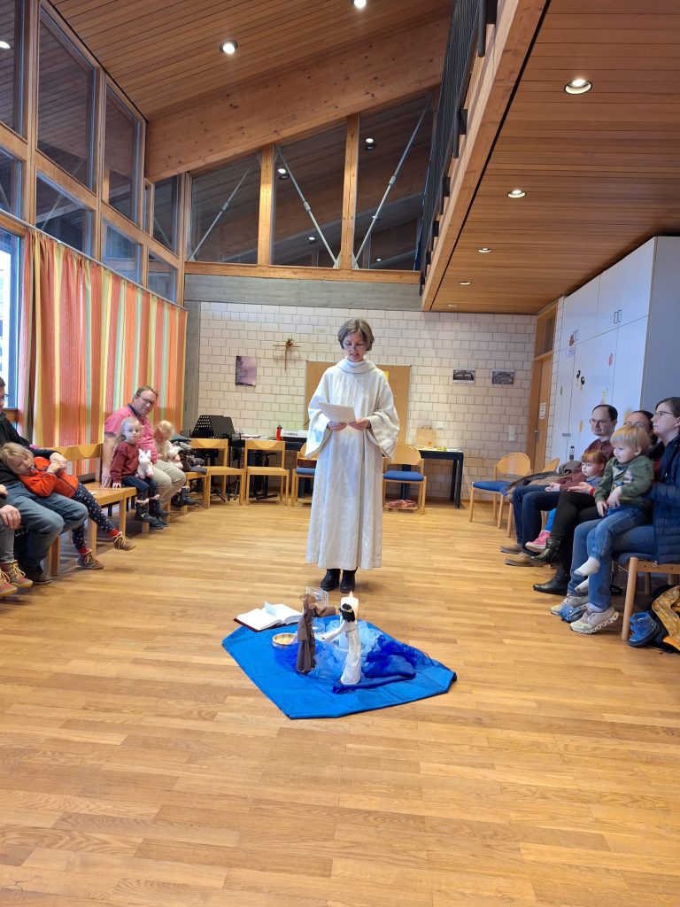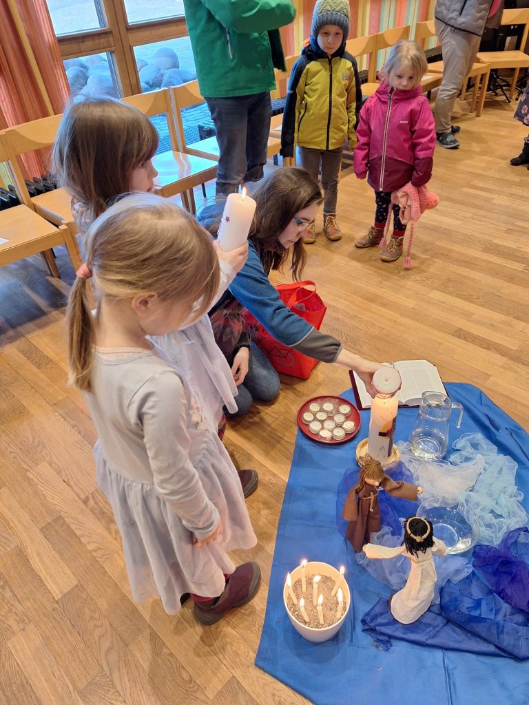 „Wasser ist lebensnotwendig, wir trinken Wasser, es macht rein und sauber, es macht lebendig. Durch die Taufe gehören wir zu dir, Jesus Christus. Du lässt uns niemals allein. Dafür danken wir dir. Mit deinem Segen gehen wir voller Mut und Hoffnung in das neue Jahr.“ Die Kinder tauchten ihren Finger ins Wasser und bekreuzigten sich. Dann entzündeten sie bei den Fürbitten Lichter und zogen mit den Taufkerzen in die große Kirche ein zum gemeinsamen Abschluss.