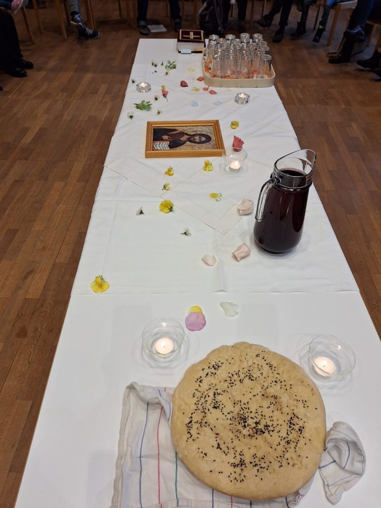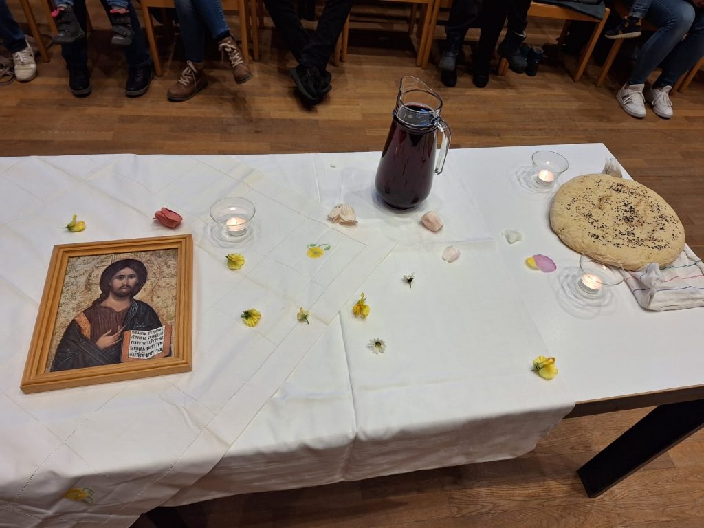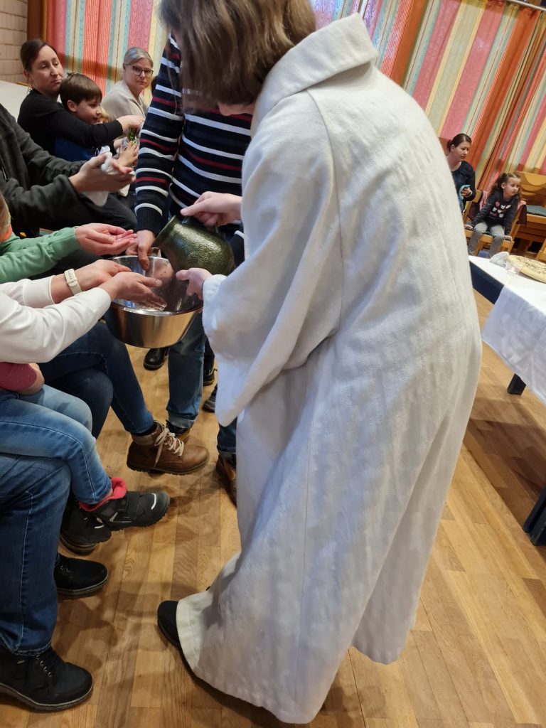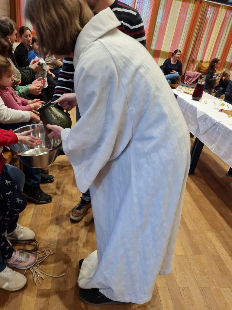 Zur Kinderkirche am Gründonnerstag versammelten sich junge Familien mit Kleinkindern im Pfarrsaal. Der Tisch für das Mahl wurde gemeinsam bereitet. Bevor das Brot gesegnet und geteilt wurde, bekamen alle im Kreis die Hände gewaschen in Anlehnung der Bibelerzählung von der Fußwaschung Jesu.