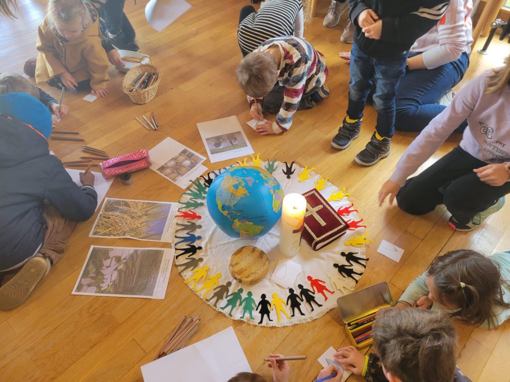 Am Weltmissionssonntag versammelten sich wieder einige Kleinkinder mit Eltern und Großeltern zur Kinderkirche im Pastoralzentrum, parallel zum Familiengottesdienst in der „großen Kirche“. Mit vielen Menschen auf der ganzen Erde glauben und beten wir. Die Kinder gestalteten kleine Bilder zum Thema Hoffnung: worauf hoffen wir? Was gibt dir Hoffnung?