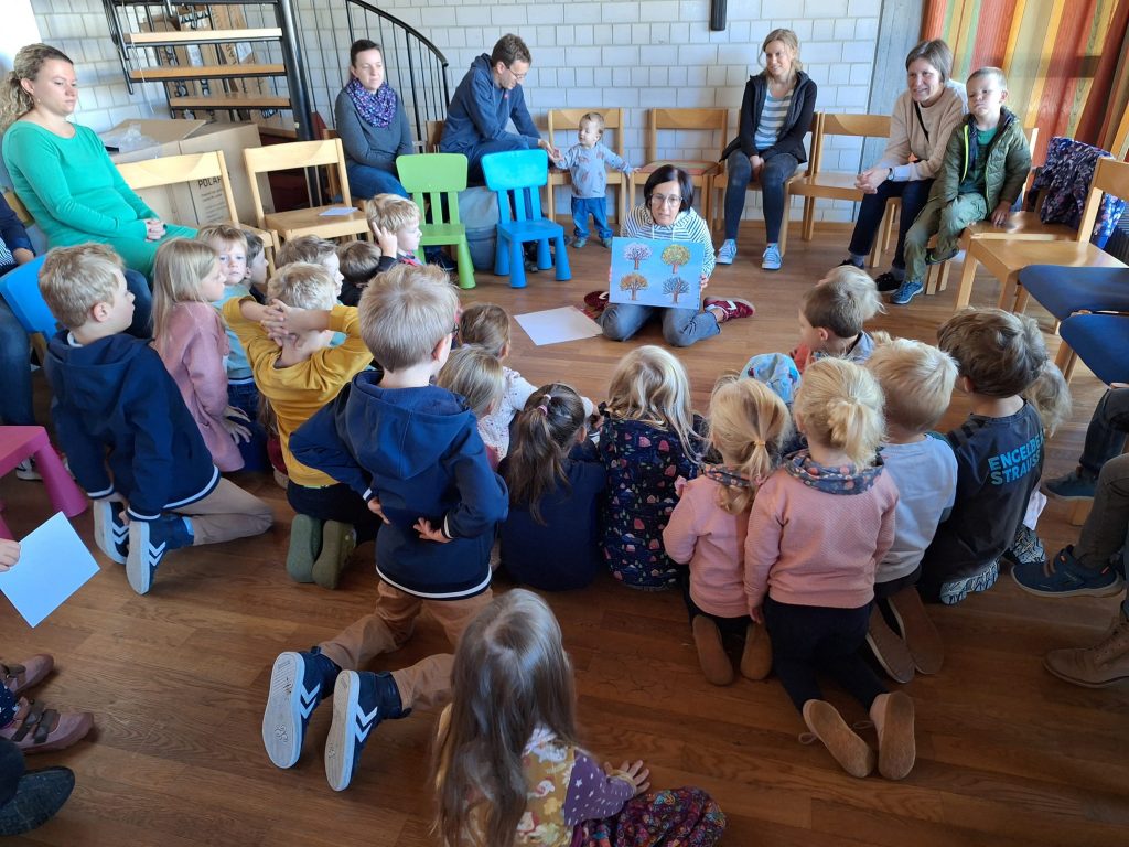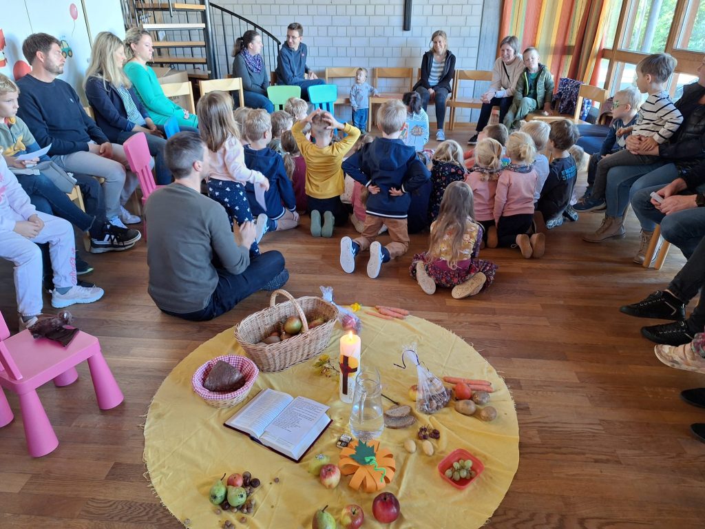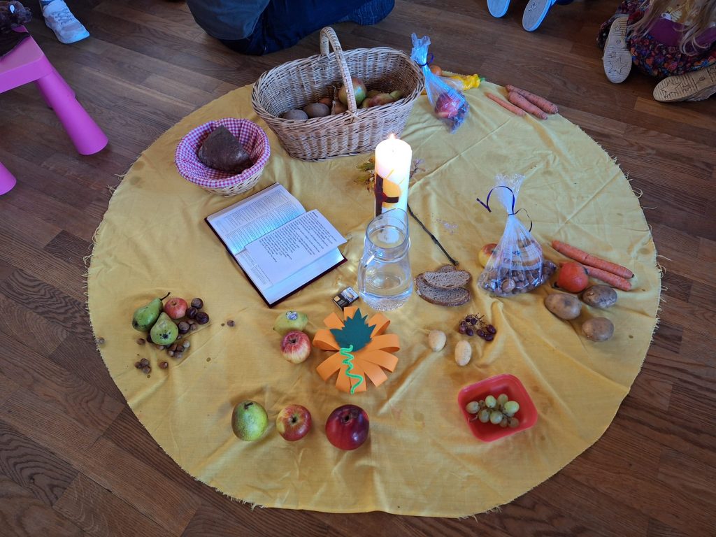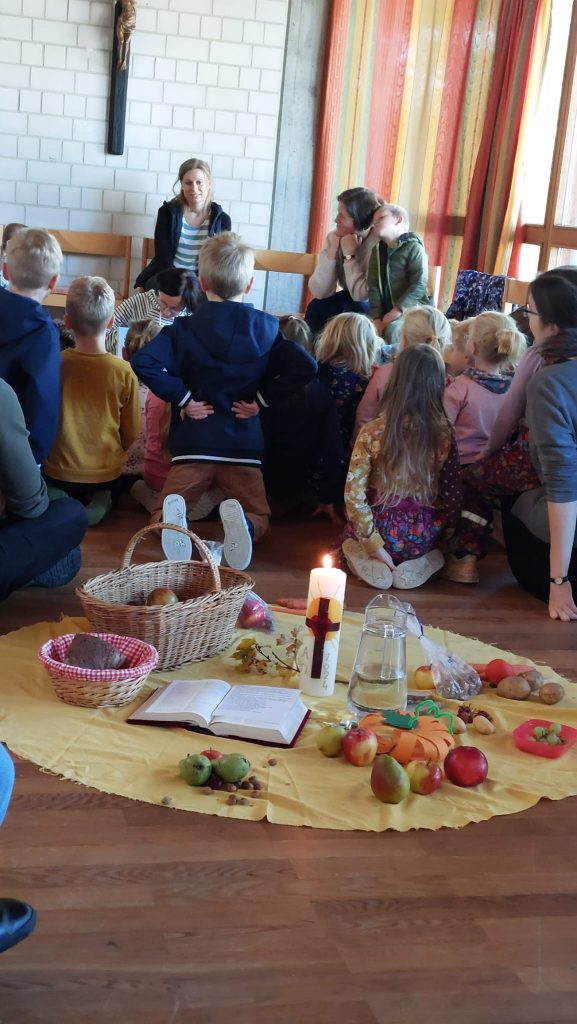 Viele Kinder und Familien versammelten sich wieder im Pastoralzentrum zur Kinderkirche, der vorbereitete Stuhlkreis musst noch erweitert werden, so zahlreich war das Kommen. Das Erntedankfest was diesmal das Thema. So brachten die Kinder ihre Gaben von Obst und Gemüse mit, um die Mitte damit zu schmücken. „Herr, wir danken dir“ schallte es lauthals beim Lied: Du hast uns deine Welt geschenkt. Und auch bei der Erzählung zum Erntedankfest waren alle dabei. Schön war`s!