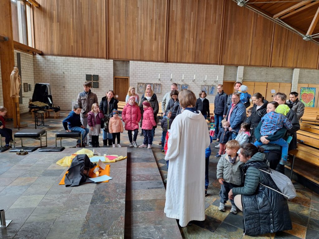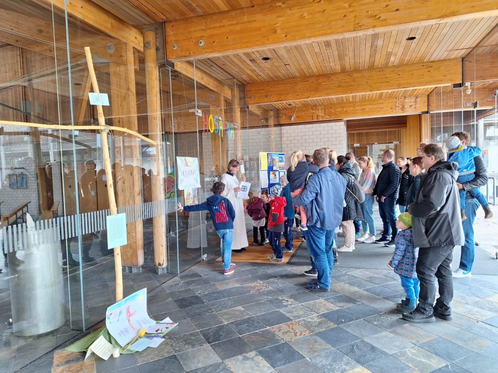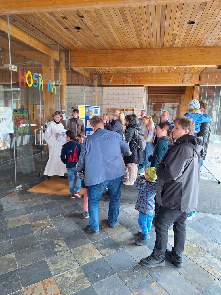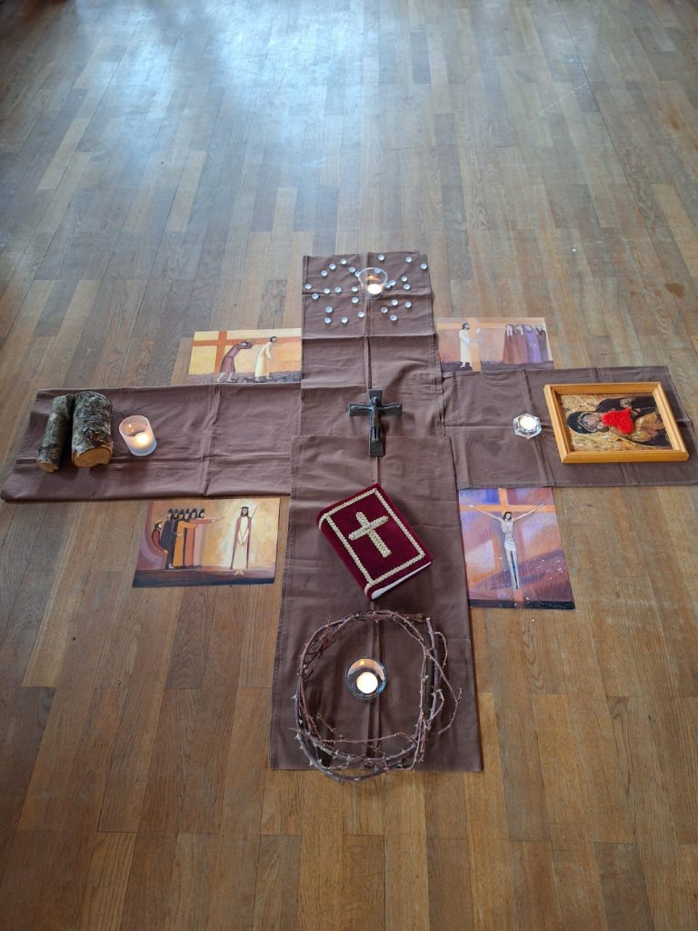 Zur Kreuzfeier für Kleinkinder am Karfreitag wurde in der Kreismitte das Kreuz mit verschiedenen Symbolen aus der Leidensgeschichte Jesu gelegt, zum Beispiel die Dornenkrone oder die Tränen der Frauen am Kreuzweg Jesu mit Glasmuggelsteinen. Die Feier endete in der Kirche St. Josef am Grab Jesu, das dort aufgebaut ist und in dem der Osterweg in verschiedenen Stationen zu sehen ist.