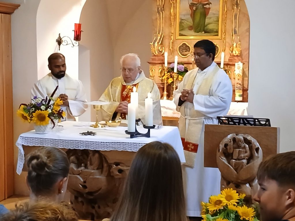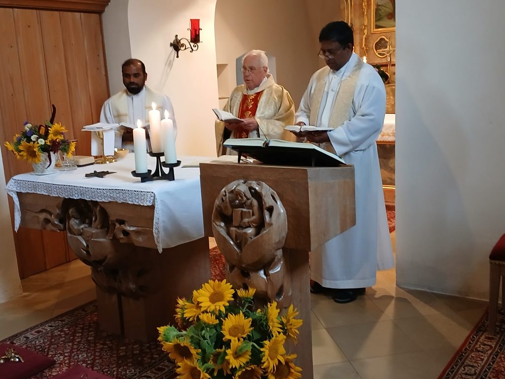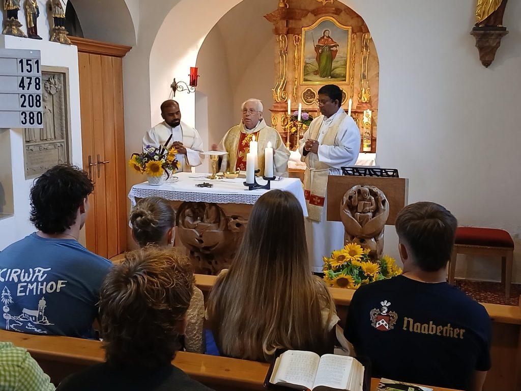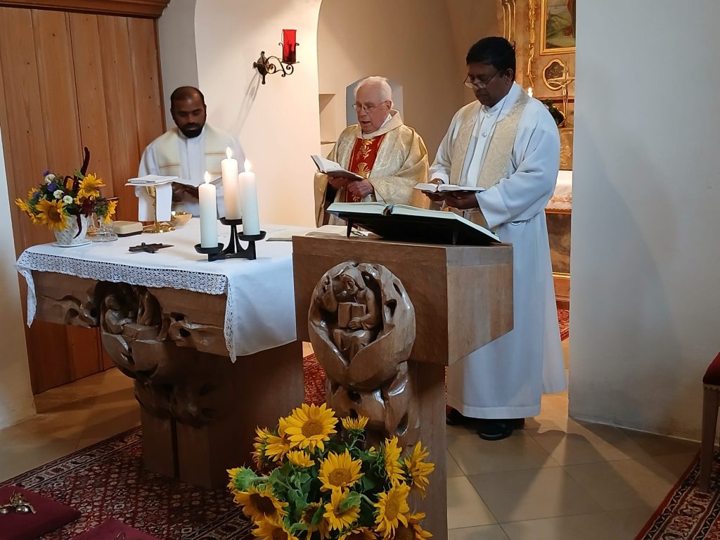 Ruhestandspfarrer Senft, Kaplan Babu und Vikar Kumar feierten gemeinsam mit Emhof die Eucharistiefeier zum Kirchweihfest. Musikalisch wurde der Gottesdienst von Kirchenmusiker Hubert Zaindl gestaltet. Mit dabei war auch der Kirwa-Verein von Emhof.