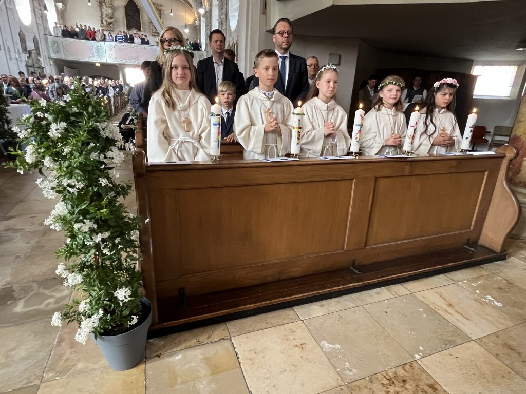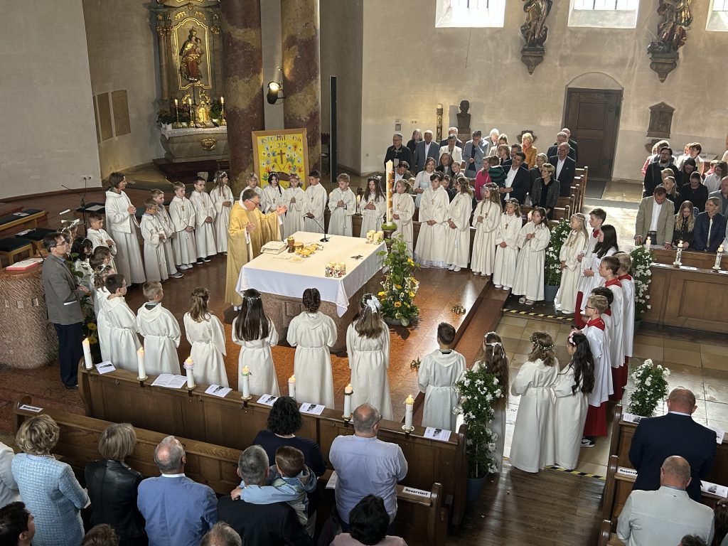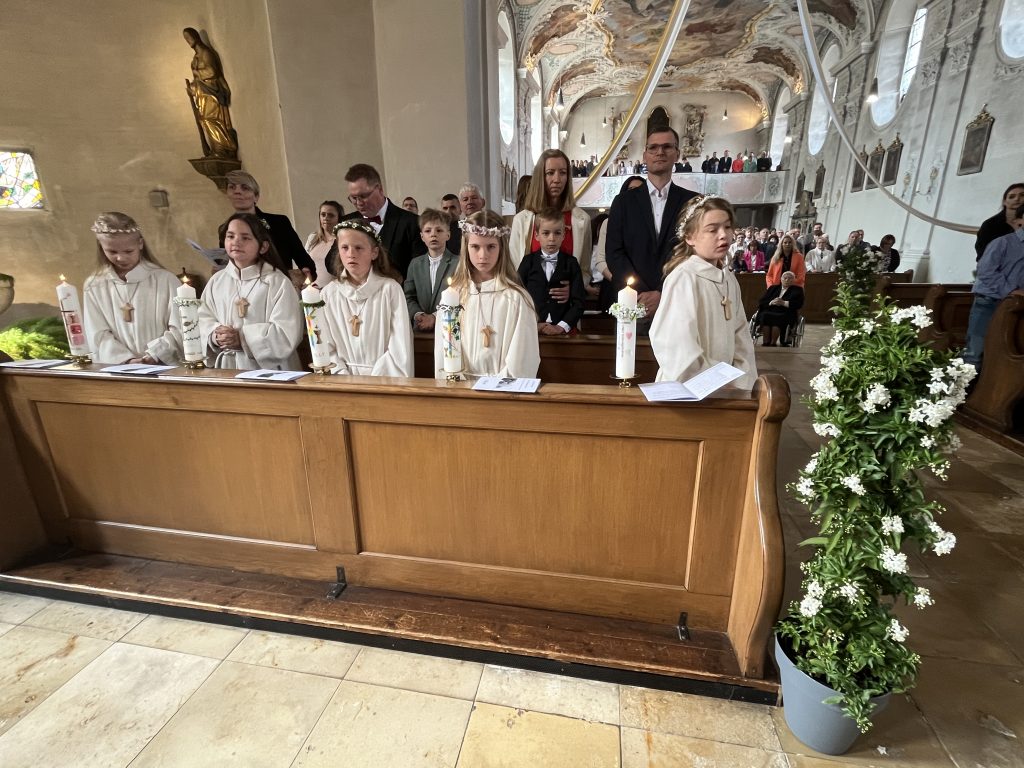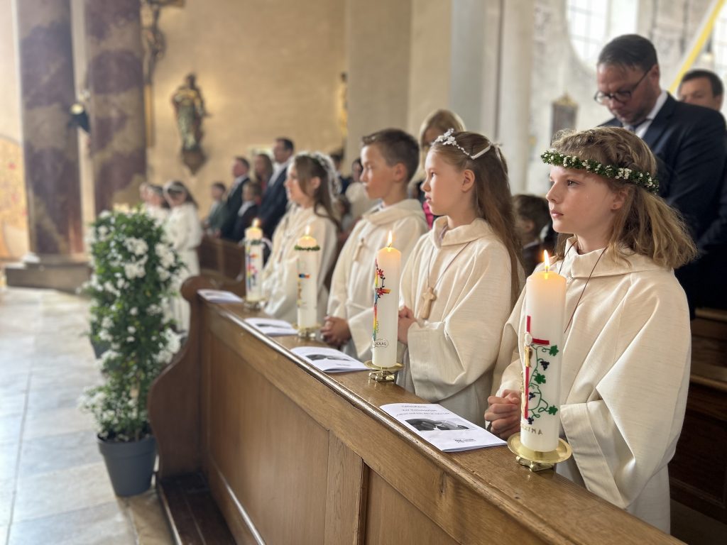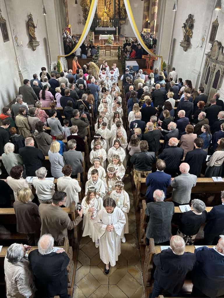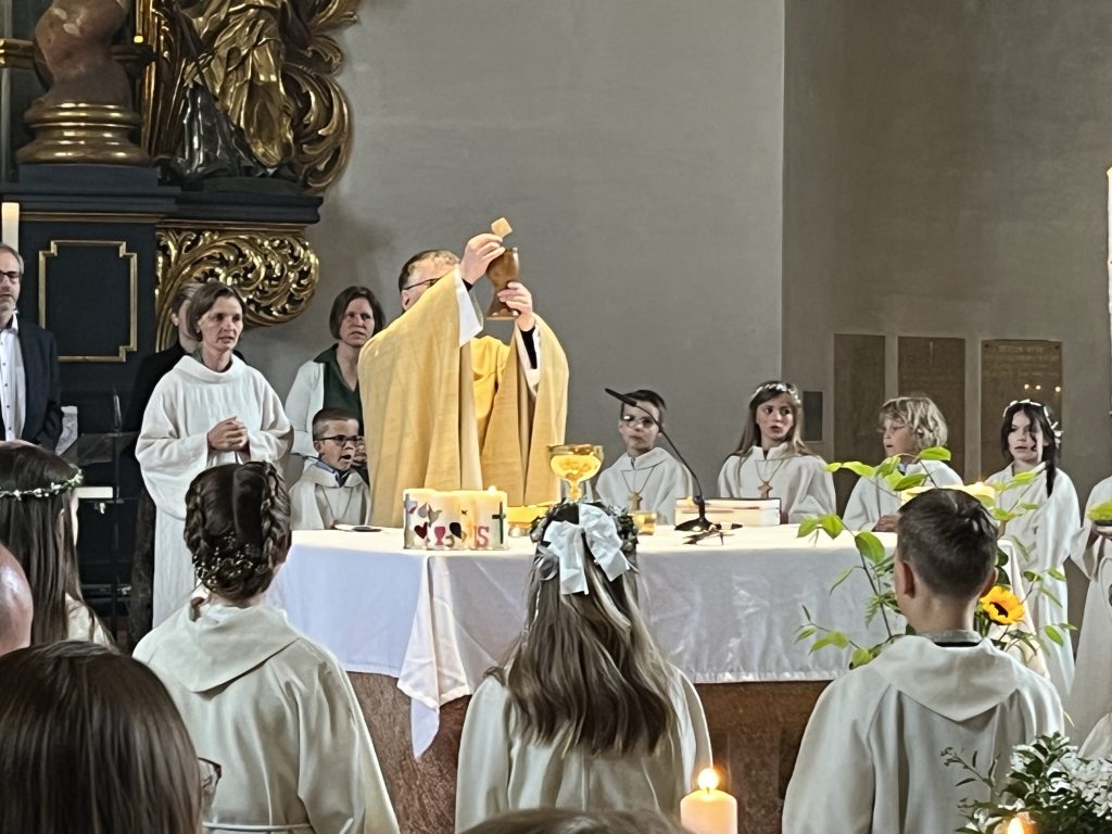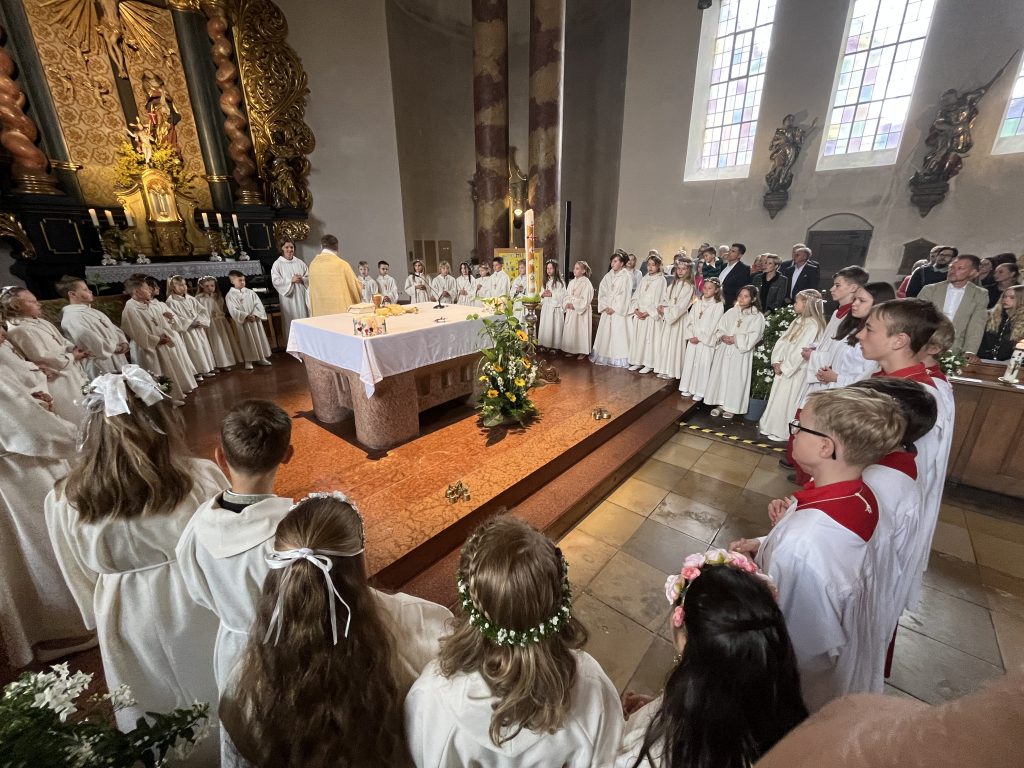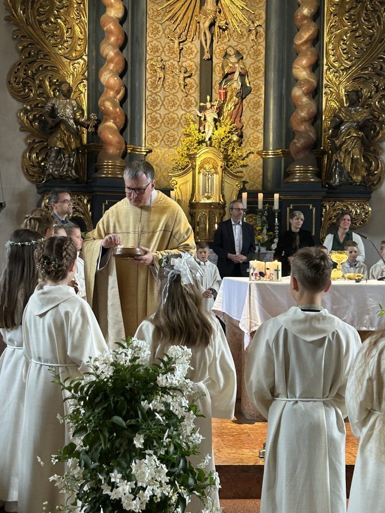 Nachdem die Kommunionkinder schon in der Feier des Letzten Abendmahles am Gründonnerstag zum ersten mal den Leib Christi in der heiligen Kommunion empfangen haben, durfte am 18. Mai richtig groß gefeiert werden. Mit Kommunionkerze und dem weißen Taufkleid zogen die Kinder in die Vituskirche von Burglengenfeld ein. Der feierliche Gottesdienst wurde von Gemeindereferentin Bernadette Biller vorbereitet und durch den Kirchenchor St. Vitus unter der Leitung von Hubert Zaindl musikalisch gestaltet. Dekan Michael Hirmer bedankte sich am Ende des Gottesdienstes bei allen, die die Kinder auf den Empfang der Eucharistie vorbereitet hatten.