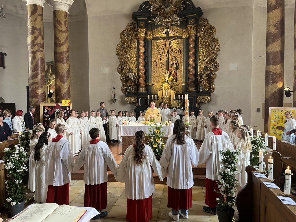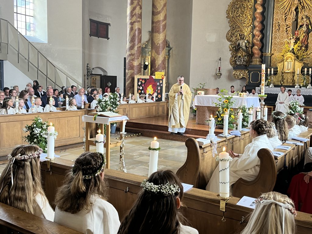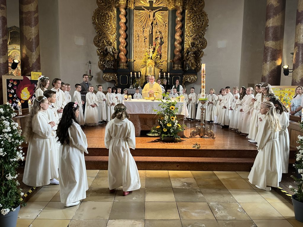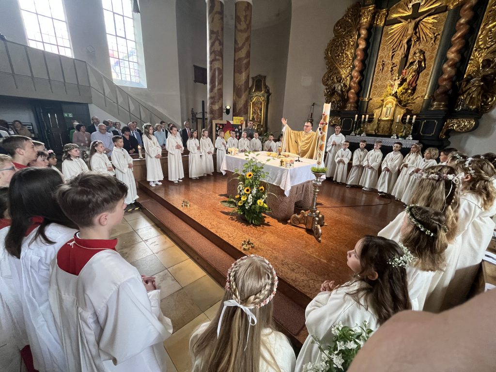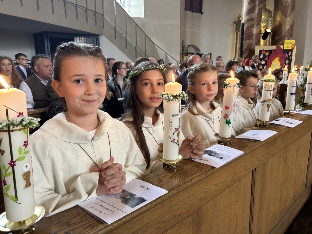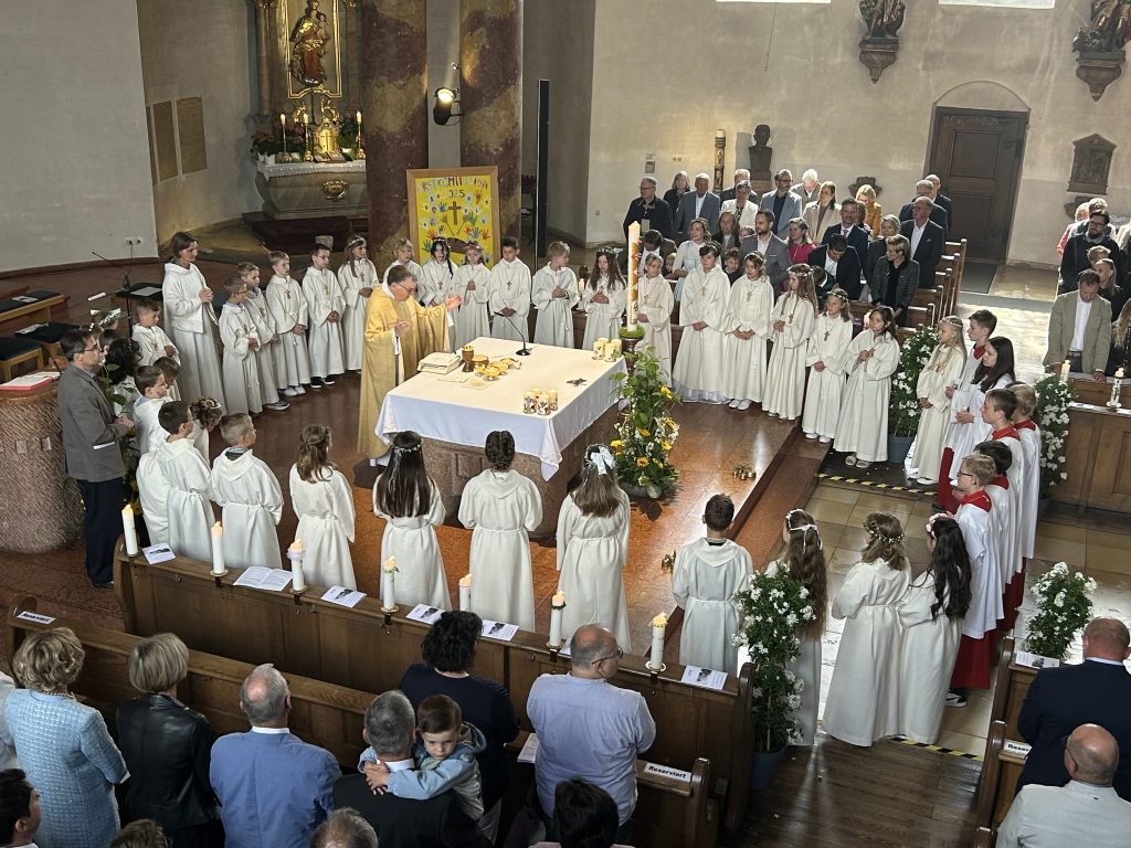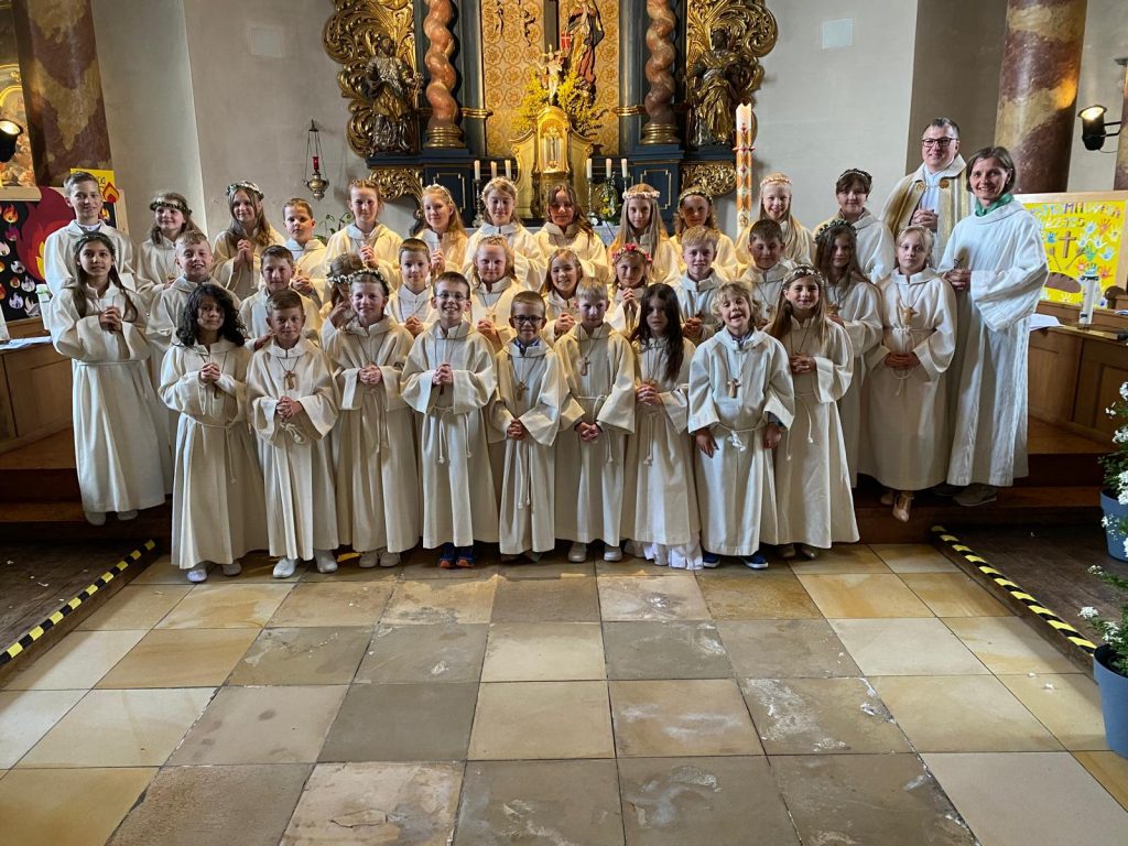 Nachdem die Kommunionkinder schon in der Feier des Letzten Abendmahles am Gründonnerstag zum ersten mal den Leib Christi in der heiligen Kommunion empfangen haben, durfte am 18. Mai richtig groß gefeiert werden. Mit Kommunionkerze und dem weißen Taufkleid zogen die Kinder in die Vituskirche von Burglengenfeld ein. Der feierliche Gottesdienst wurde von Gemeindereferentin Bernadette Biller vorbereitet und durch den Kirchenchor St. Vitus unter der Leitung von Hubert Zaindl musikalisch gestaltet. Dekan Michael Hirmer bedankte sich am Ende des Gottesdienstes bei allen, die die Kinder auf den Empfang der Eucharistie vorbereitet hatten.