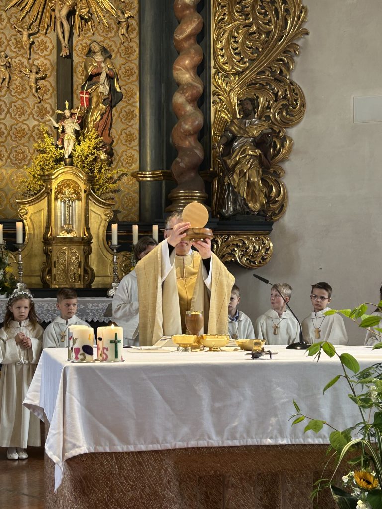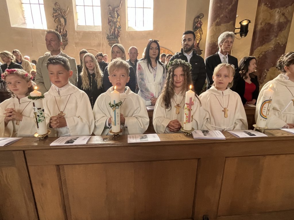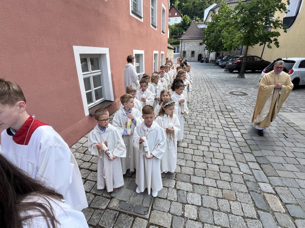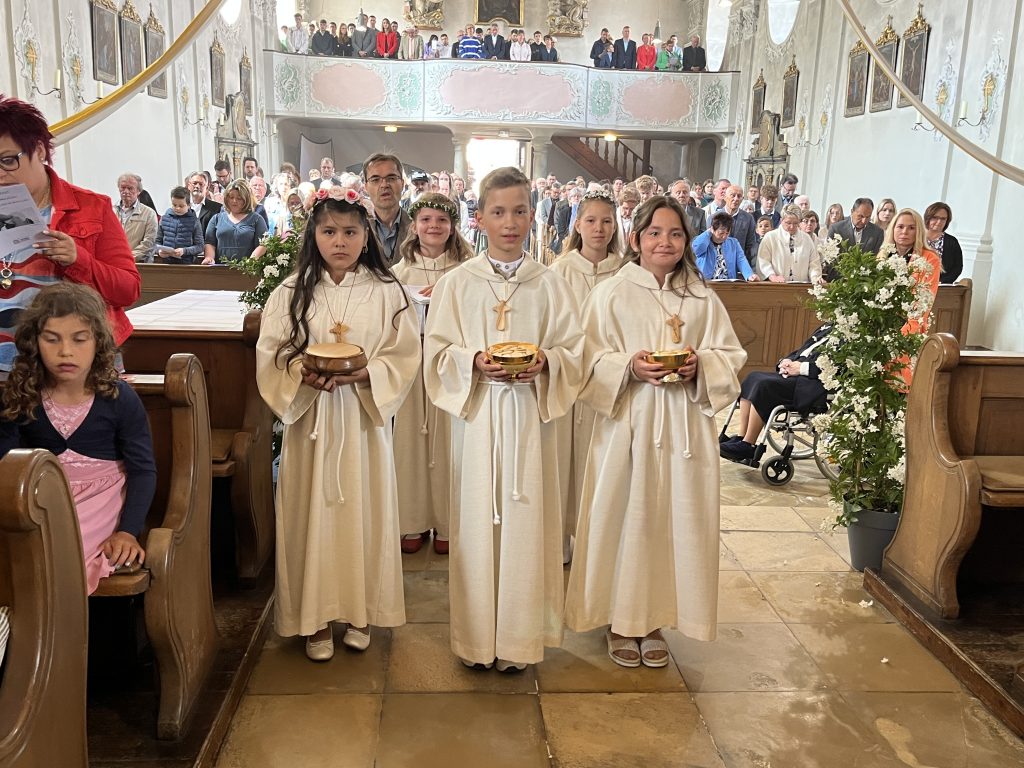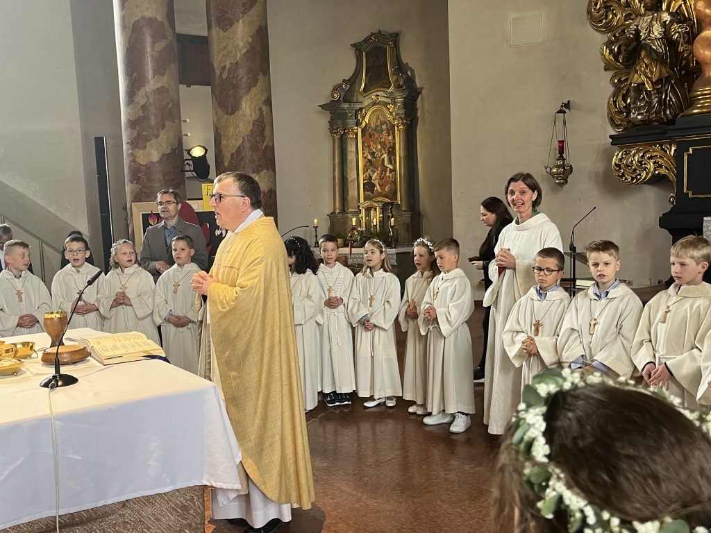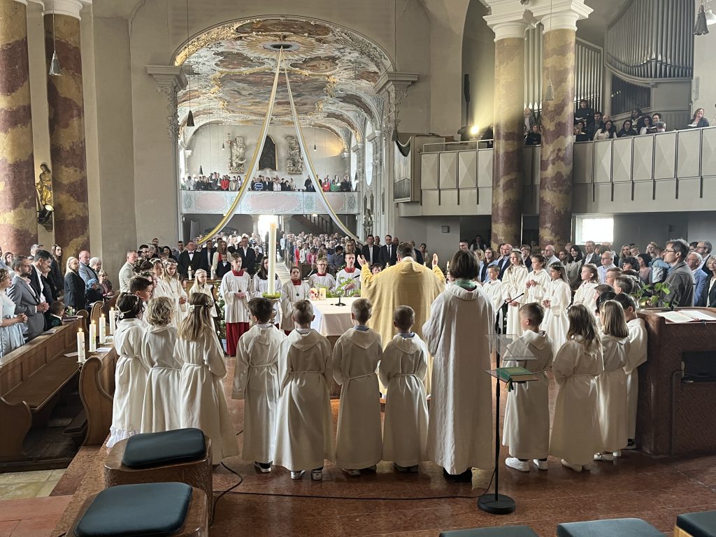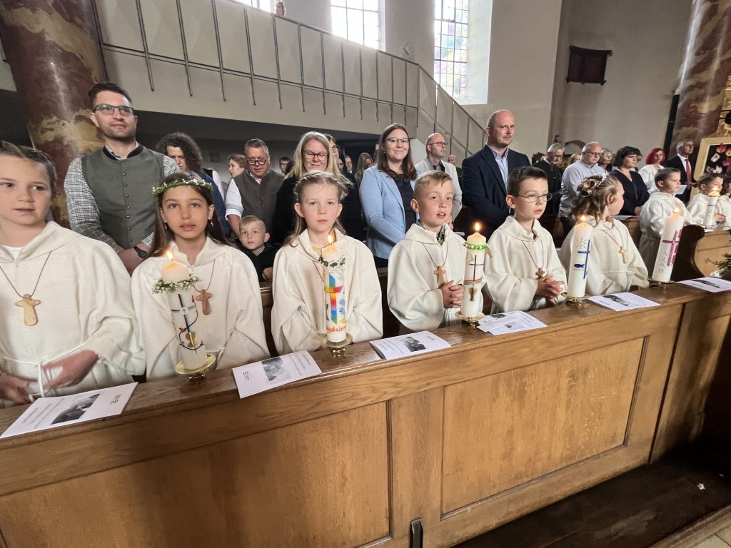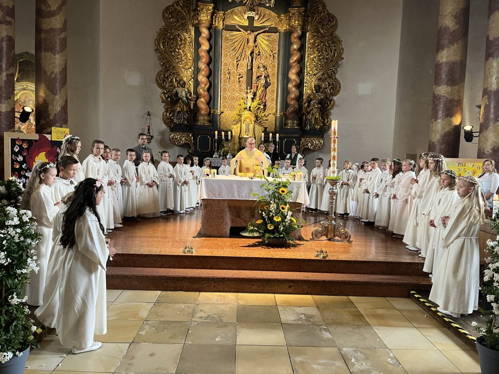 Nachdem die Kommunionkinder schon in der Feier des Letzten Abendmahles am Gründonnerstag zum ersten mal den Leib Christi in der heiligen Kommunion empfangen haben, durfte am 18. Mai richtig groß gefeiert werden. Mit Kommunionkerze und dem weißen Taufkleid zogen die Kinder in die Vituskirche von Burglengenfeld ein. Der feierliche Gottesdienst wurde von Gemeindereferentin Bernadette Biller vorbereitet und durch den Kirchenchor St. Vitus unter der Leitung von Hubert Zaindl musikalisch gestaltet. Dekan Michael Hirmer bedankte sich am Ende des Gottesdienstes bei allen, die die Kinder auf den Empfang der Eucharistie vorbereitet hatten.