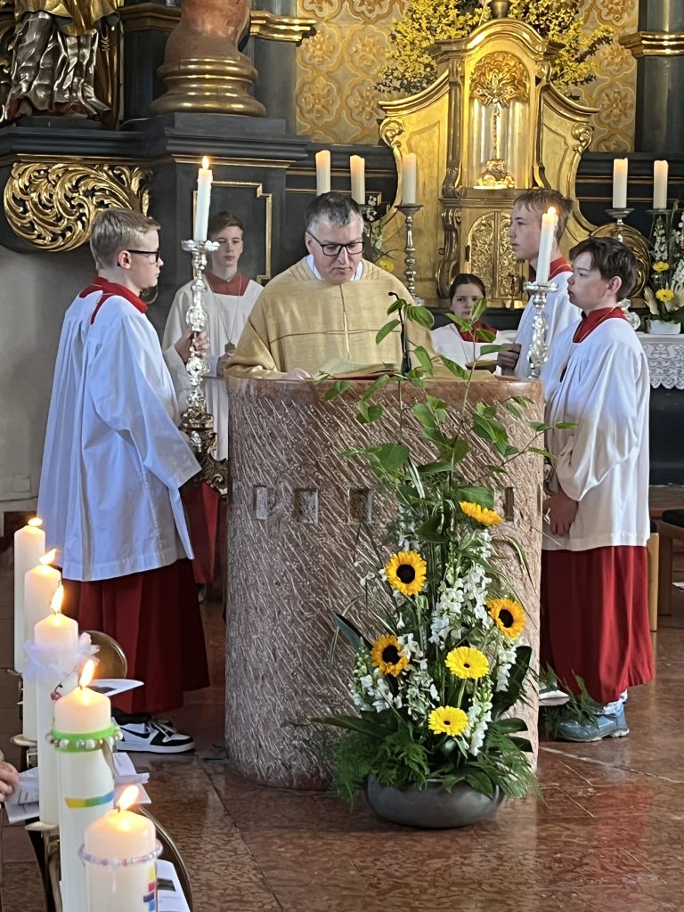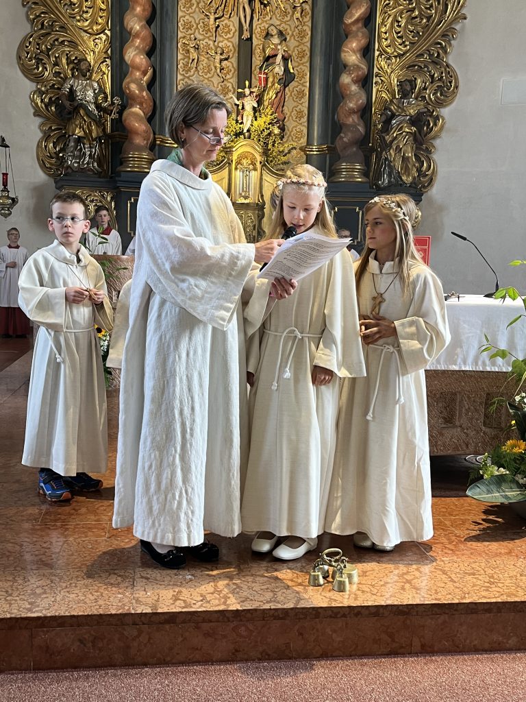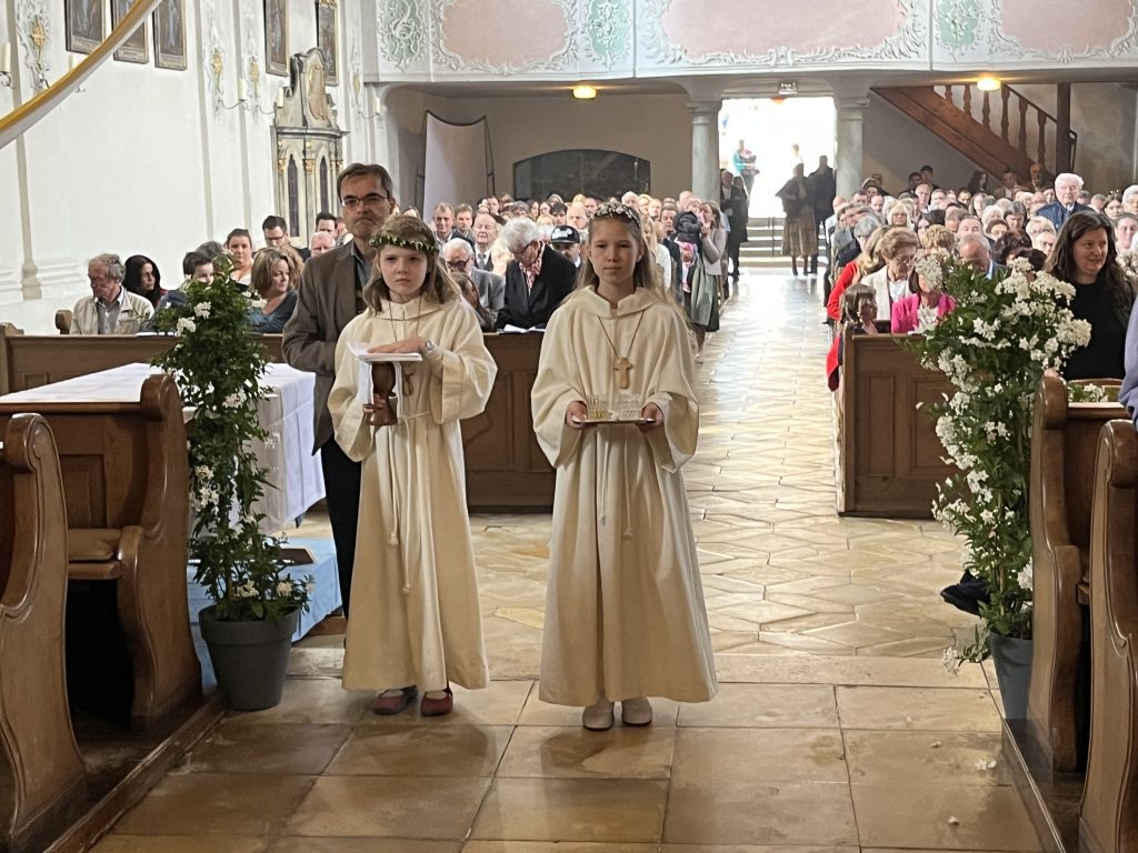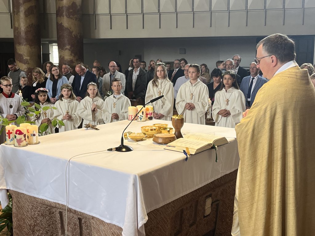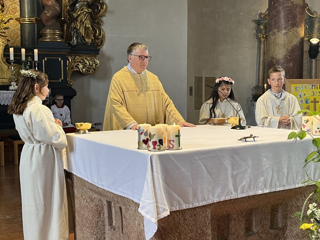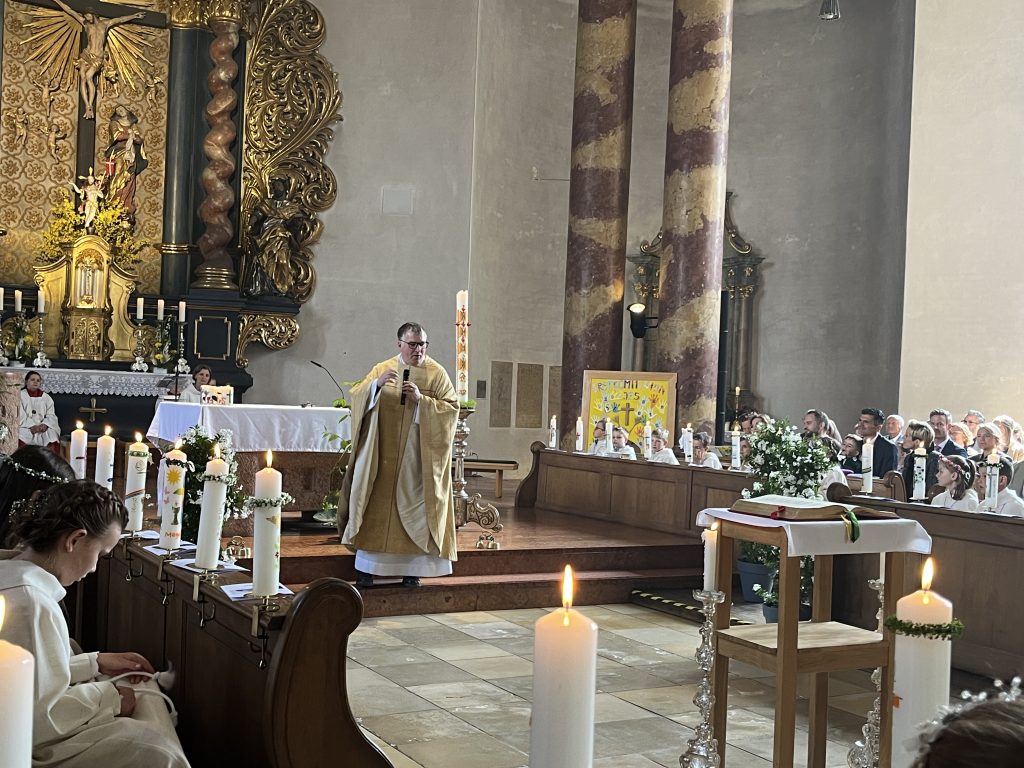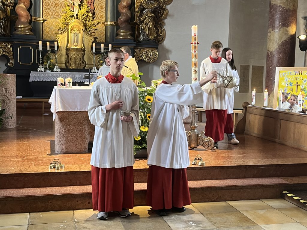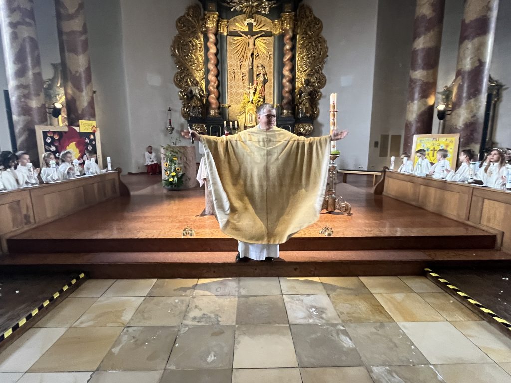 Nachdem die Kommunionkinder schon in der Feier des Letzten Abendmahles am Gründonnerstag zum ersten mal den Leib Christi in der heiligen Kommunion empfangen haben, durfte am 18. Mai richtig groß gefeiert werden. Mit Kommunionkerze und dem weißen Taufkleid zogen die Kinder in die Vituskirche von Burglengenfeld ein. Der feierliche Gottesdienst wurde von Gemeindereferentin Bernadette Biller vorbereitet und durch den Kirchenchor St. Vitus unter der Leitung von Hubert Zaindl musikalisch gestaltet. Dekan Michael Hirmer bedankte sich am Ende des Gottesdienstes bei allen, die die Kinder auf den Empfang der Eucharistie vorbereitet hatten.