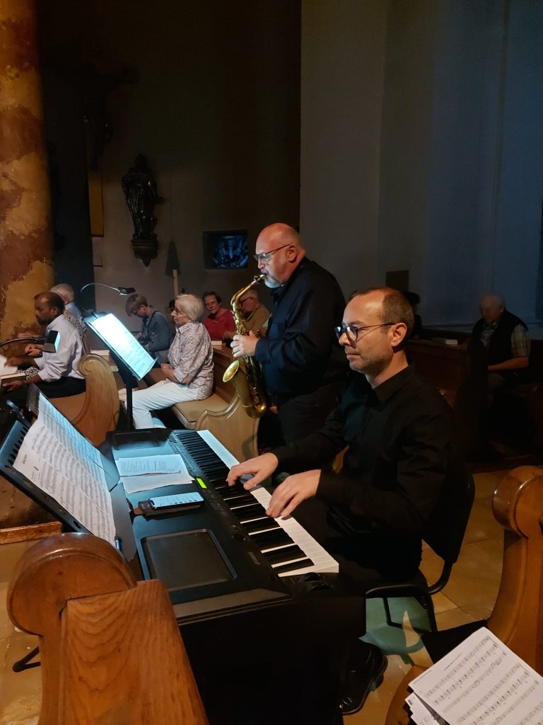 Nach meditativen Klängen von Thomas Rappl am Saxofon und Hubert Zaindl am E-Piano zeigte der neue Pfarrer der Stadtkirche Burglengenfeld Bilder eines Hochseilgartenbesuches. Sie luden zum Nachdenken und zur Reflexion auf Gott ein. „Gott lässt dich nicht fallen.“, lautete das Motto der Meditation, die in großen Buchstaben an die Altarwand projiziert wurde.
