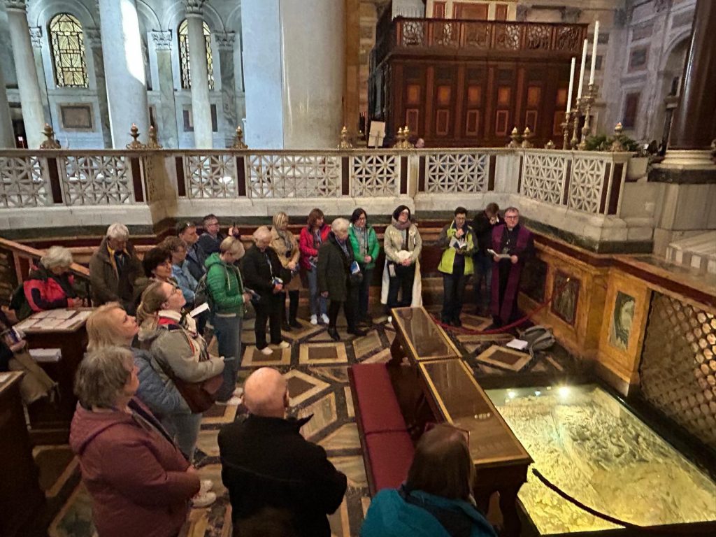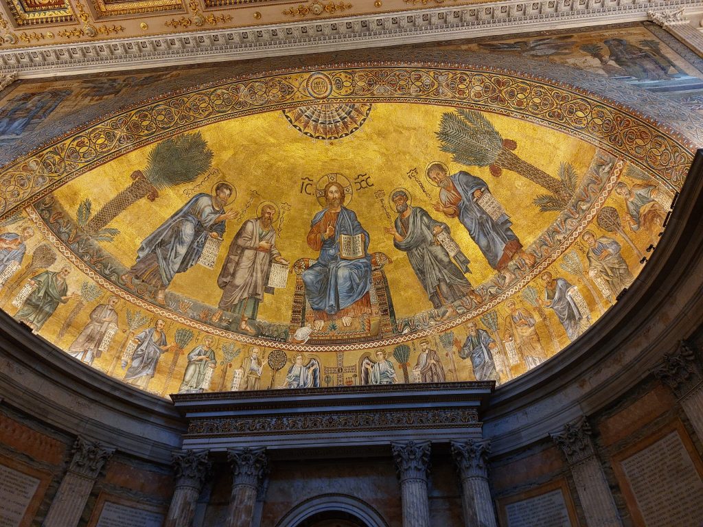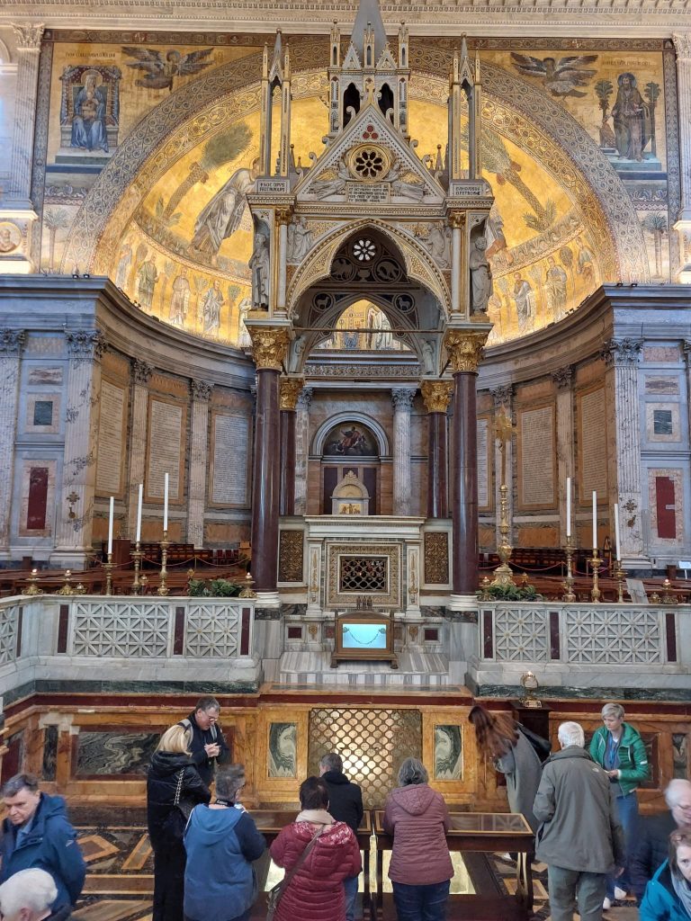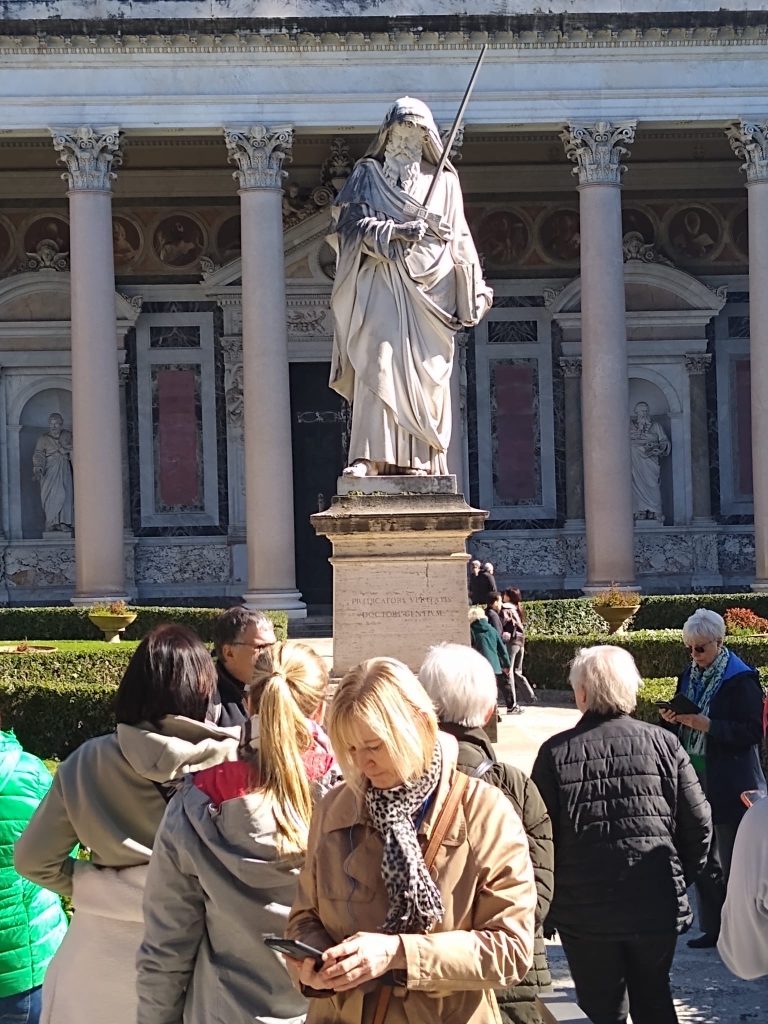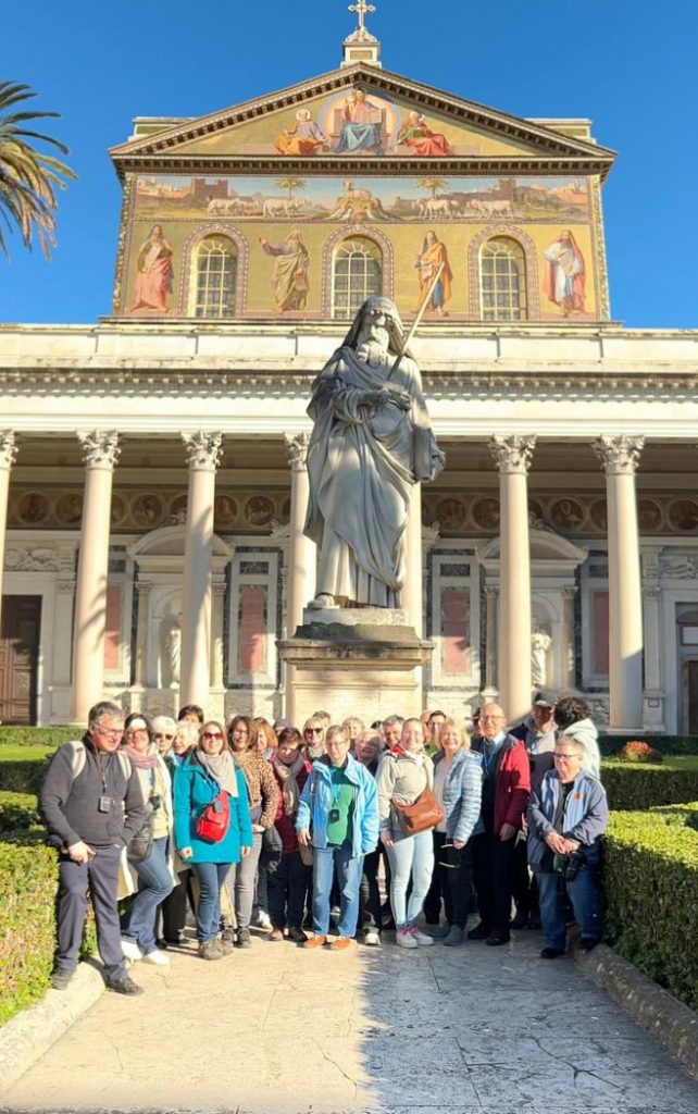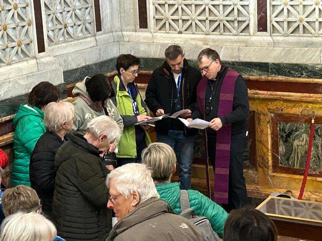 Erste Etappe, gleich nach der Ankunft, war die Basilika St. Paul vor den Mauern, die Grabeskirche des große Völkerapostels. Über zwei Stunden führte Dekan Hirmer durch die beeindruckende Basilika mit den Papstdarstellungen. Am Grab des Apostels Paulus betete die Pilgergruppe