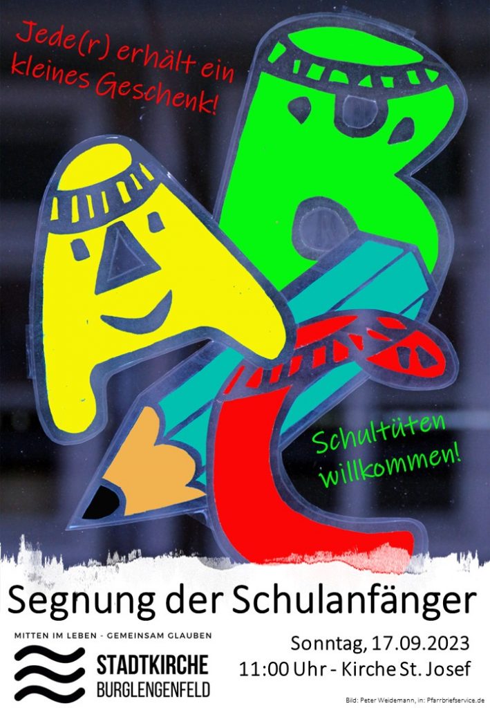 Gottes Segen für die ABC-Schützen gehört zum ersten Schultag dazu wie die Schultüte. Auch in Burglengenfeld fand eine Segnung der Schulanfänger statt. Pfarrerin Tröbs spendete mit den Seelsorger/innen der Stadtkirche in der Stadthalle den Segen zum Start in Schulleben.