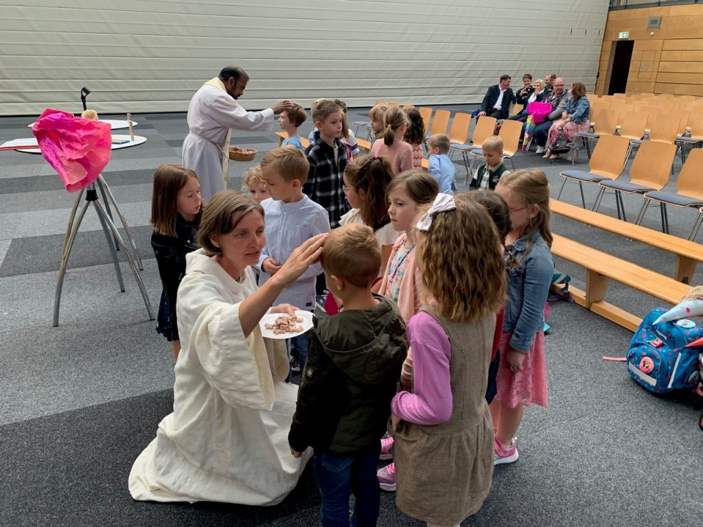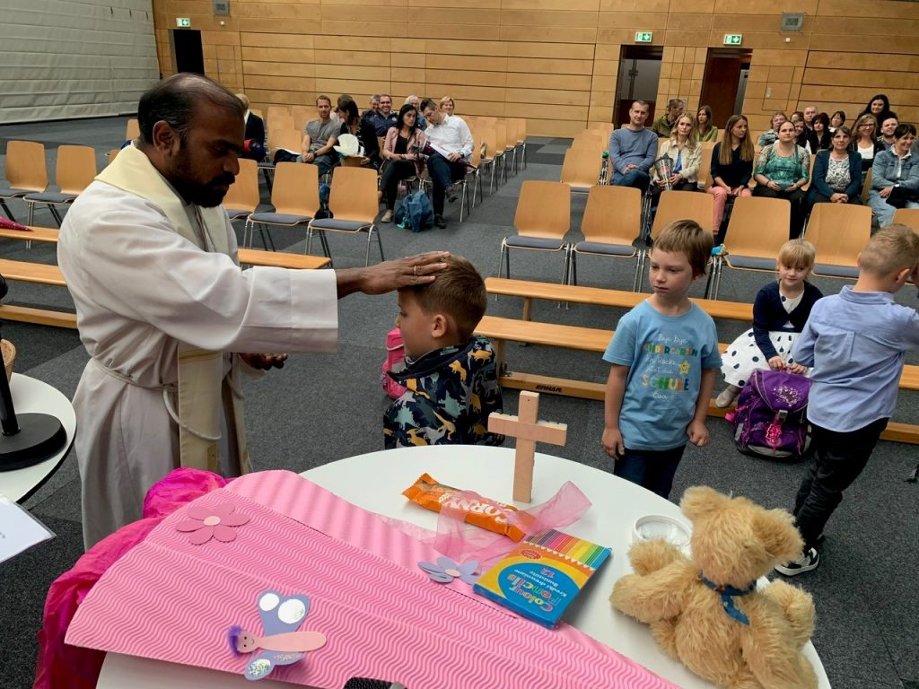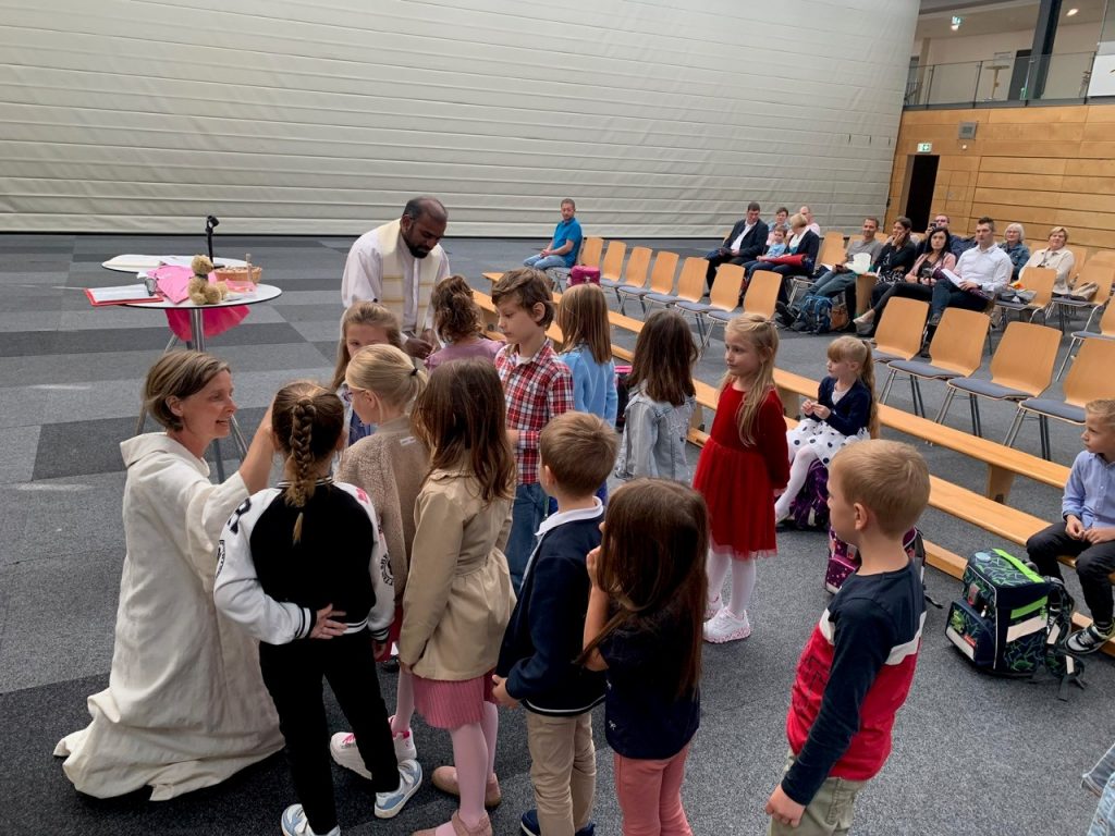 Am ersten Schultag wurden die Schulanfänger zur Segnung durch die christlichen Kirchen eingeladen. Einige Eltern hatten daran Interesse und brachten ihre ABC-Schützen in die Turnhalle, wo die Segensfeier stattfand.