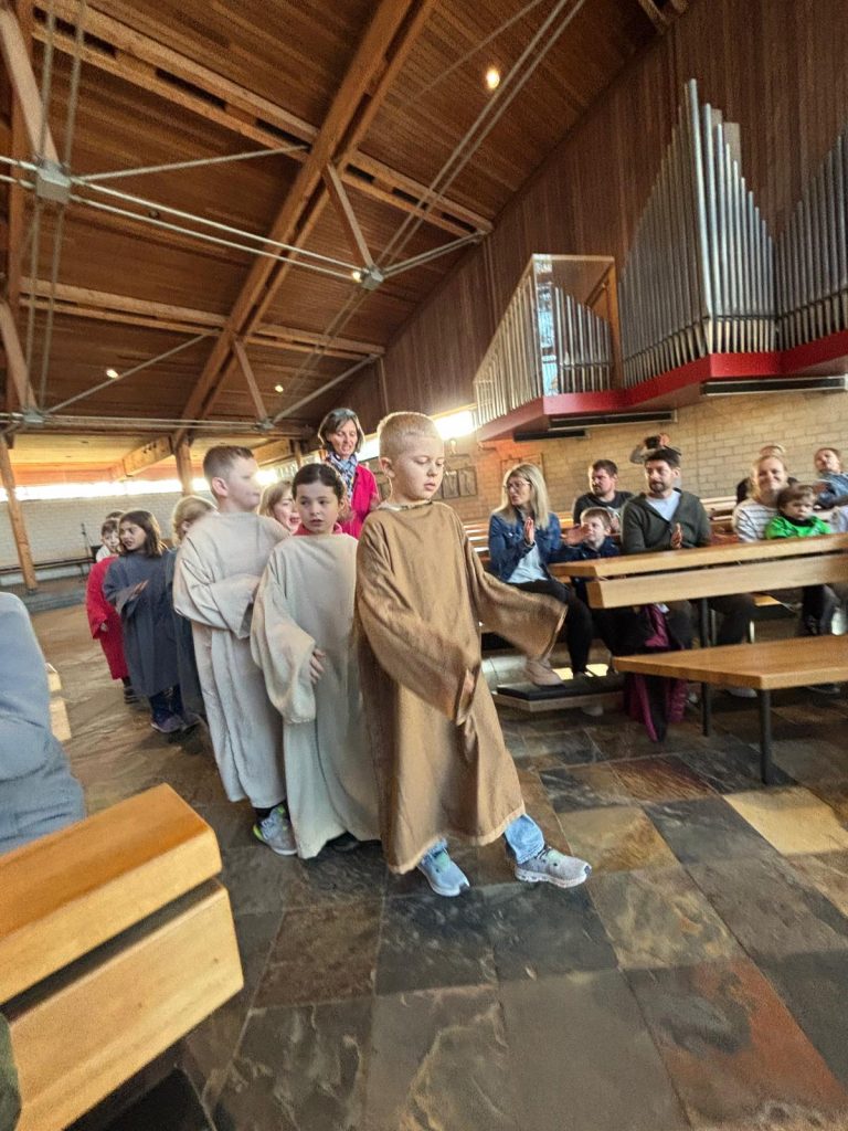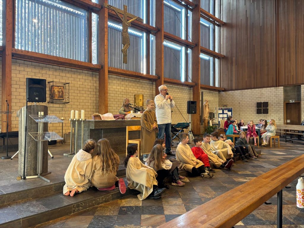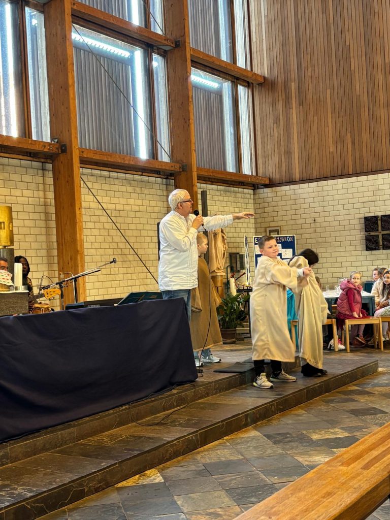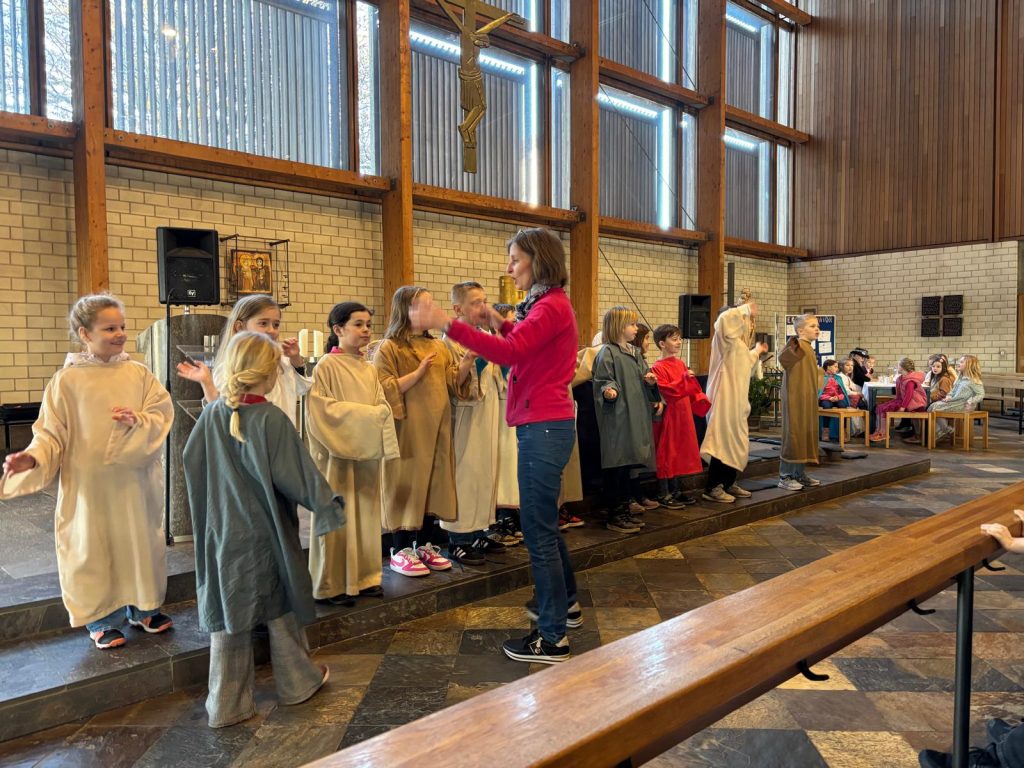 Bunt und lebendig war es am Samstagnachmittag vor dem 3. Fastensonntag in der Kirche St. Josef. Die Gruppe SHALOM aus Passau begeisterte Kinder und Erwachsene mit dem Mitmachsingspiel „Jesus, Freund der Kinder“. Biblische Geschichten von der Jüngerberufung am See Gennesareth, die Hochzeit von Kana, die Heilung eines Gelähmten und weitere Erzählungen wurden von Martin Göth, dem Leiter der Musikgruppe lebendig erzählt. Die Kinder schlüpften in die Rollen der biblischen Personen und spielten die Handlungen begeistert mit.