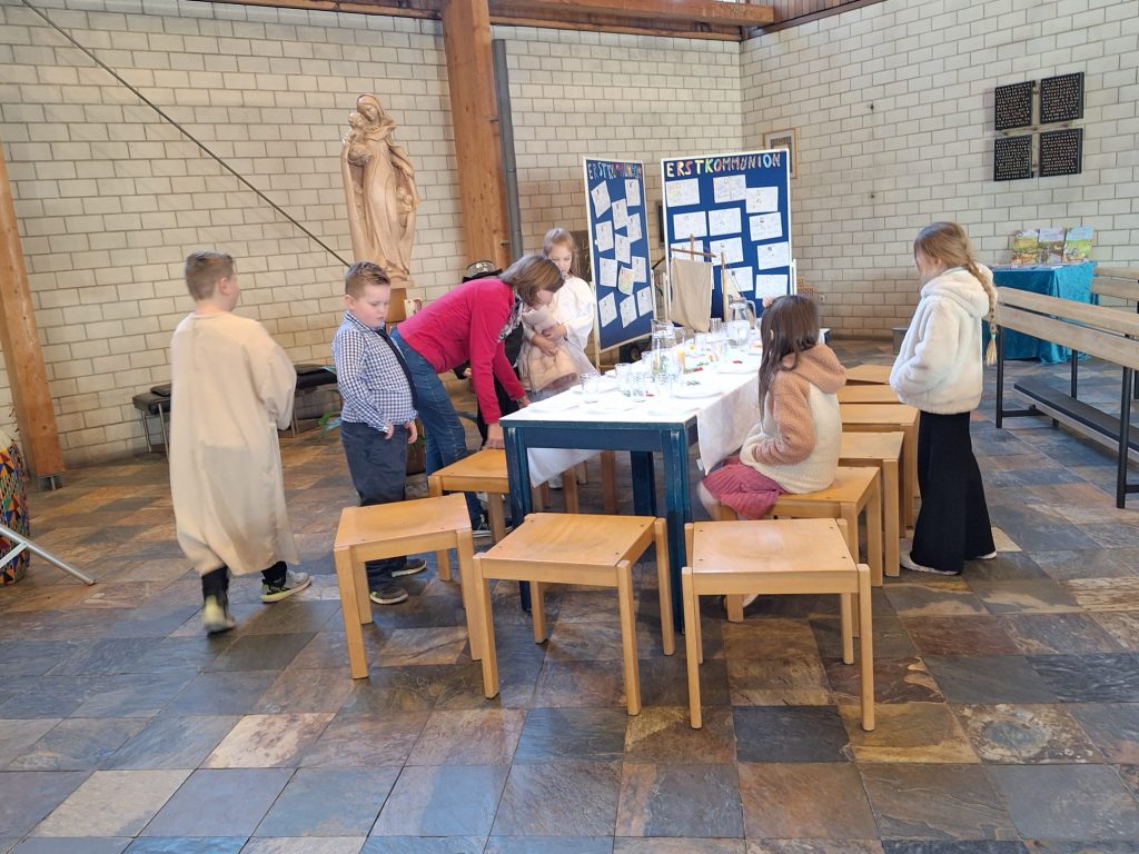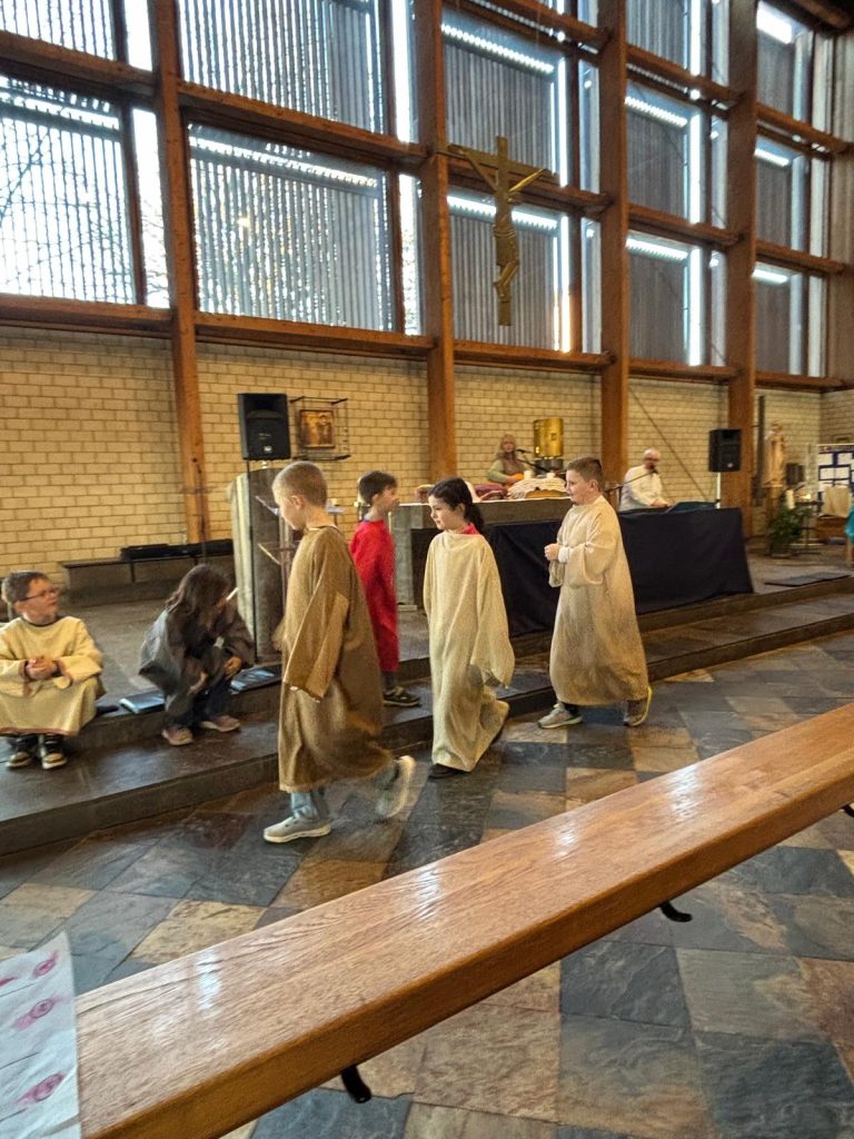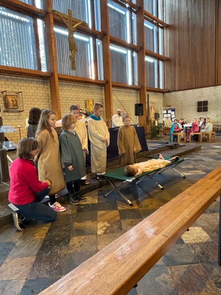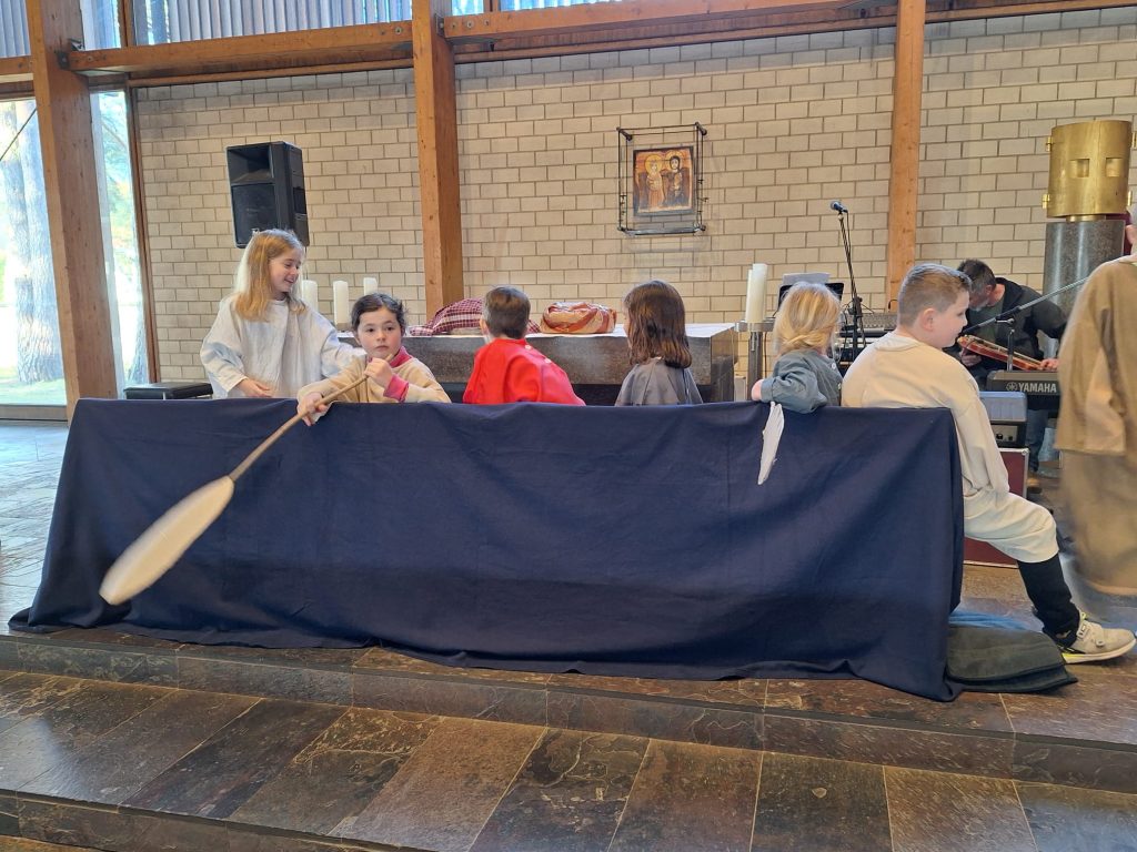 Bunt und lebendig war es am Samstagnachmittag vor dem 3. Fastensonntag in der Kirche St. Josef. Die Gruppe SHALOM aus Passau begeisterte Kinder und Erwachsene mit dem Mitmachsingspiel „Jesus, Freund der Kinder“. Biblische Geschichten von der Jüngerberufung am See Gennesareth, die Hochzeit von Kana, die Heilung eines Gelähmten und weitere Erzählungen wurden von Martin Göth, dem Leiter der Musikgruppe lebendig erzählt. Die Kinder schlüpften in die Rollen der biblischen Personen und spielten die Handlungen begeistert mit.