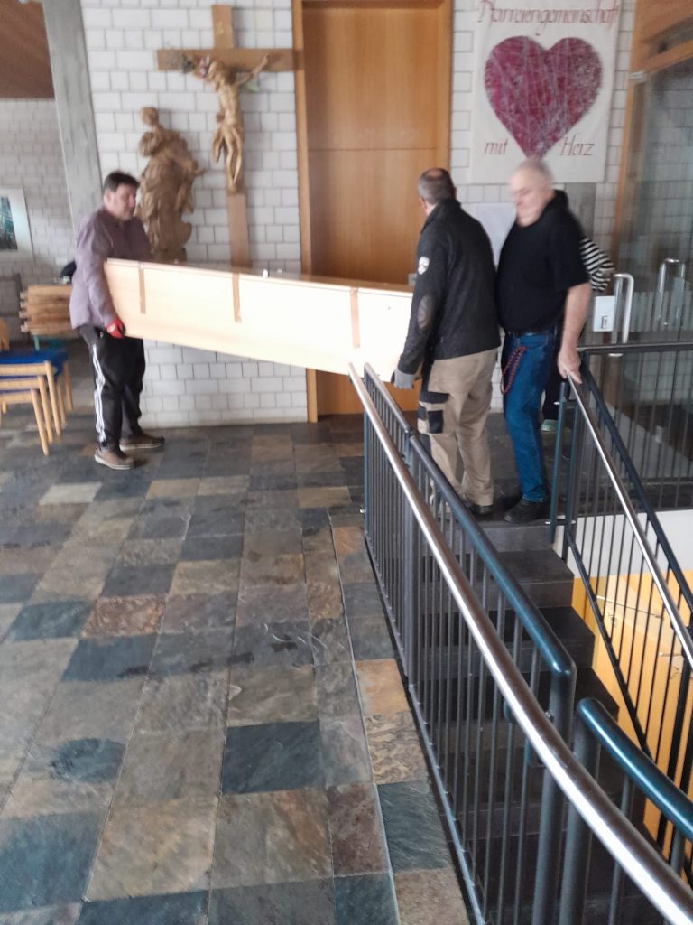 Letzten Samstag organisierte der Frauenbund einen Umzug von St. Michael ins Pastoralzentrum St. Josef. Nach der Räumung des FB Zimmers im Januar standen jetzt die Schränke, Tische und Stühle zum Transport an. Unter tatkräftiger Unterstützung der Frauenbund-Männer: