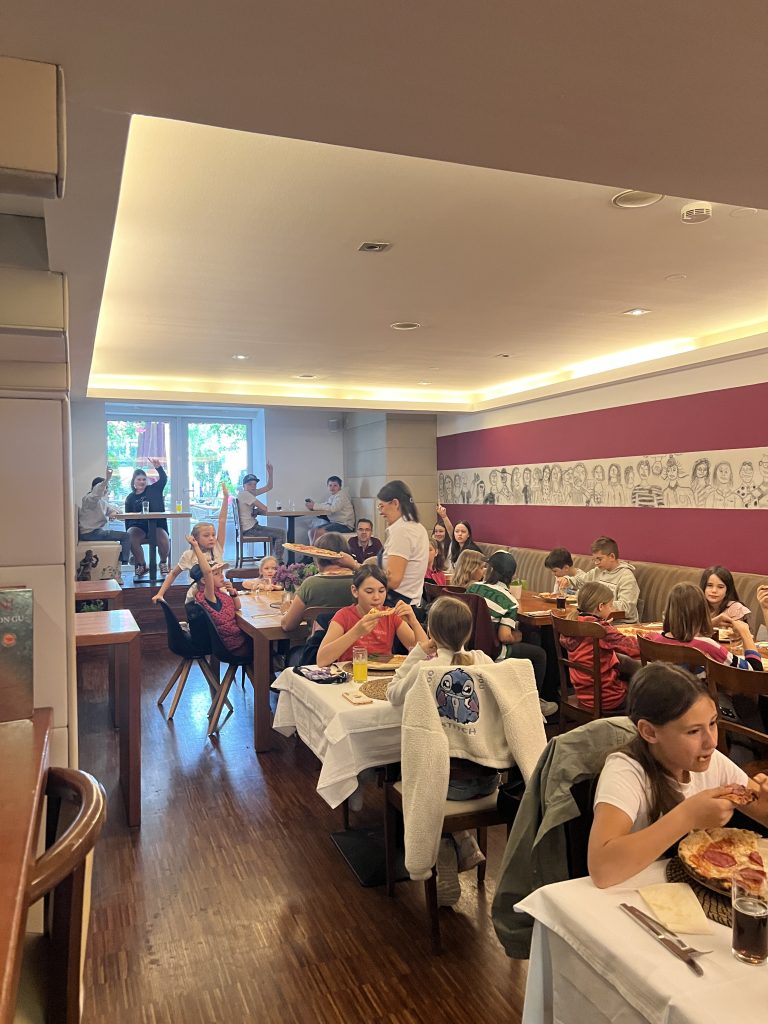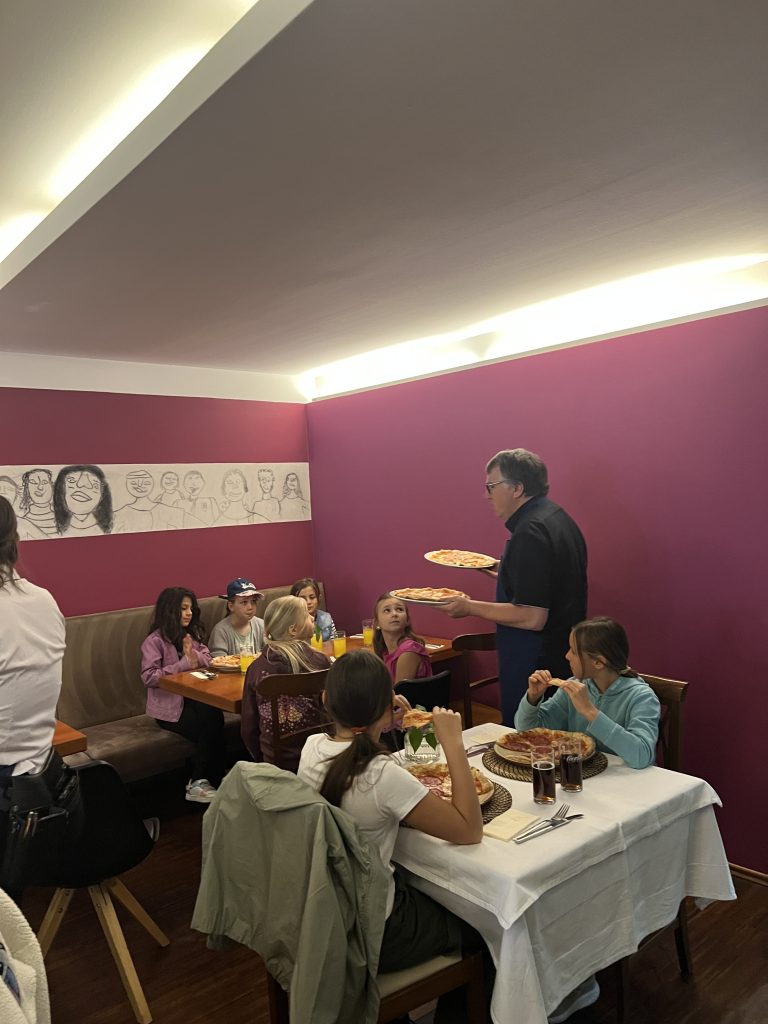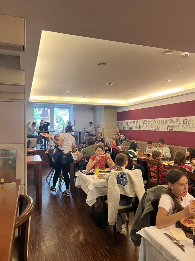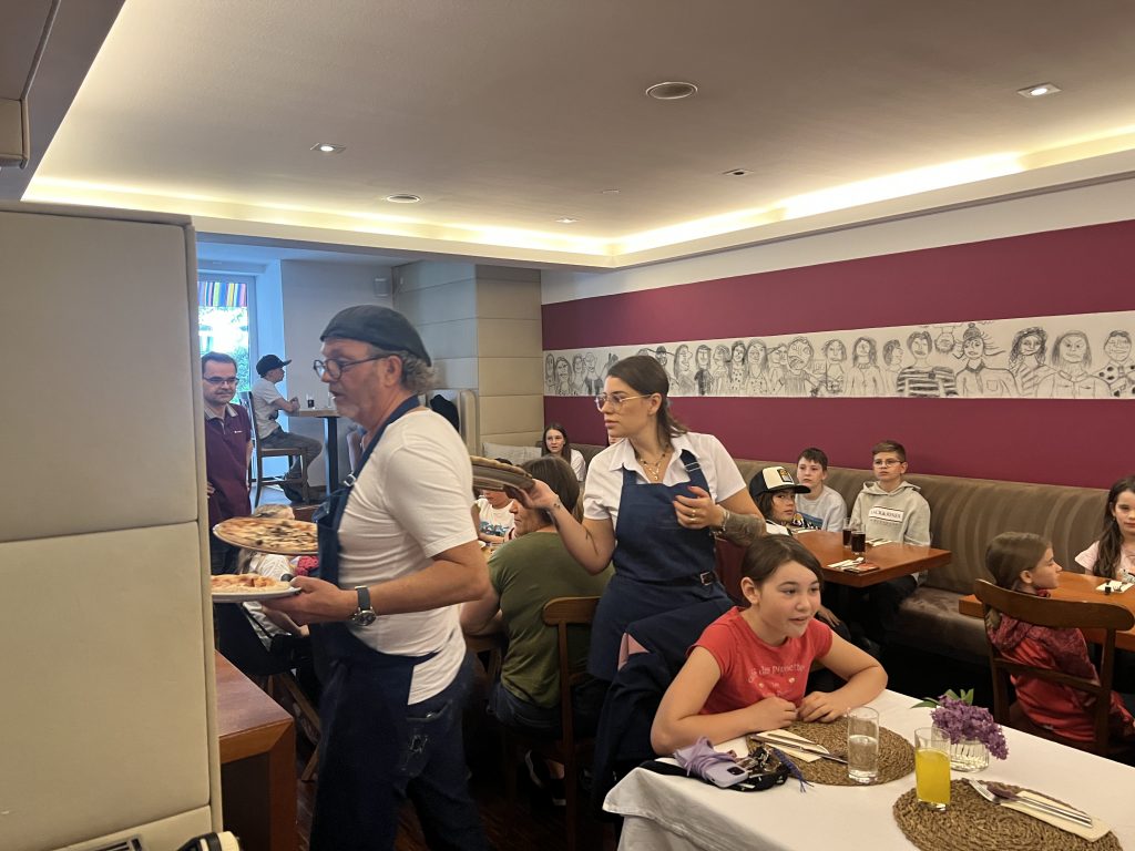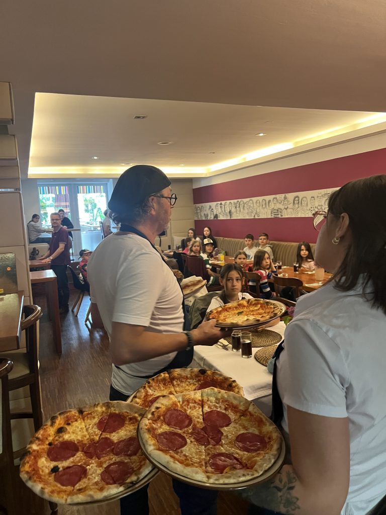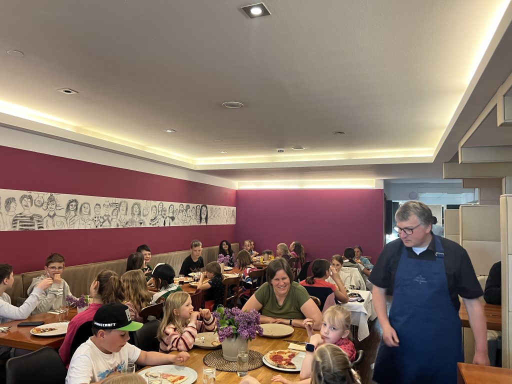 Am ersten Maisamstag war die Trattoria Aroma am Burglengenfelder Marktplatz voll mit Sternsingerinnen und Sternsinger gefüllt. Grund hierfür war, dass die Gastwirtfamilie Dimai die Kinder und Jugendlichen zum großen Pizza-Danke-Essen eingeladen hat. Gemeinsam mit Pastoralreferent Konrad Kraus waren die Sternsinger zahlreich der Einladung gefolgt. Auch Pfarrer Michael Hirmer war mit dabei, den Sanzio Dimai gleich als Bedienung mit einspannte. – Danke, lieber Sanzio, für die Einladung 🙂 – wir kommen gerne wieder 😉