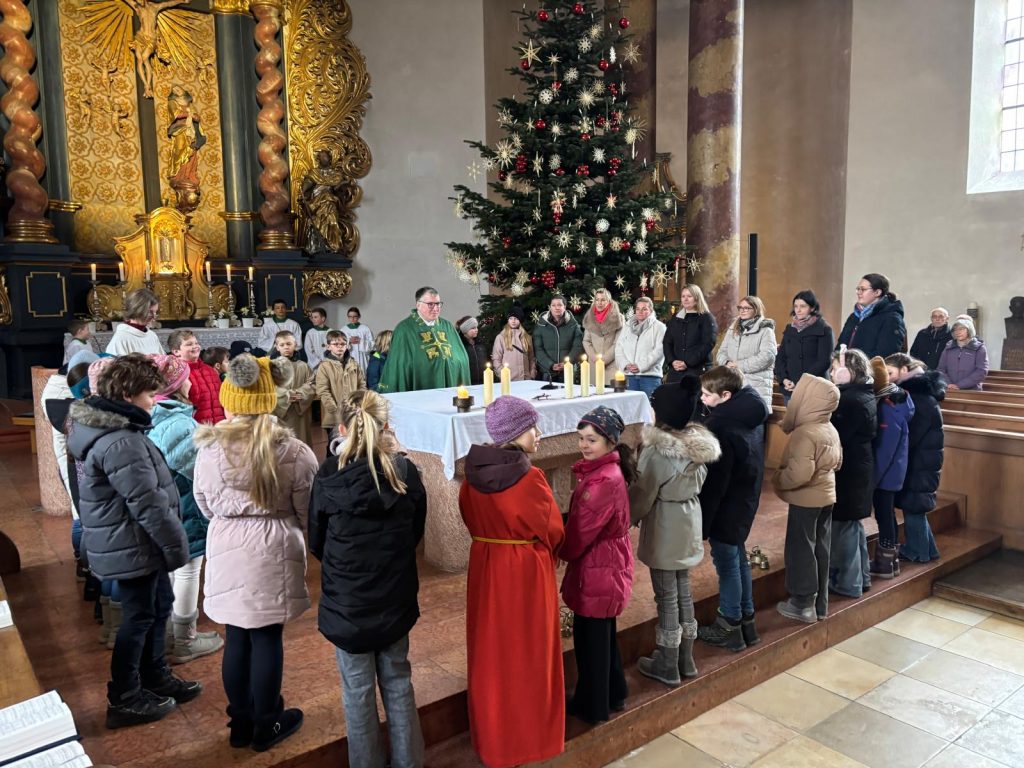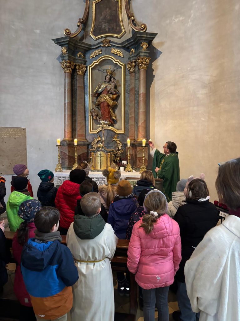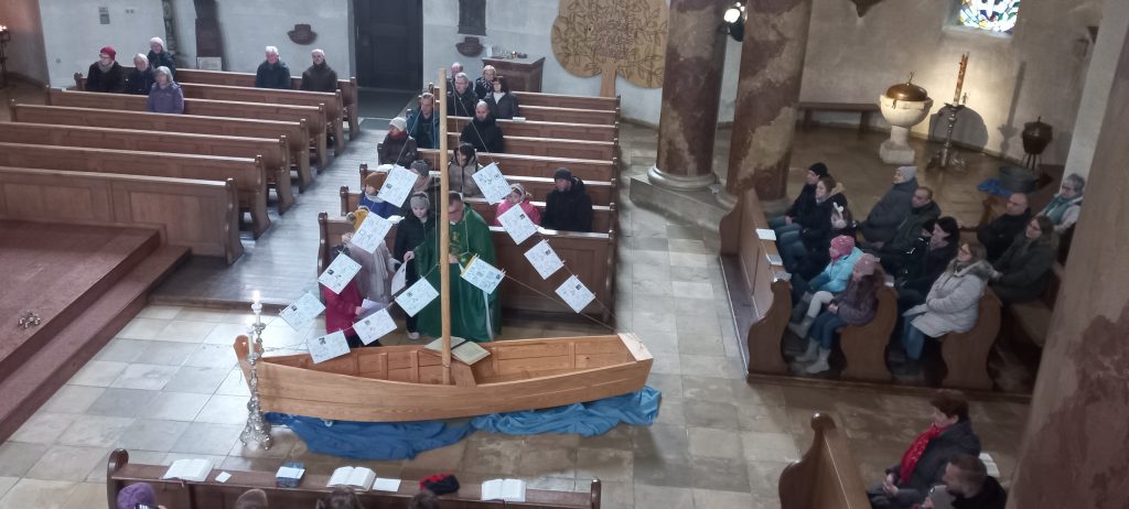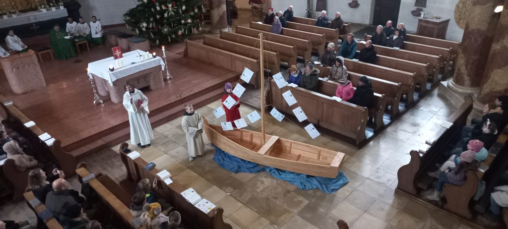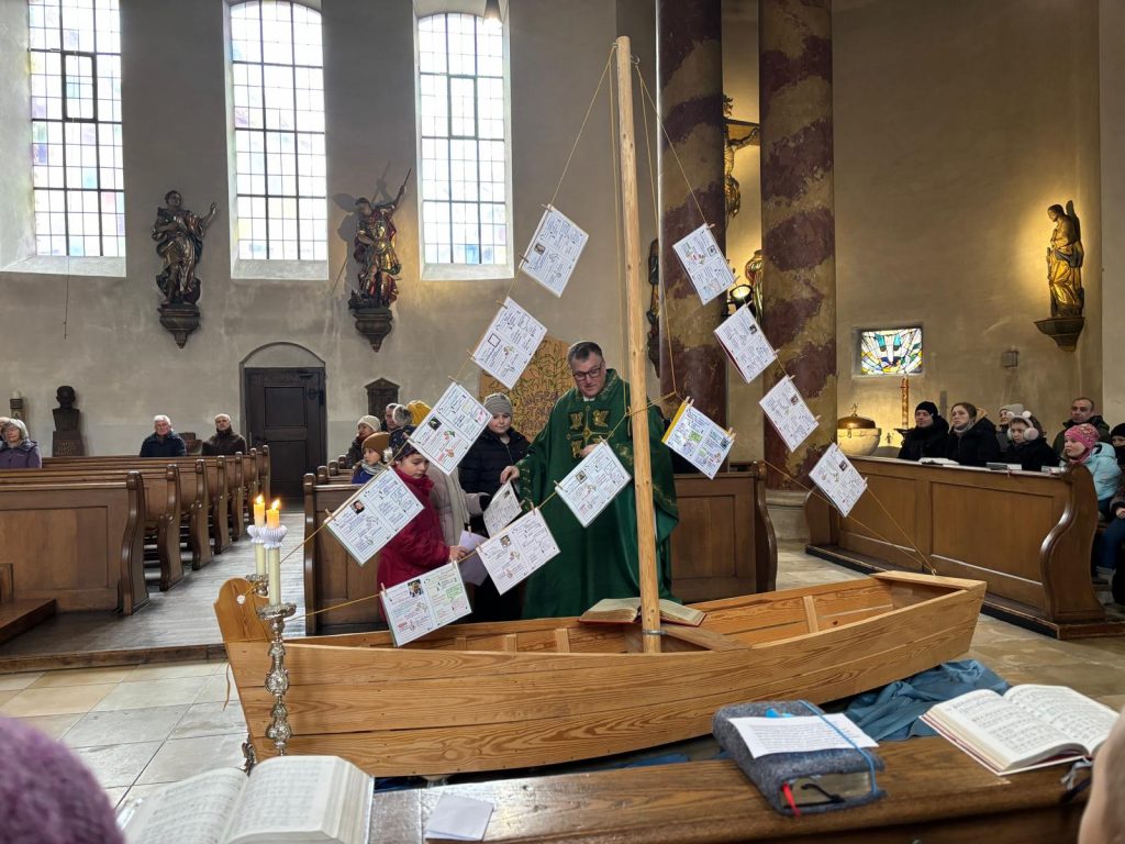 Mit Freude versammelten sich die Kommunionkinder, die in der Pfarrkirche St. Vitus Kommunion feiern, zum Vorstellungsgottesdienst. Stellvertretend stellten sich drei Mädchen mit ihrem Steckbrief vor und zwei Kinder führten ins Evangelium ein, die Berufung der Jünger am See Gennesareth. Eindrücklich stand ein Boot, geschmückt mit den Steckbriefen der Kommuinonkinder, in der Mitte. Die Freundschaft mit Jesus wächst ein Leben lang; was einem wichtig ist, dafür nimmt man sich Zeit, betonte Gemeindereferentin Bernadette Biller in der Katechese. Um den Altar versammelt sprach Pfarrer Michael Hirmer ein Segensgebet über Kinder und Tischmütter; diese erhielten die das Licht, das in den Tischgruppen zeichenhaft für Jesus brennen wird.
