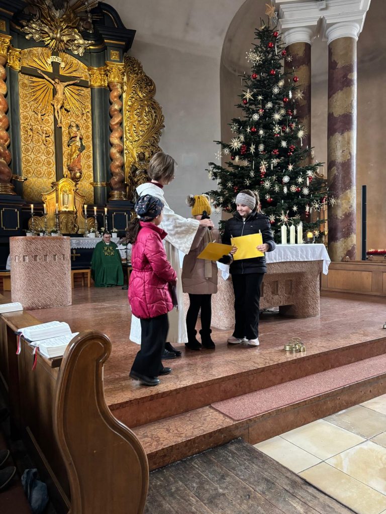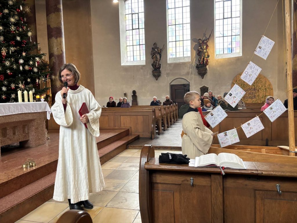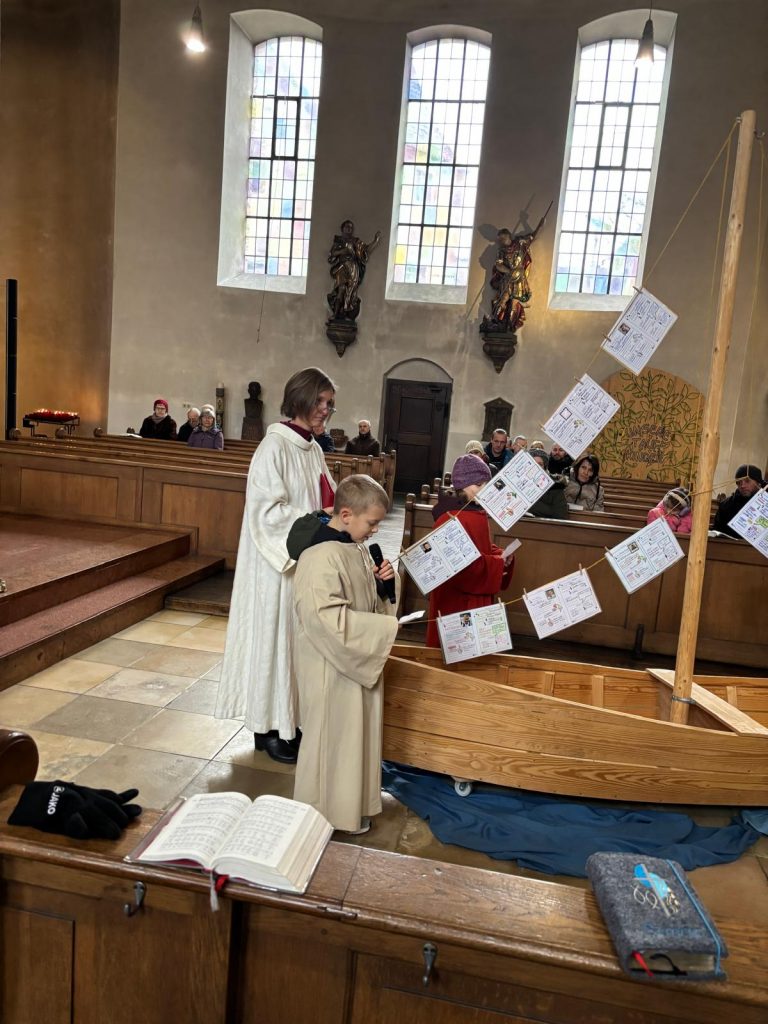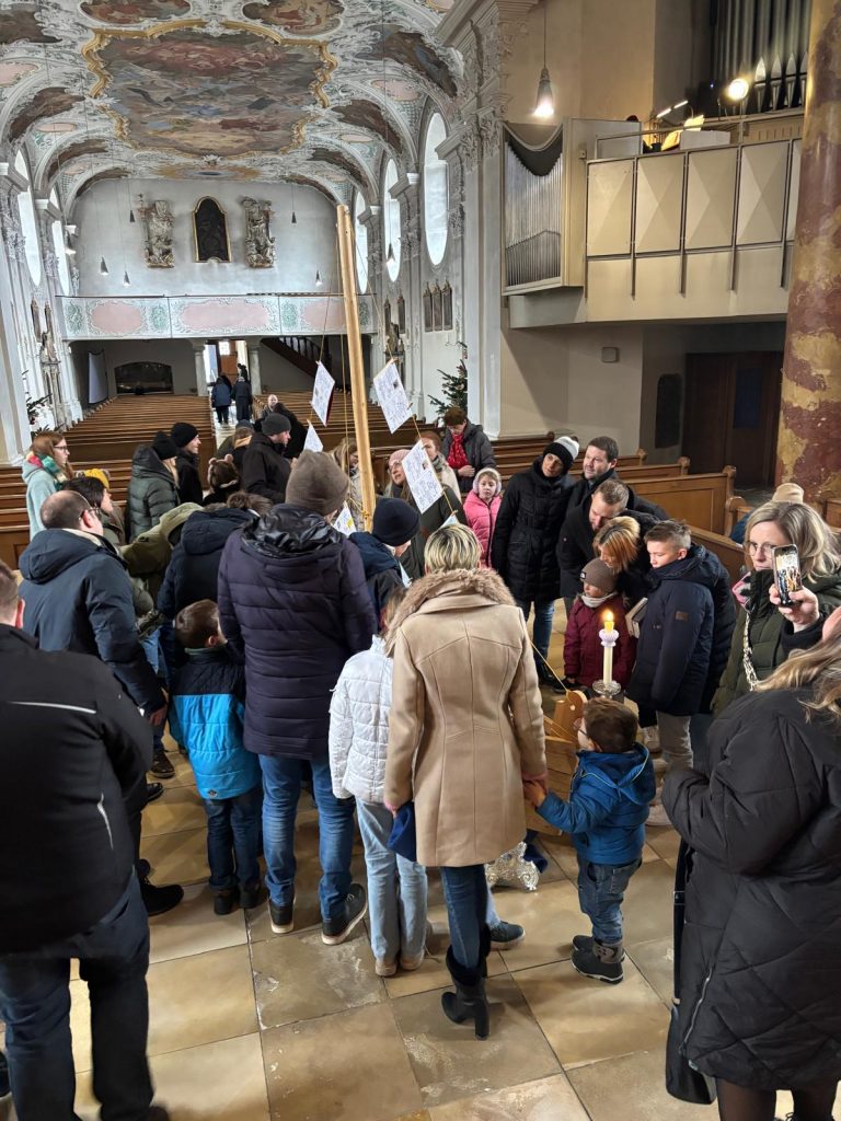 Mit Freude versammelten sich die Kommunionkinder, die in der Pfarrkirche St. Vitus Kommunion feiern, zum Vorstellungsgottesdienst. Stellvertretend stellten sich drei Mädchen mit ihrem Steckbrief vor und zwei Kinder führten ins Evangelium ein, die Berufung der Jünger am See Gennesareth. Eindrücklich stand ein Boot, geschmückt mit den Steckbriefen der Kommuinonkinder, in der Mitte. Die Freundschaft mit Jesus wächst ein Leben lang; was einem wichtig ist, dafür nimmt man sich Zeit, betonte Gemeindereferentin Bernadette Biller in der Katechese. Um den Altar versammelt sprach Pfarrer Michael Hirmer ein Segensgebet über Kinder und Tischmütter; diese erhielten die das Licht, das in den Tischgruppen zeichenhaft für Jesus brennen wird.