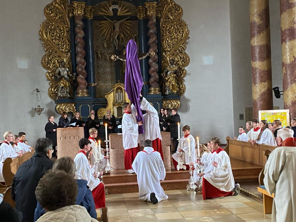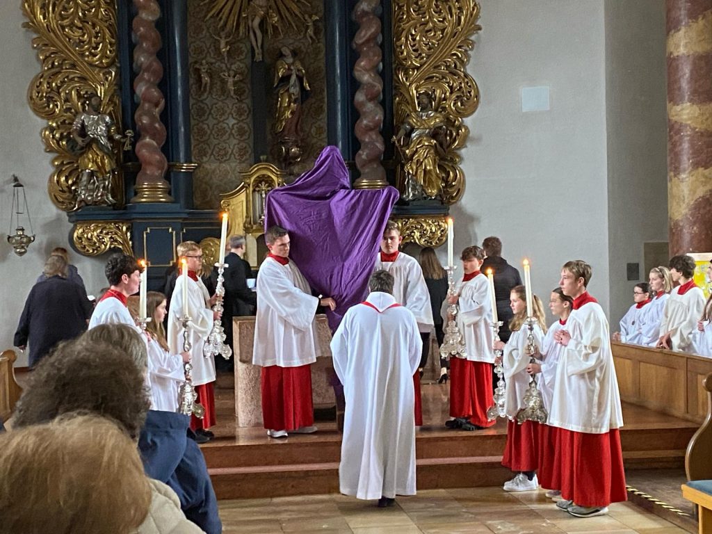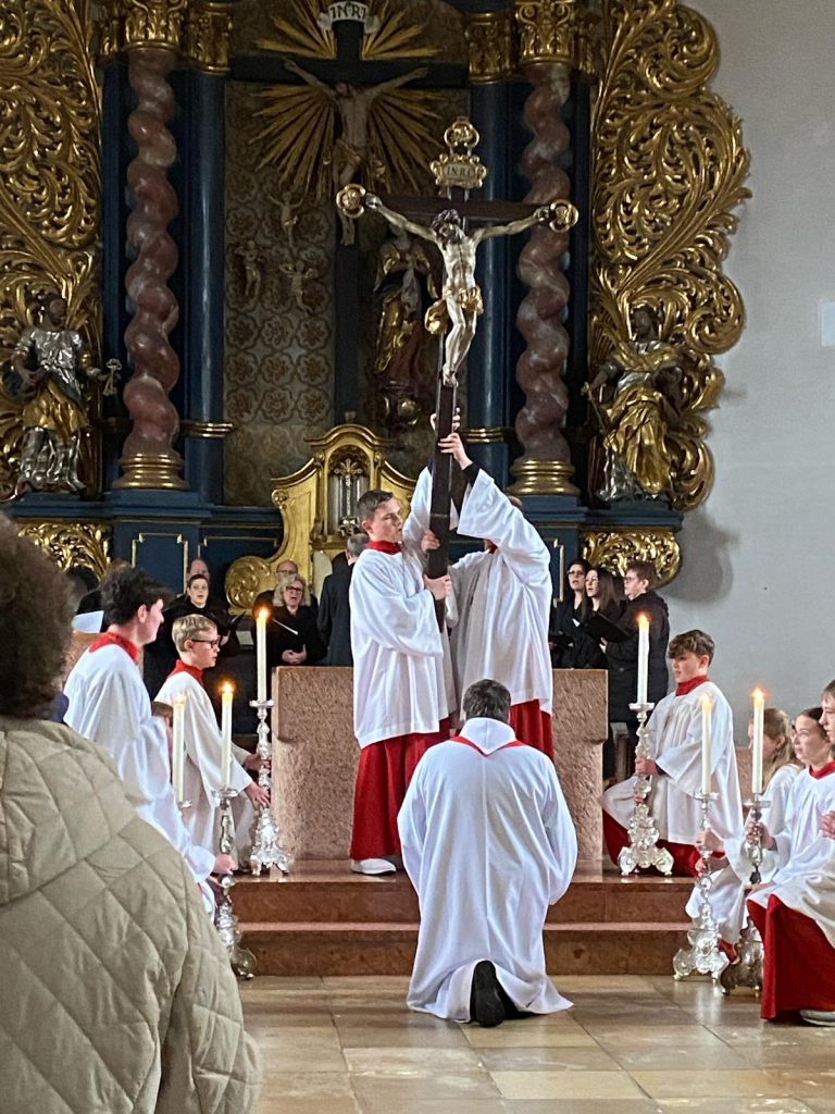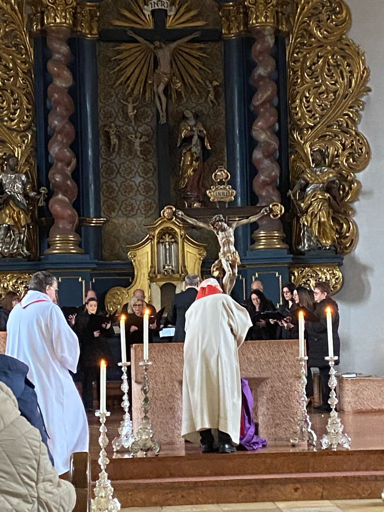 „Seht den Herr, der am Kreuz gehangen: Das Heil der Welt!“ – In seiner Schlichtheit ist die Karfreitagsliturgie ein wunderschöner Gottesdienst. Vor allem wenn diese durch das Vokalensemble der Kirchenmusik St. Vitus gestaltet und untermalt wird. Das Kreuz Jesu Christi wird vor dem Altar enthüllt. Alle Mitfeiernden kommen und beten den gekreuzigten Herrn an.