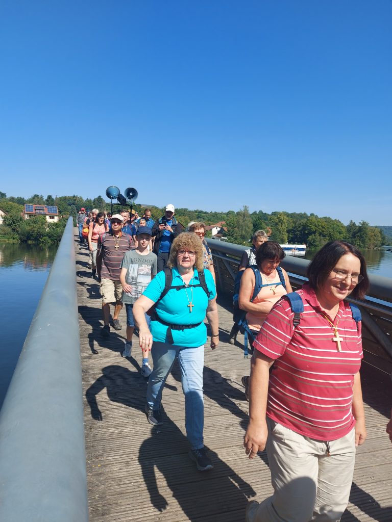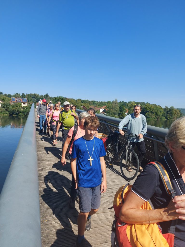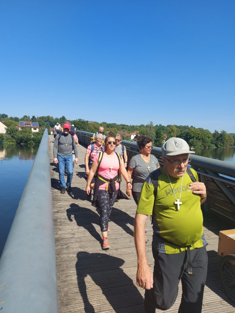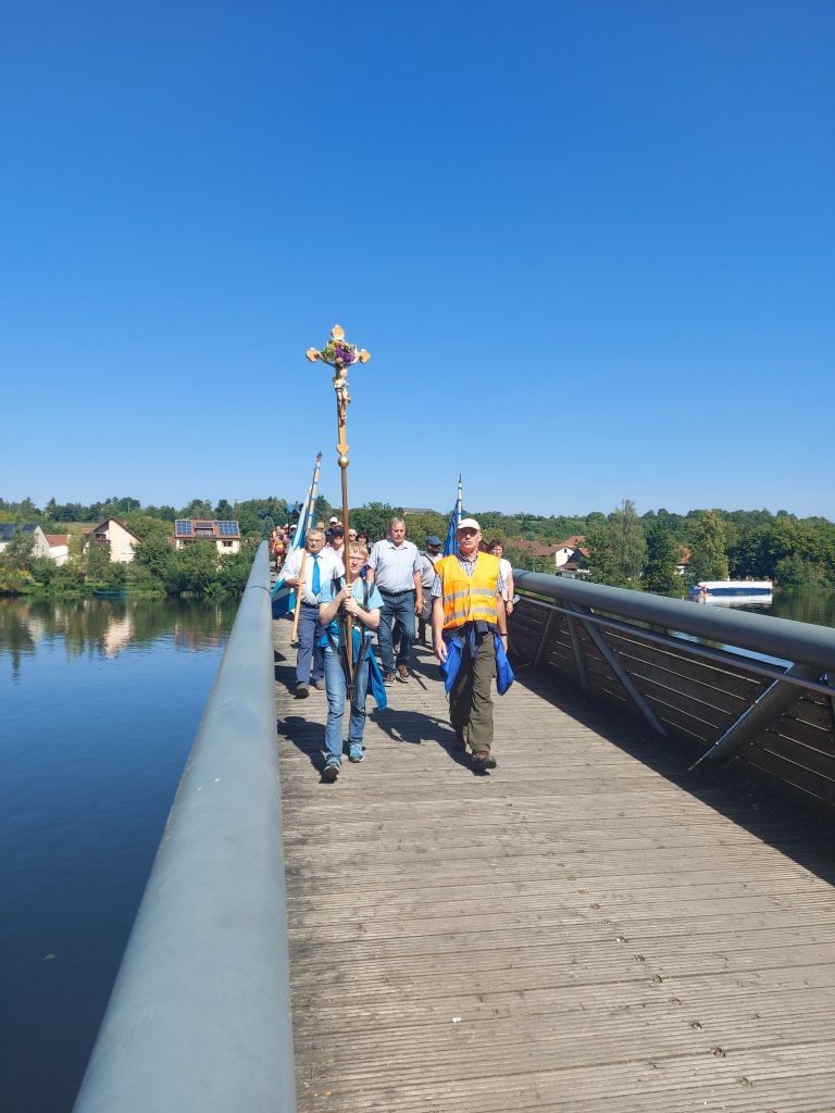 Der Pilgerweg von Burglengenfeld nach Maria Ort ist wohl eines der schönsten in der südlichen Oberpfalz. „Wir beten in der Natur und mit der Natur.“, freut sich eine Pilgerin, „hier kann ich Gott ganz nahe sein.“ So zogen die Wallfahrer durch Wälder und Wiesen, genossen einen wunderschönen Sonnenaufgang und konnten so manches Loblied auf den Schöpfergott singen. Erkennbar waren die Burglengenfelder Wallfahrer an ihrem hölzernen Pilgerkreuz, da jeder stolz um den Hals trug. Mit dabei waren auch zwei Banner der Marianischen Männerkongregation (MMC), die mit den Pilger über die Naabbrücke zum Marienheiligtum zogen.