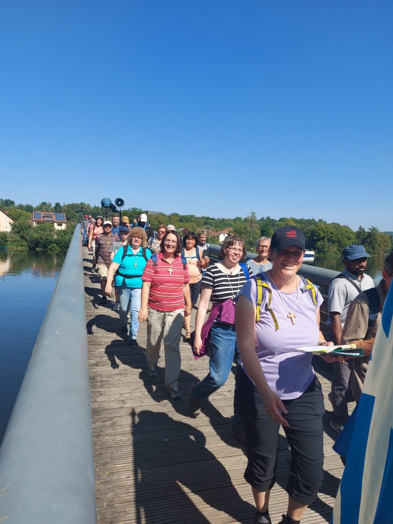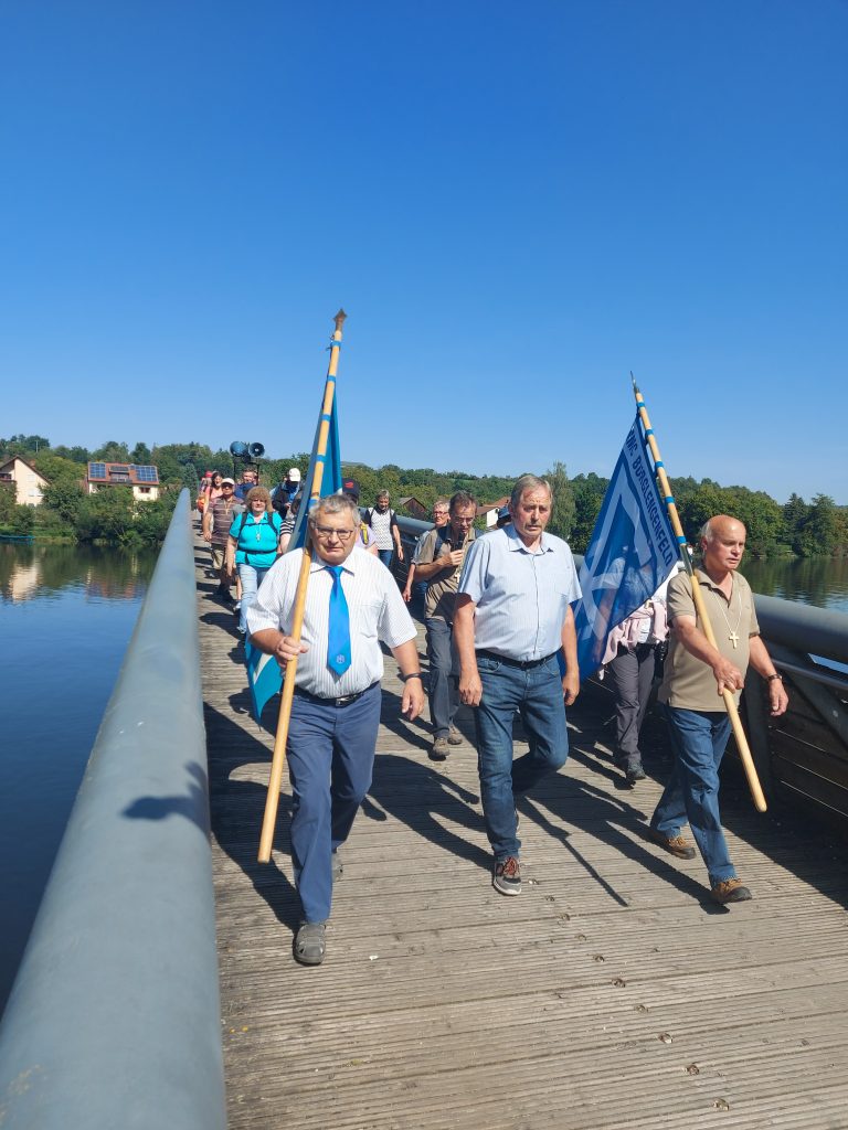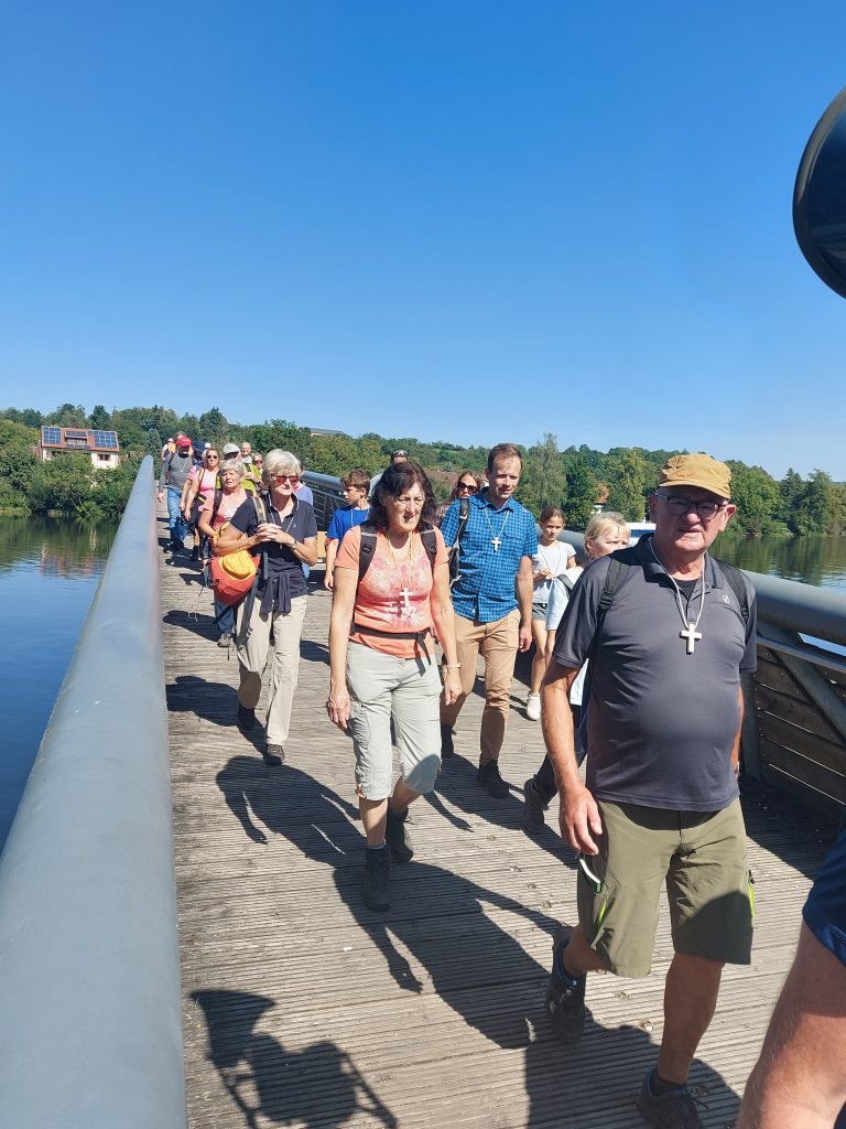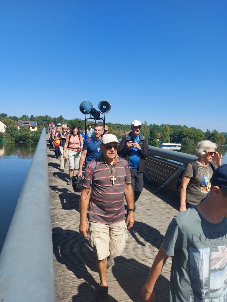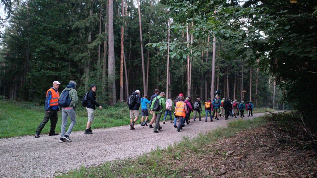 Der Pilgerweg von Burglengenfeld nach Maria Ort ist wohl eines der schönsten in der südlichen Oberpfalz. „Wir beten in der Natur und mit der Natur.“, freut sich eine Pilgerin, „hier kann ich Gott ganz nahe sein.“ So zogen die Wallfahrer durch Wälder und Wiesen, genossen einen wunderschönen Sonnenaufgang und konnten so manches Loblied auf den Schöpfergott singen. Erkennbar waren die Burglengenfelder Wallfahrer an ihrem hölzernen Pilgerkreuz, da jeder stolz um den Hals trug. Mit dabei waren auch zwei Banner der Marianischen Männerkongregation (MMC), die mit den Pilger über die Naabbrücke zum Marienheiligtum zogen.