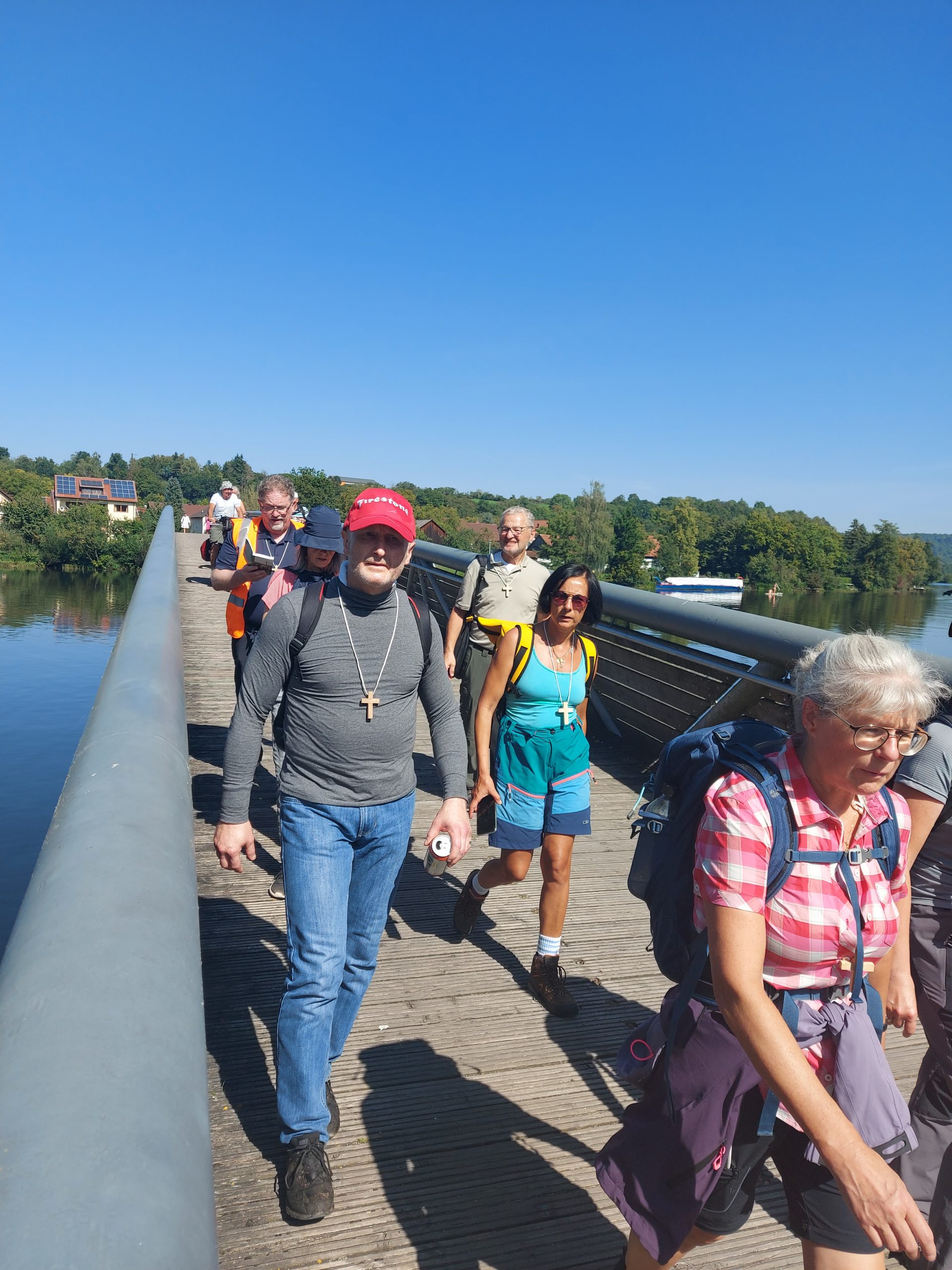 Der Pilgerweg von Burglengenfeld nach Maria Ort ist wohl eines der schönsten in der südlichen Oberpfalz. „Wir beten in der Natur und mit der Natur.“, freut sich eine Pilgerin, „hier kann ich Gott ganz nahe sein.“ So zogen die Wallfahrer durch Wälder und Wiesen, genossen einen wunderschönen Sonnenaufgang und konnten so manches Loblied auf den Schöpfergott singen. Erkennbar waren die Burglengenfelder Wallfahrer an ihrem hölzernen Pilgerkreuz, da jeder stolz um den Hals trug. Mit dabei waren auch zwei Banner der Marianischen Männerkongregation (MMC), die mit den Pilger über die Naabbrücke zum Marienheiligtum zogen.