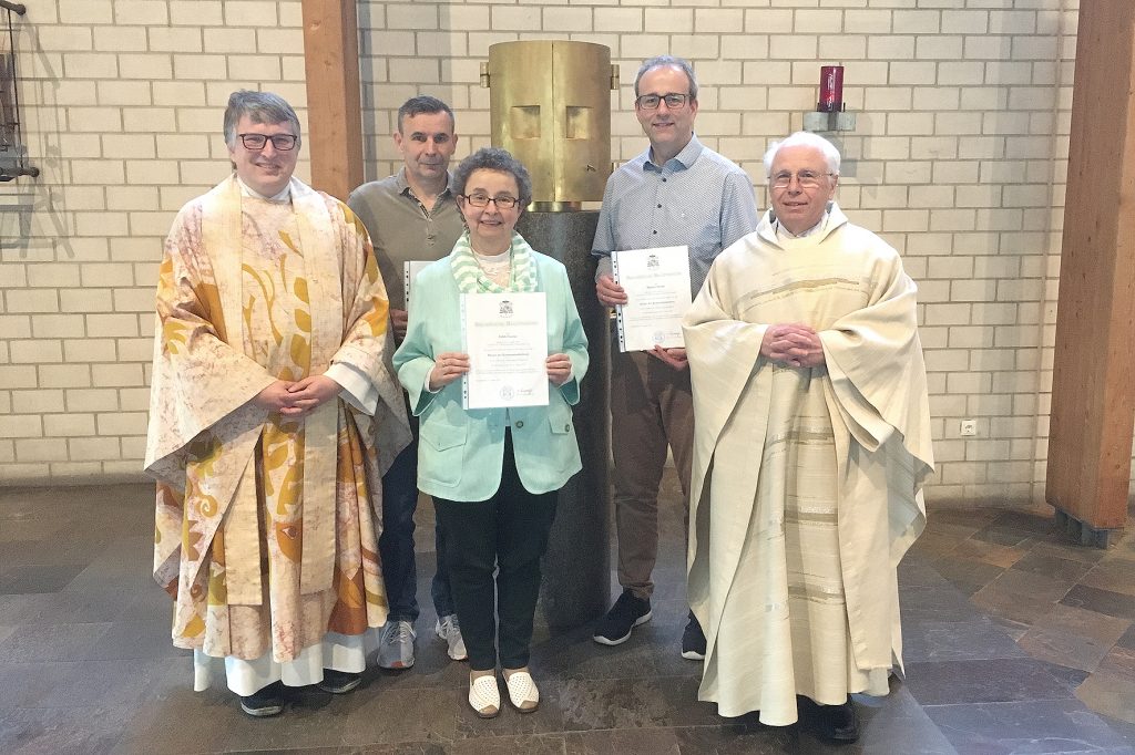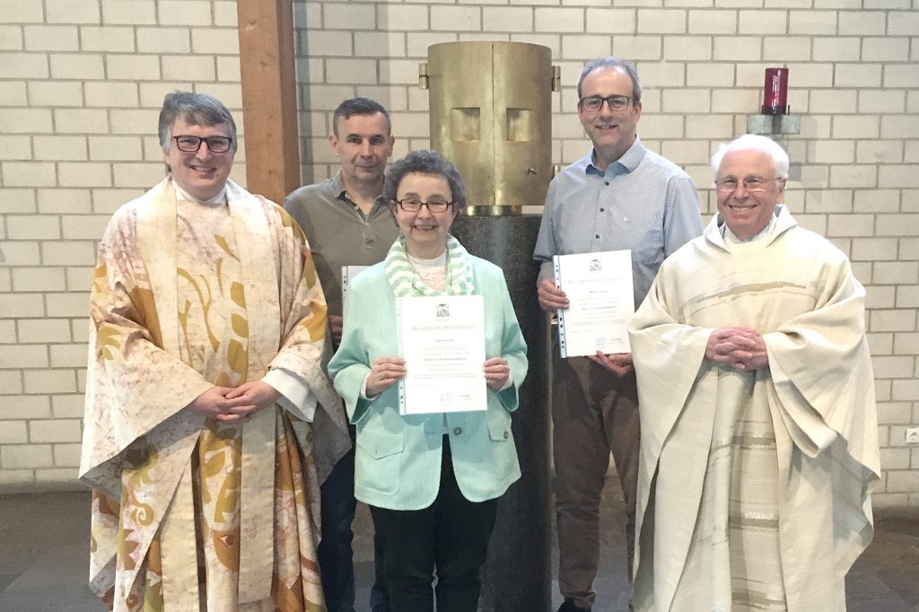 Bei einer Vorabendmesse wurden in der Stadtkirche Burglengenfeld die bischöflichen Urkunden an die neuen Kommunionhelfer übergeben. Dekan Michael Hirmer und Pfarrer i.R. Thomas Senft freuten sich, dass Edith Fischer, Markus Heider und Markus Baumann diesen Dienst in St. Josef und St. Vitus übernehmen. Hinzu kommt noch Alfred Leikam für die Pfarrei Dietldorf.